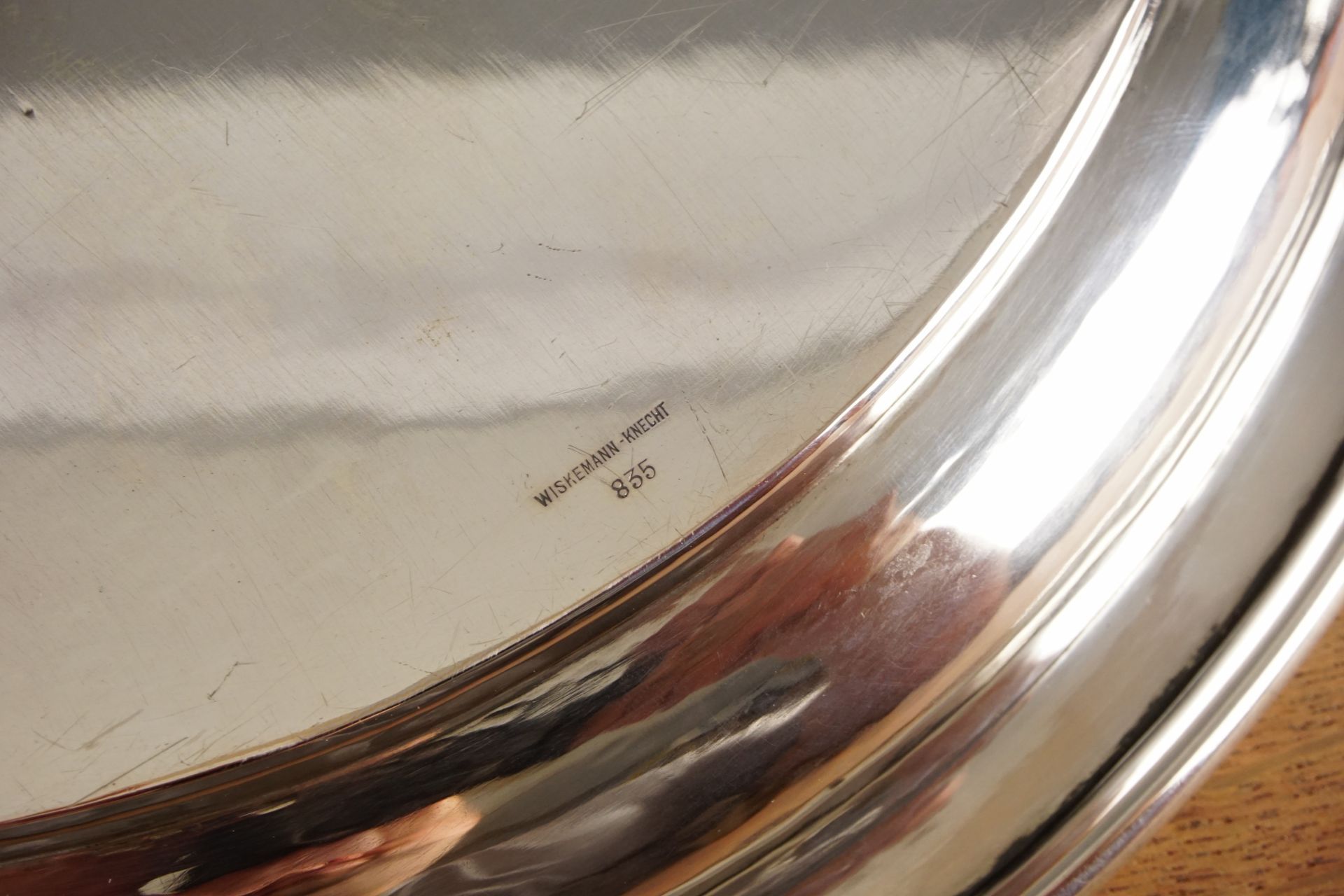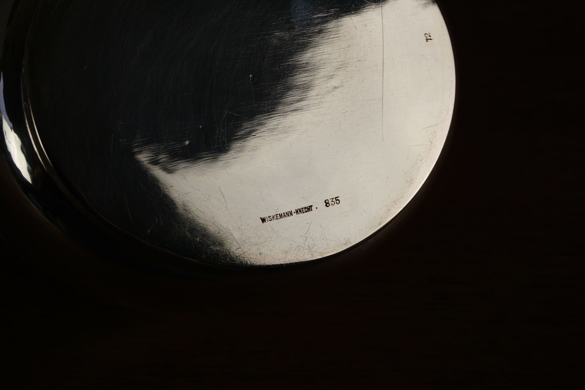 It was handmade and manufactured in the modern style by the Swiss silversmith Wiskemann - Knecht in Zurich in the 1920s/30s. You can see a beautiful, light martelling of the embossed silver sheet.
