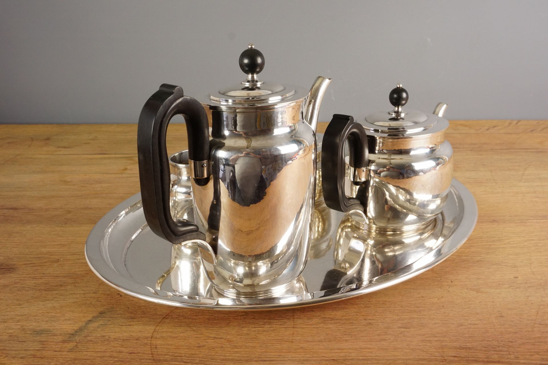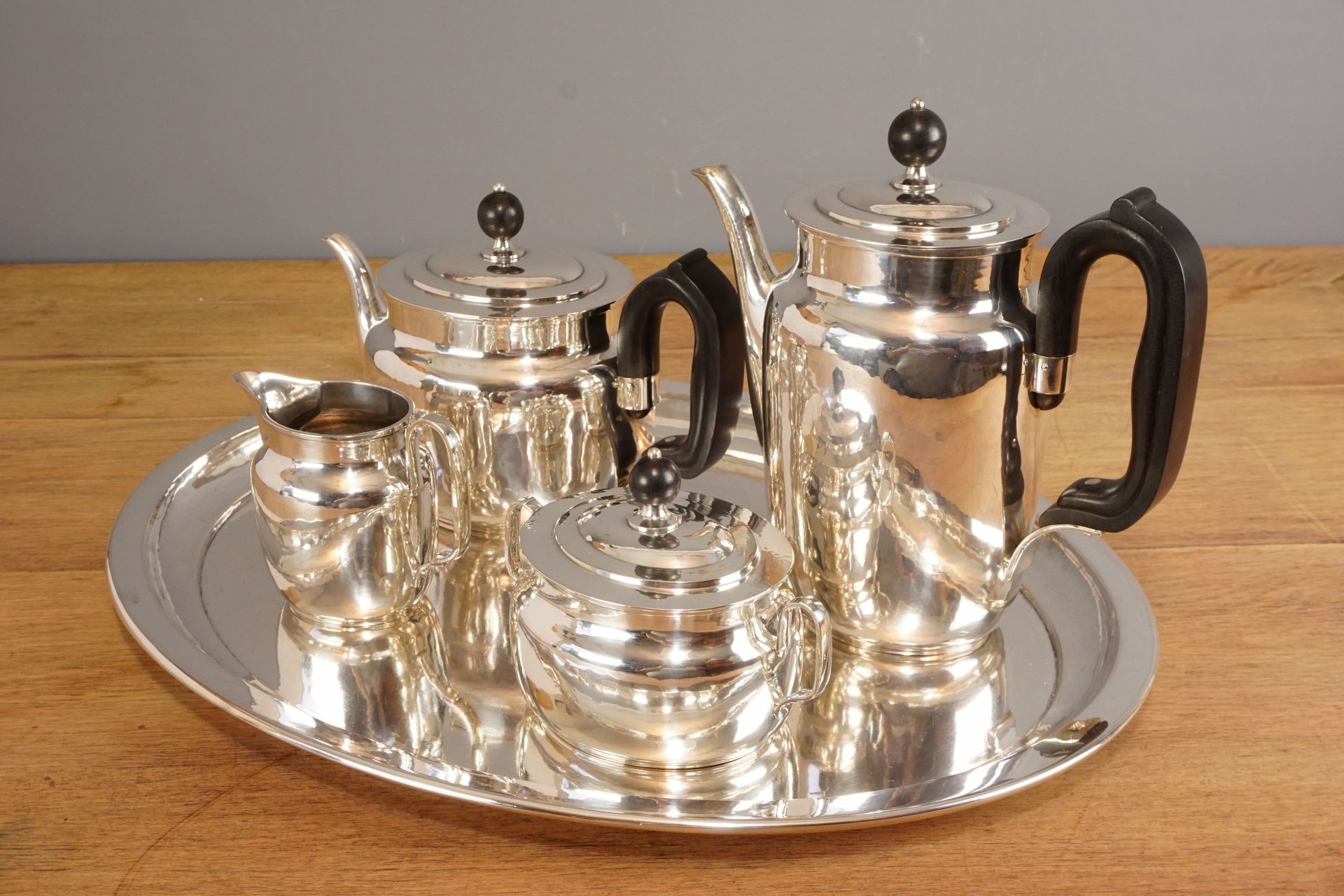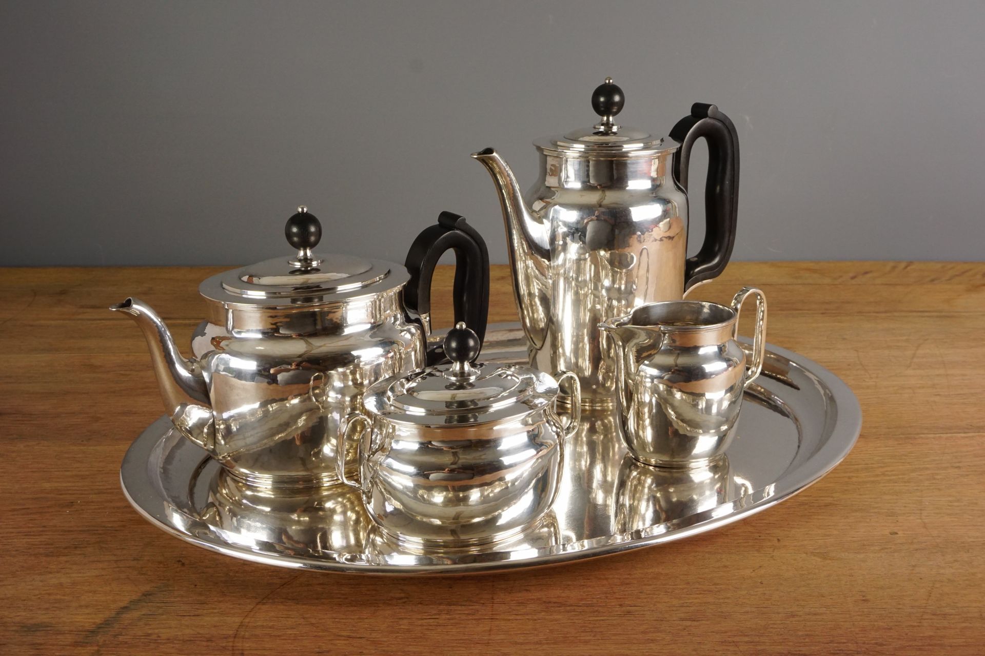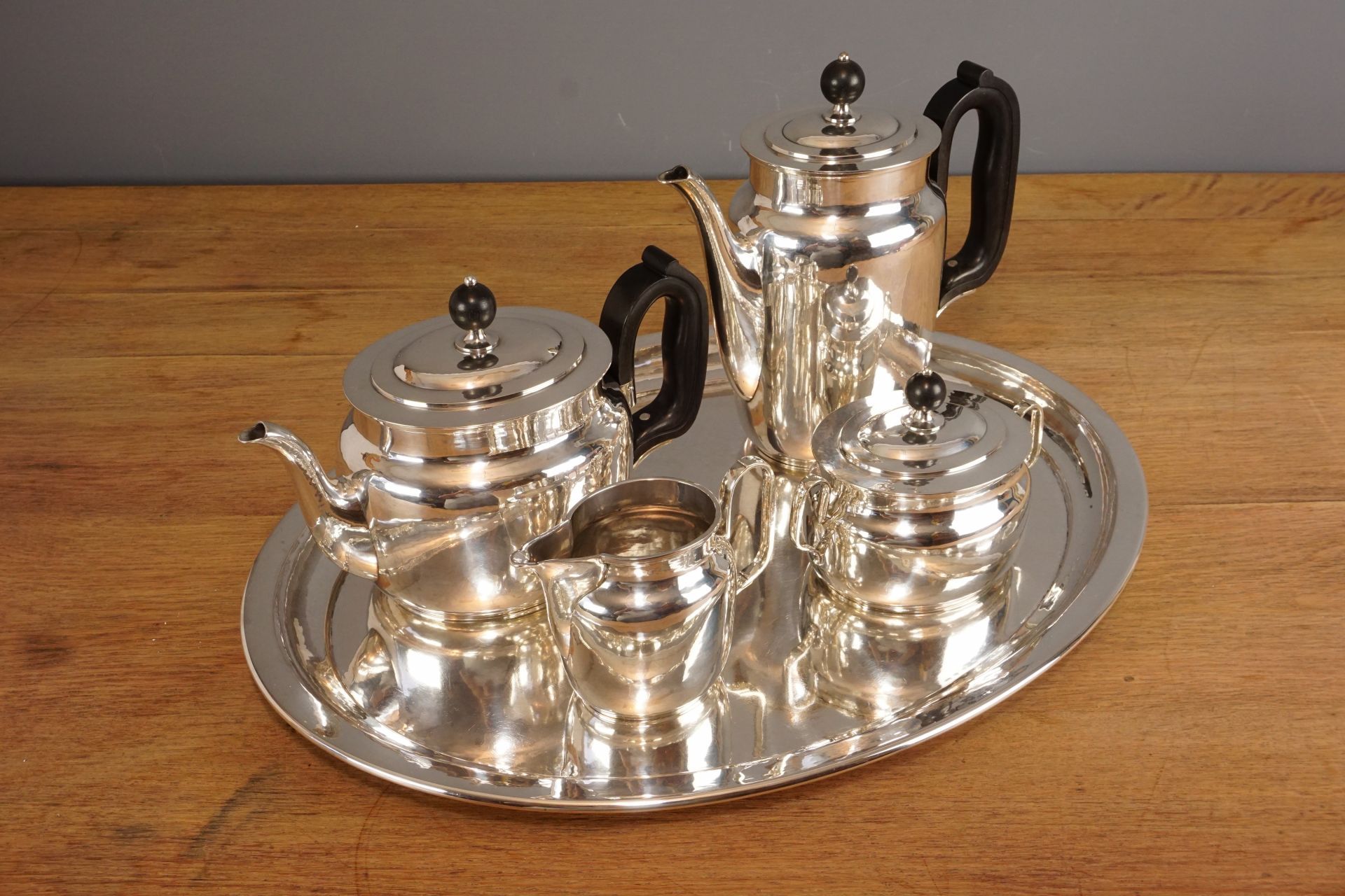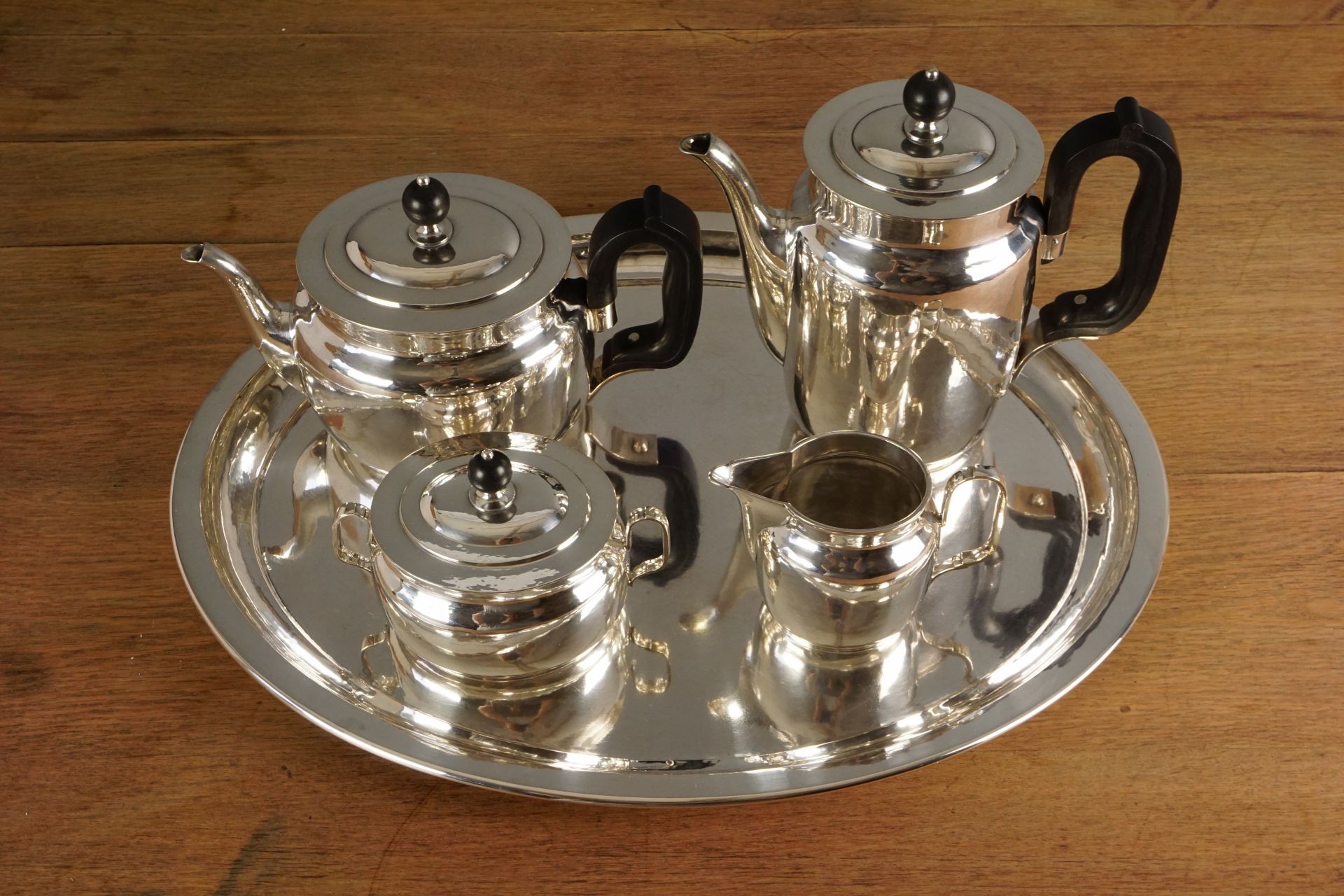 The set consists of an oval tray, a coffee pot, a teapot, a sugar bowl and a milk/cream jug.