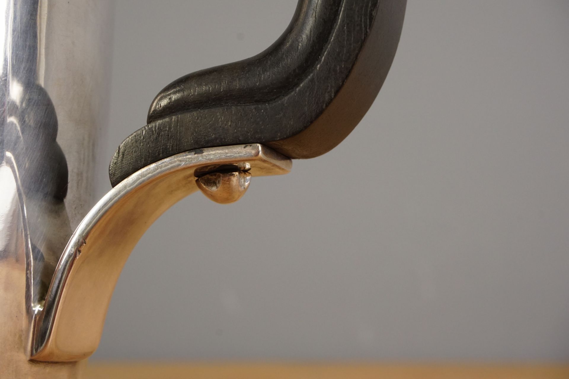 The coffee pot with ebonized wooden handle and knob is 22.5 cm high and 22.5 cm wide including the handle