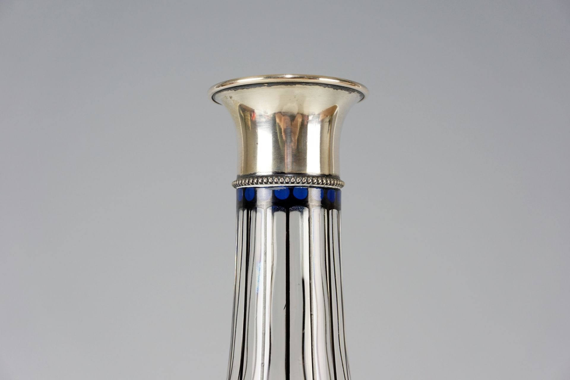Elegant and slim German Art Nouveau glass carafe with silver fittings.
