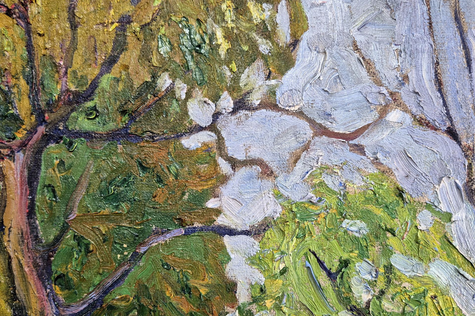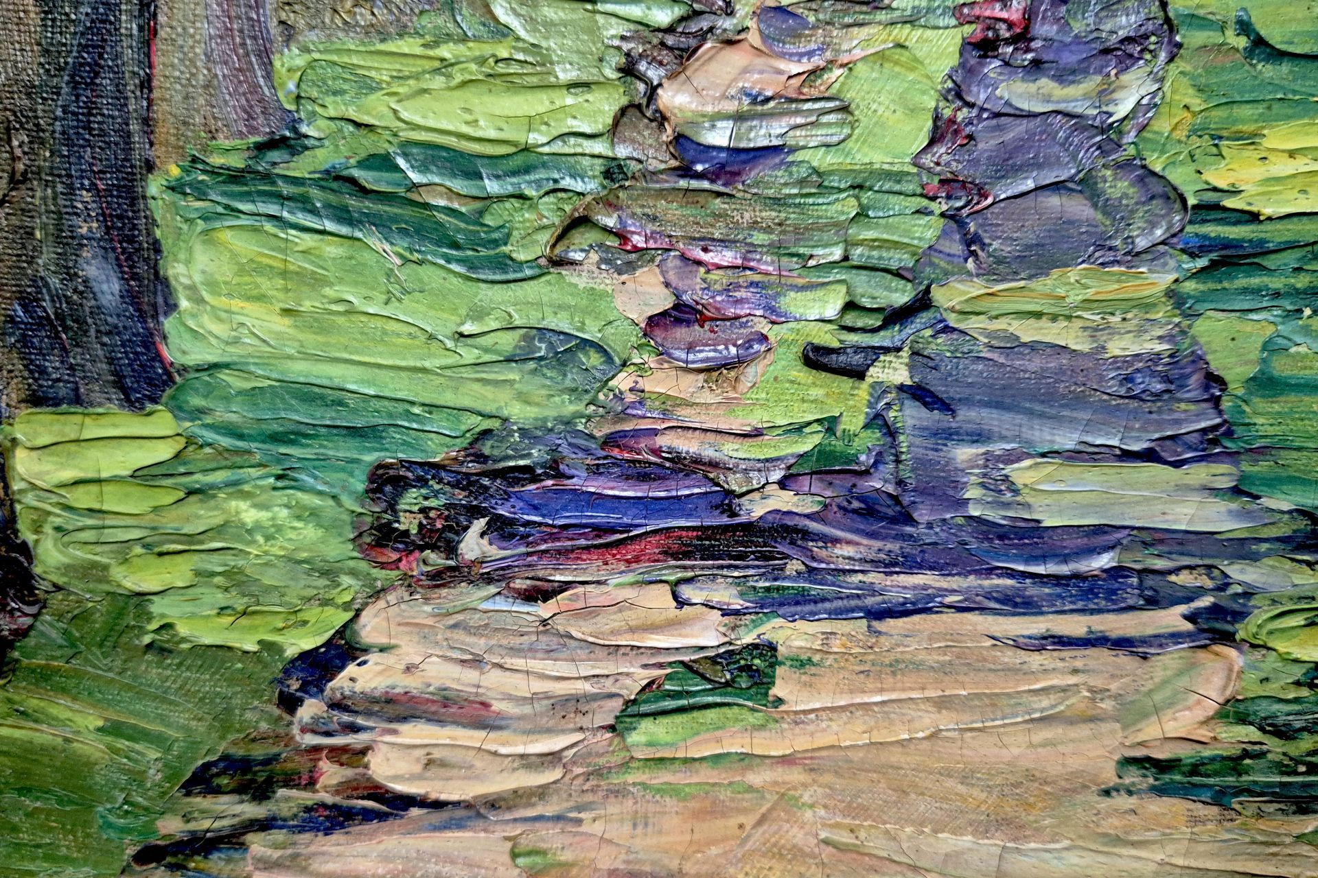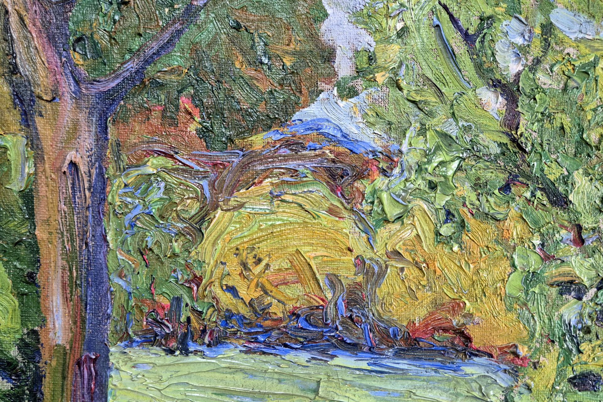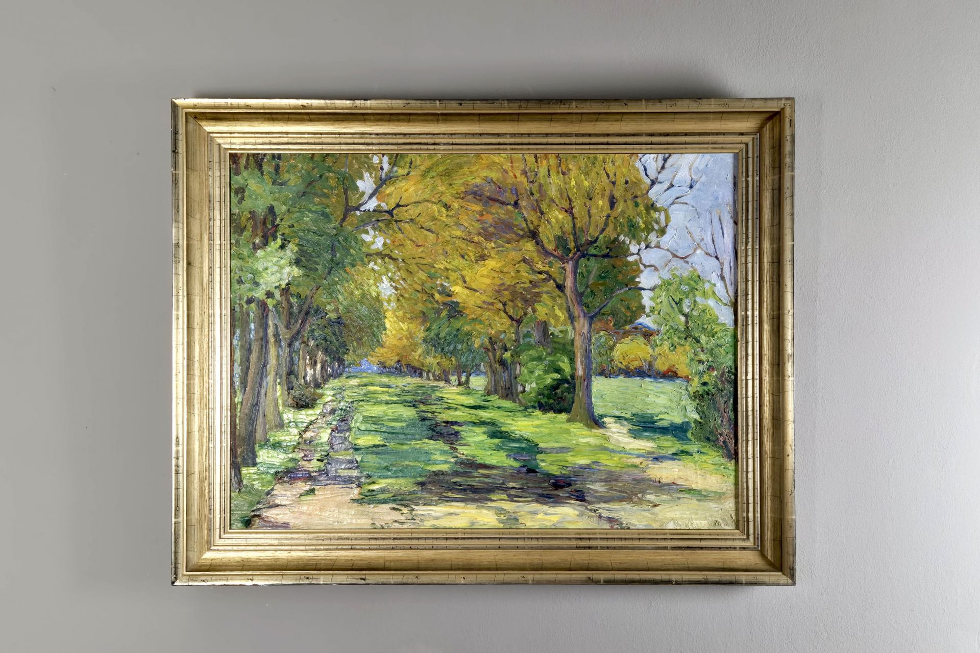 The picture offered here, painted in oil on canvas in landscape format, shows, as already mentioned, a path in nature flanked by trees. Some trees are still in lush green, others have already changed to autumnal yellow-green. Often also referred to as "Indian Summer".
