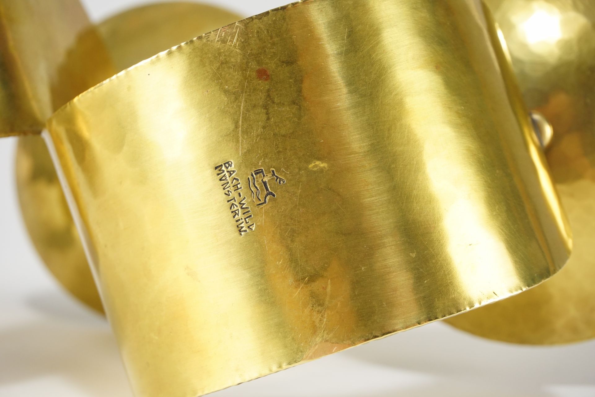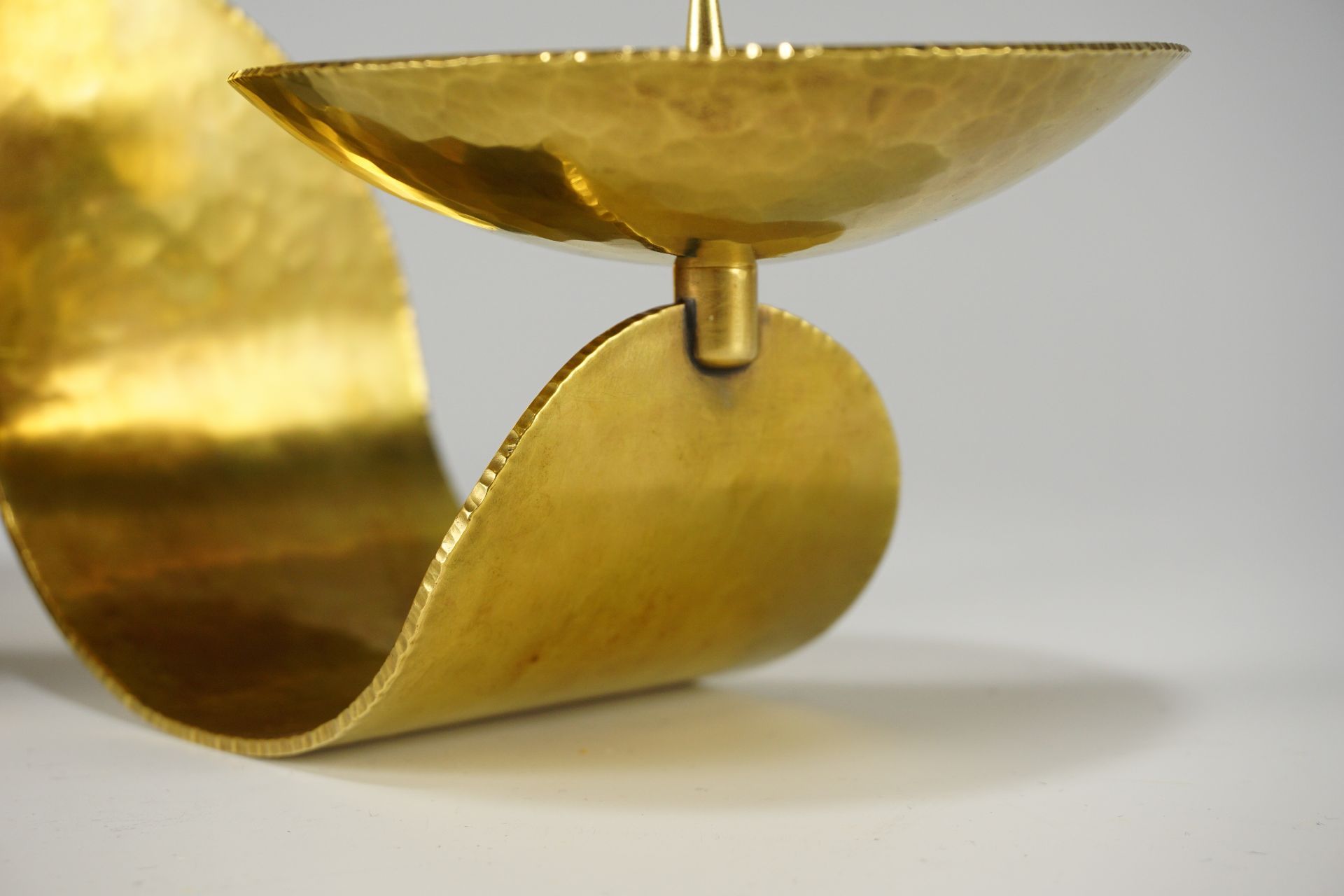 Very beautiful, timelessly elegant candlestick by the well-known metal artist Ursula Bach-Wild (1903-1987), Münster / Westphalia. The candlestick, handmade from one piece of brass around 1930, impresses with its aesthetically beautiful shape in addition to the handcrafted, beautiful forged surface. Everything is rounded.