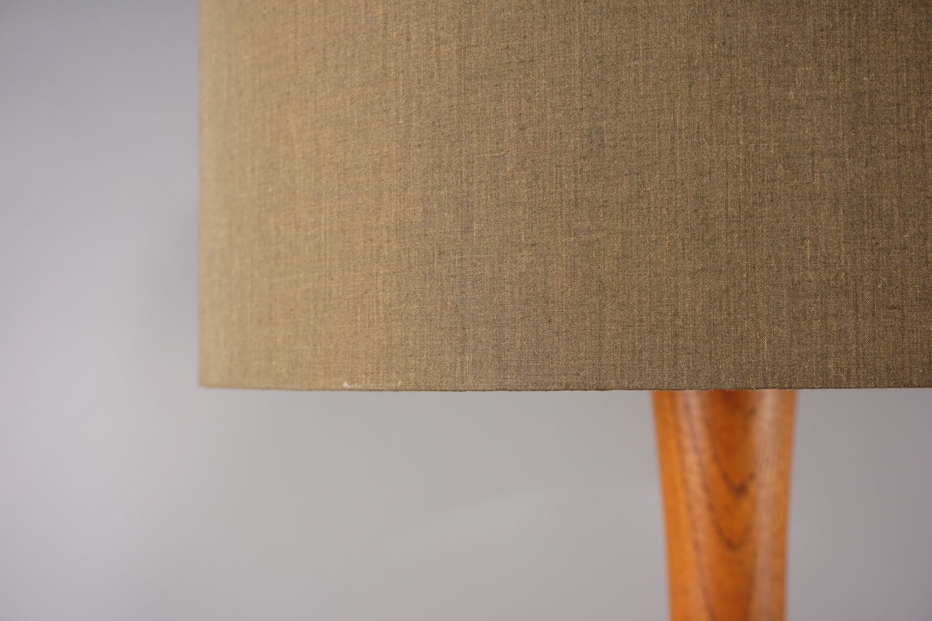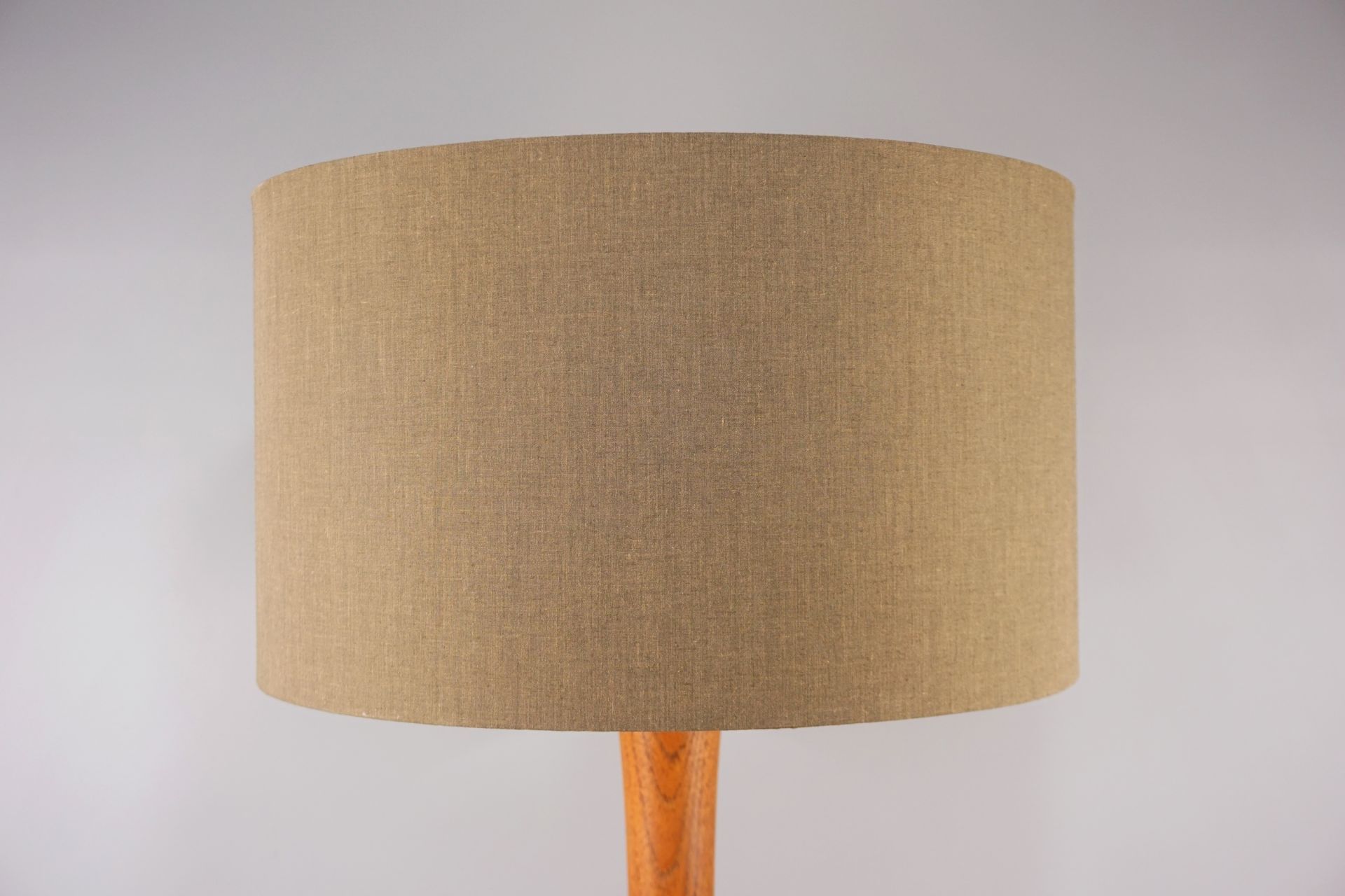The lamp is currently equipped with a brown cylindric fabric shade, which can be changed at any time.