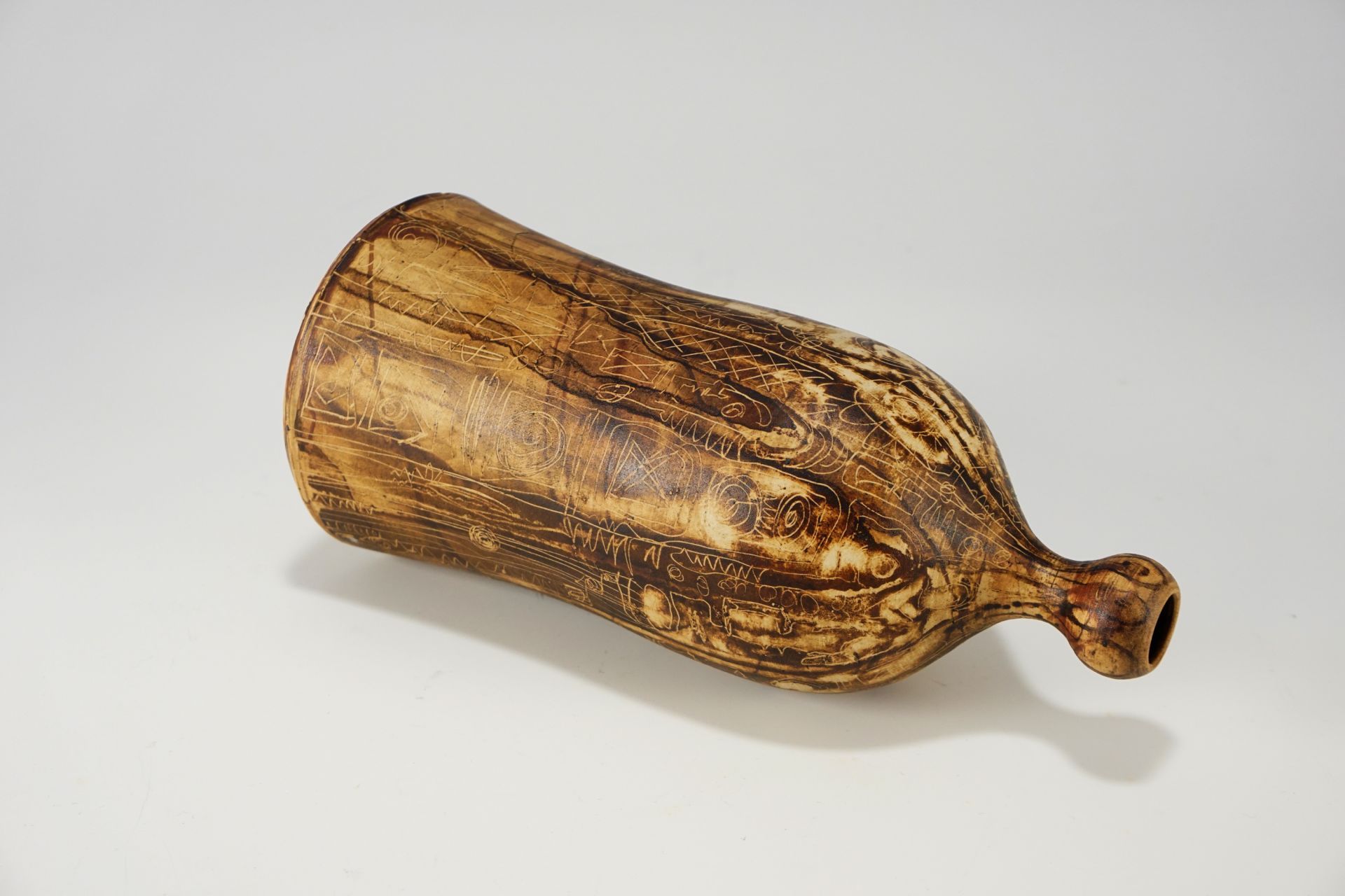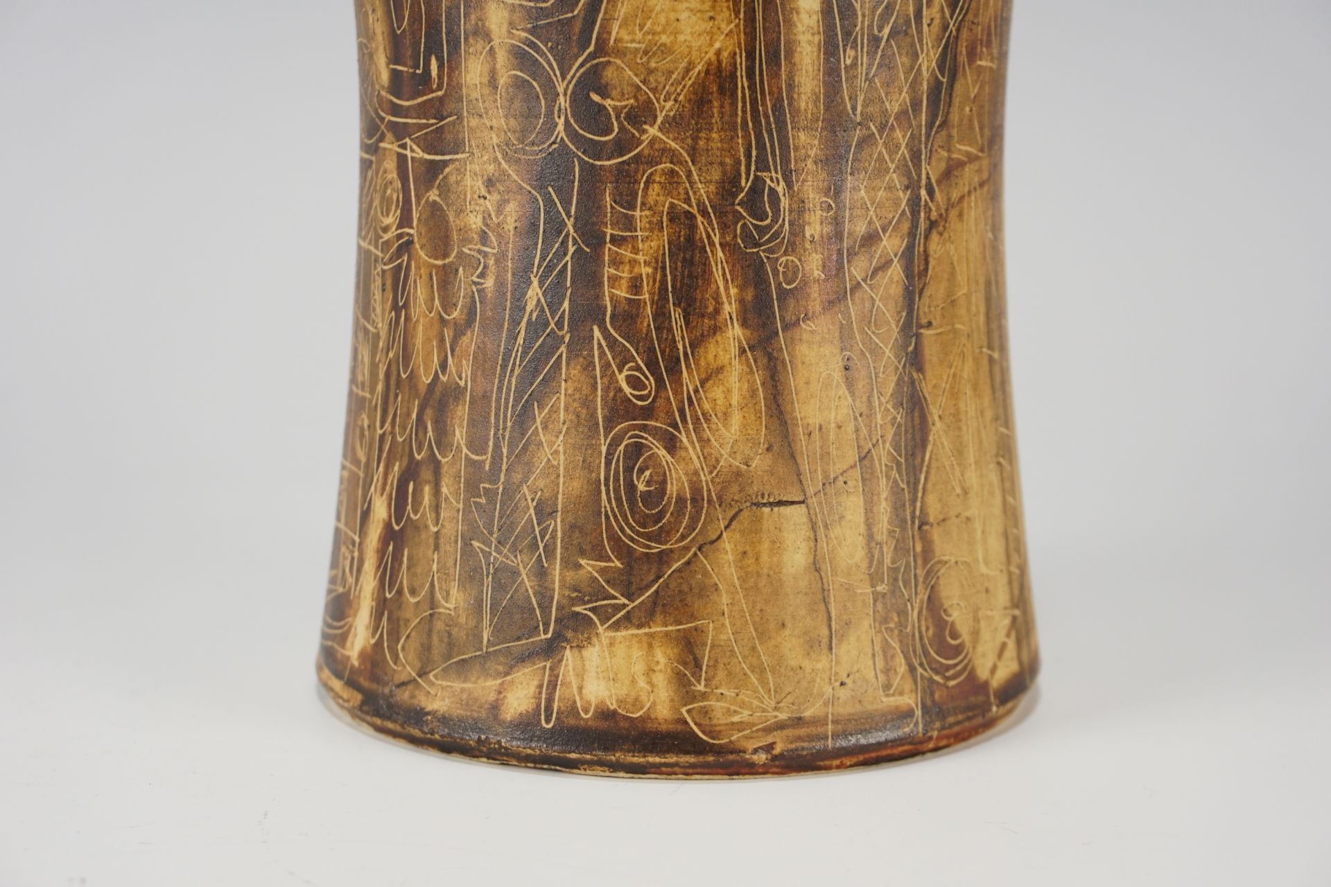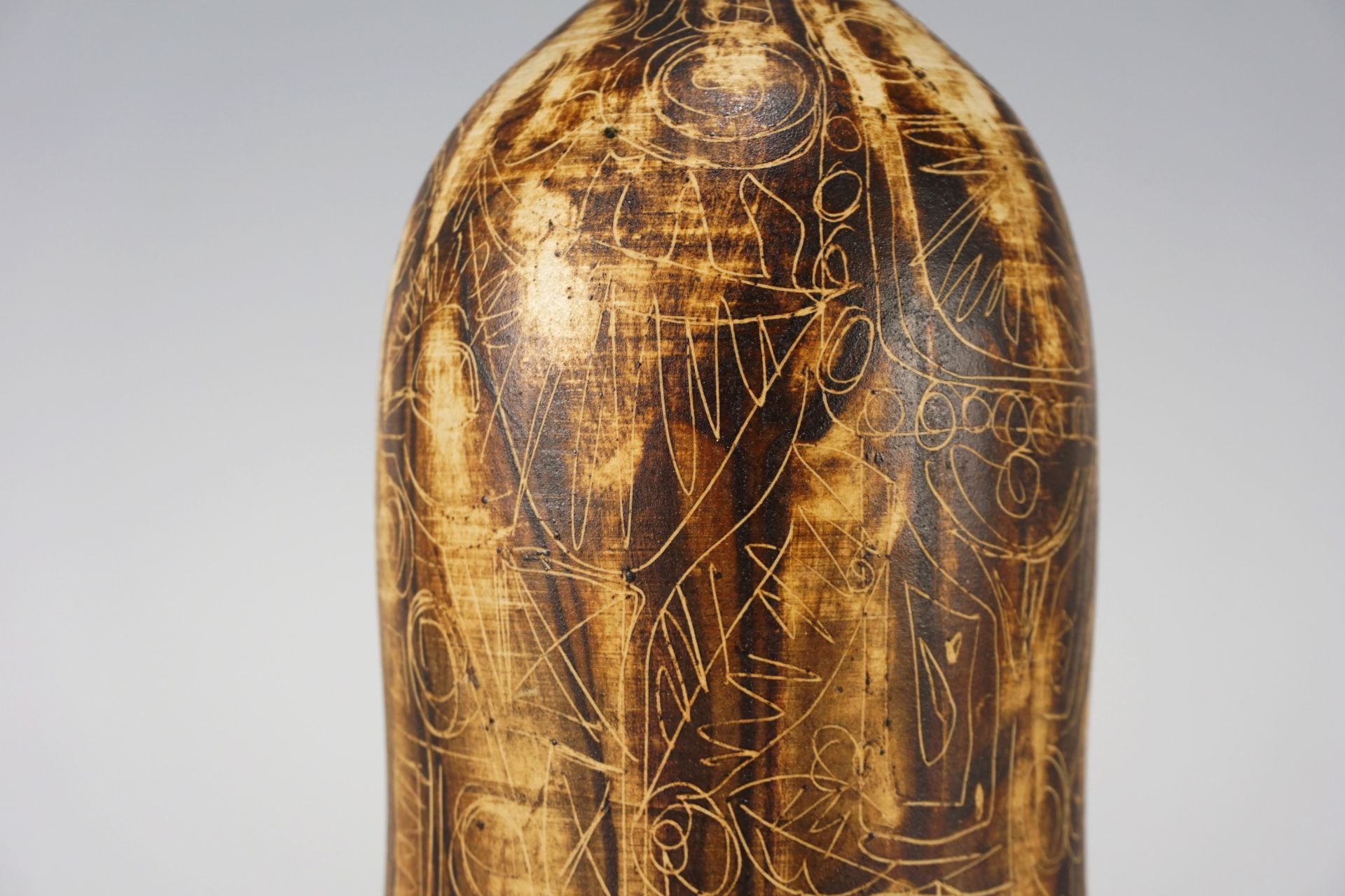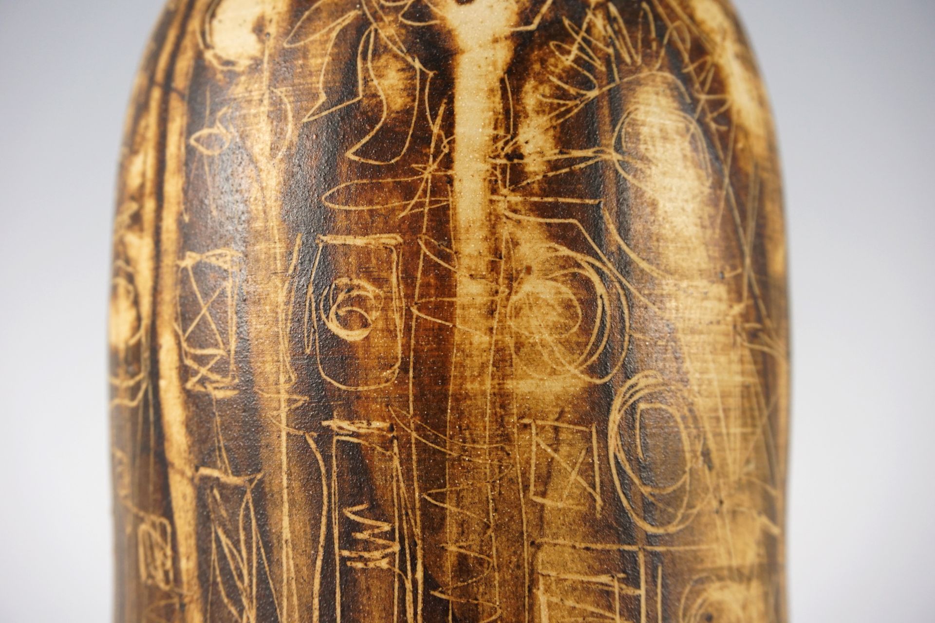 Exceptionally beautiful surface with rare incised drawings, which in connection with the earth tones are reminiscent of old cave drawings. Top condition. Signed on the underside.