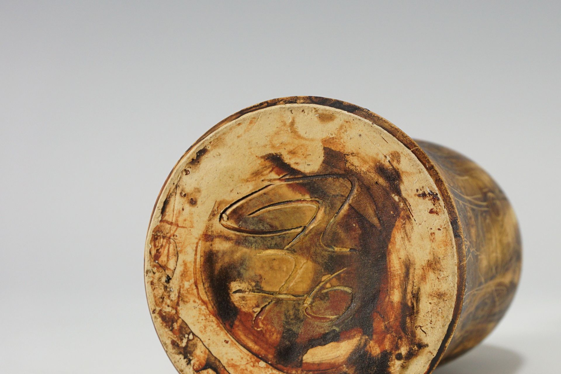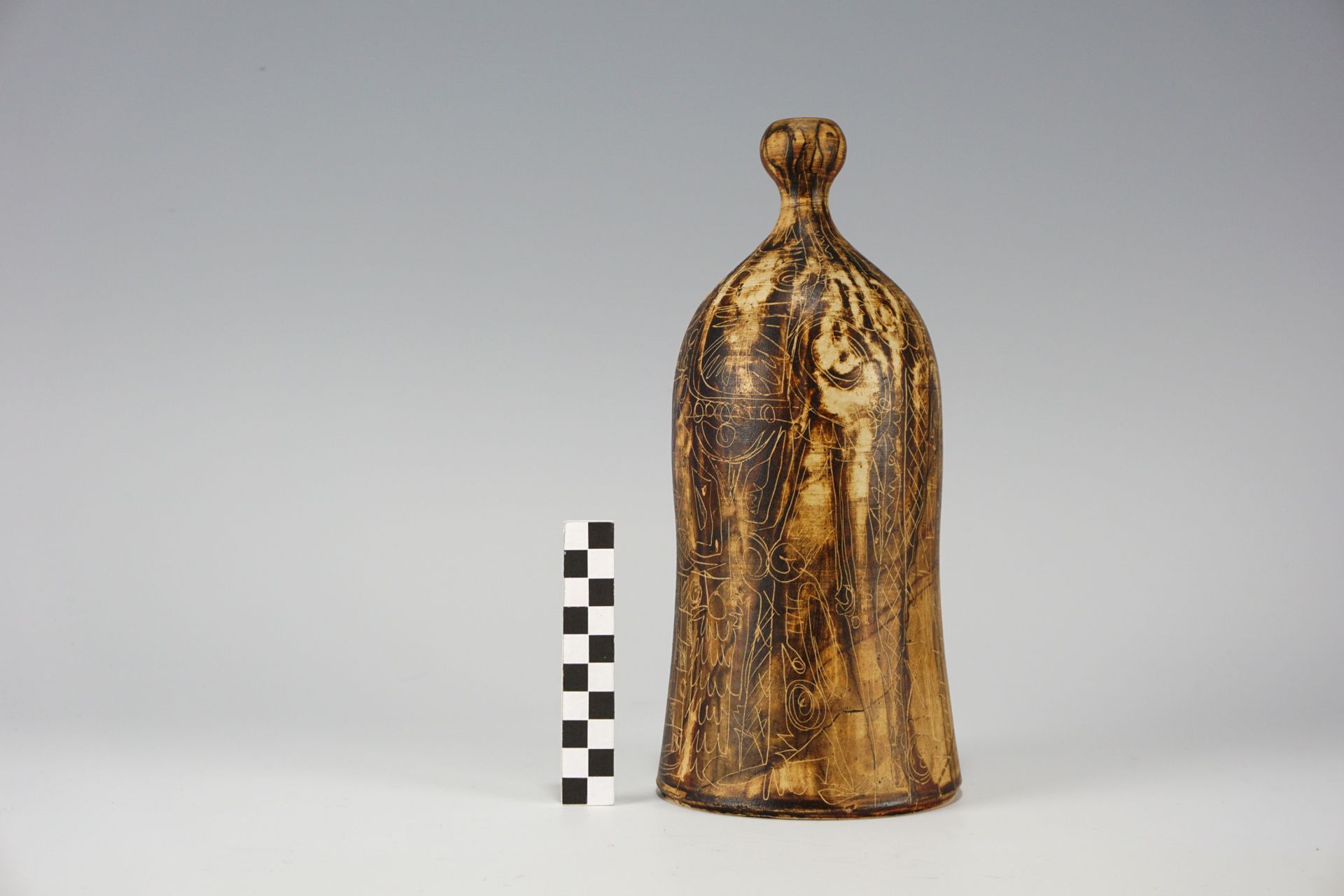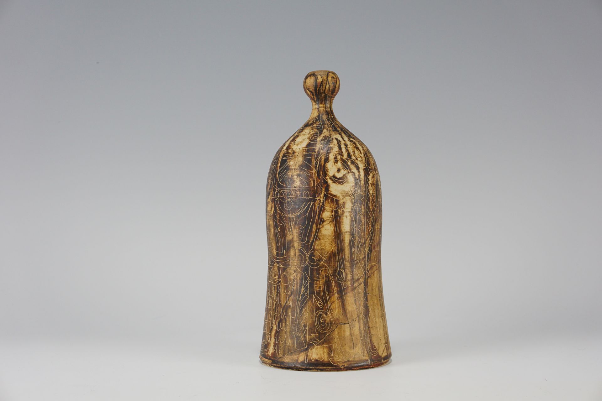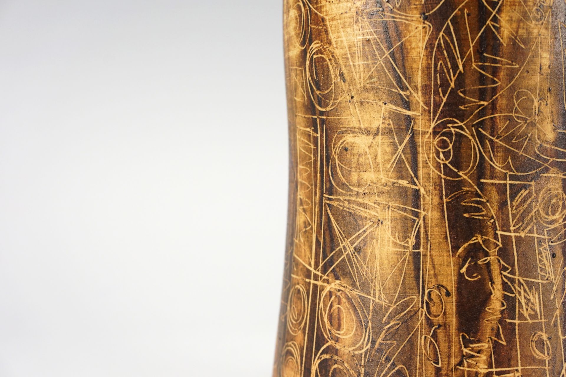 Exceptionally beautiful surface with rare incised drawings, which in connection with the earth tones are reminiscent of old cave drawings. Top condition. Signed on the underside.