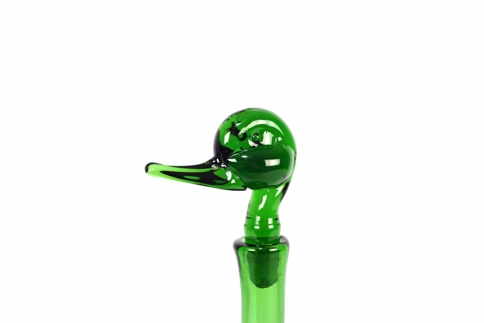 The green glass decanter has a duck-shaped voluminous body with a removable duck-head-shaped stopper.