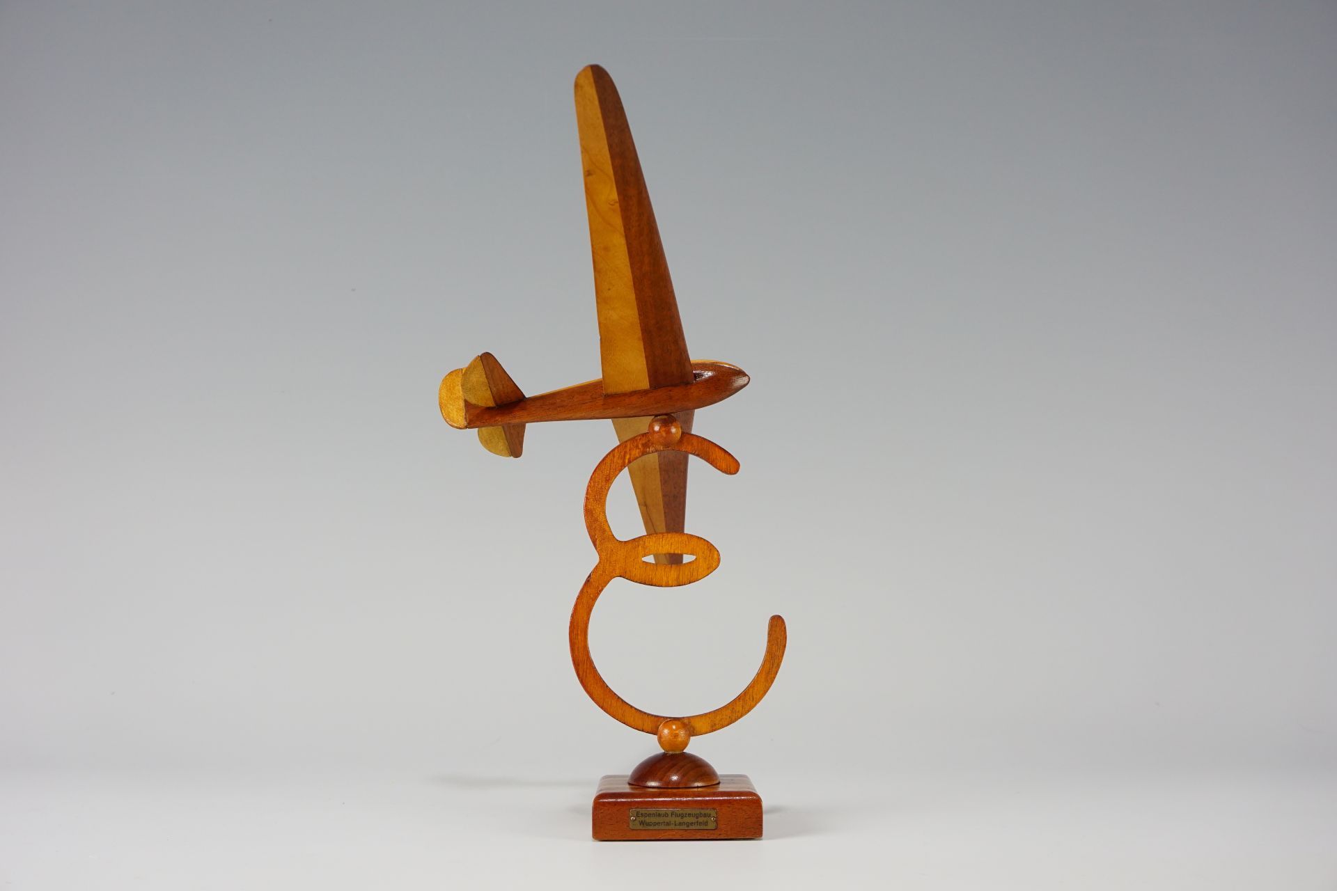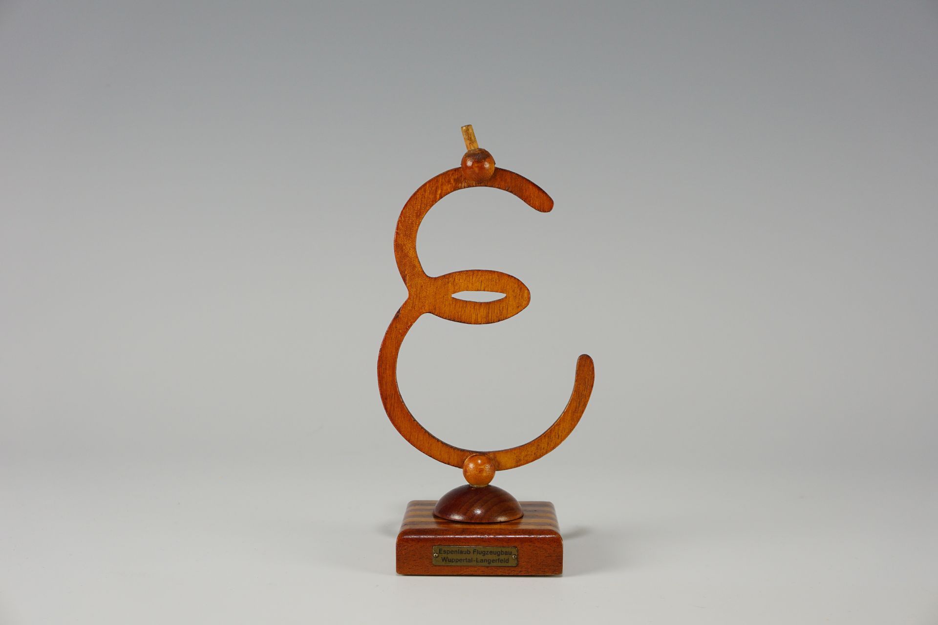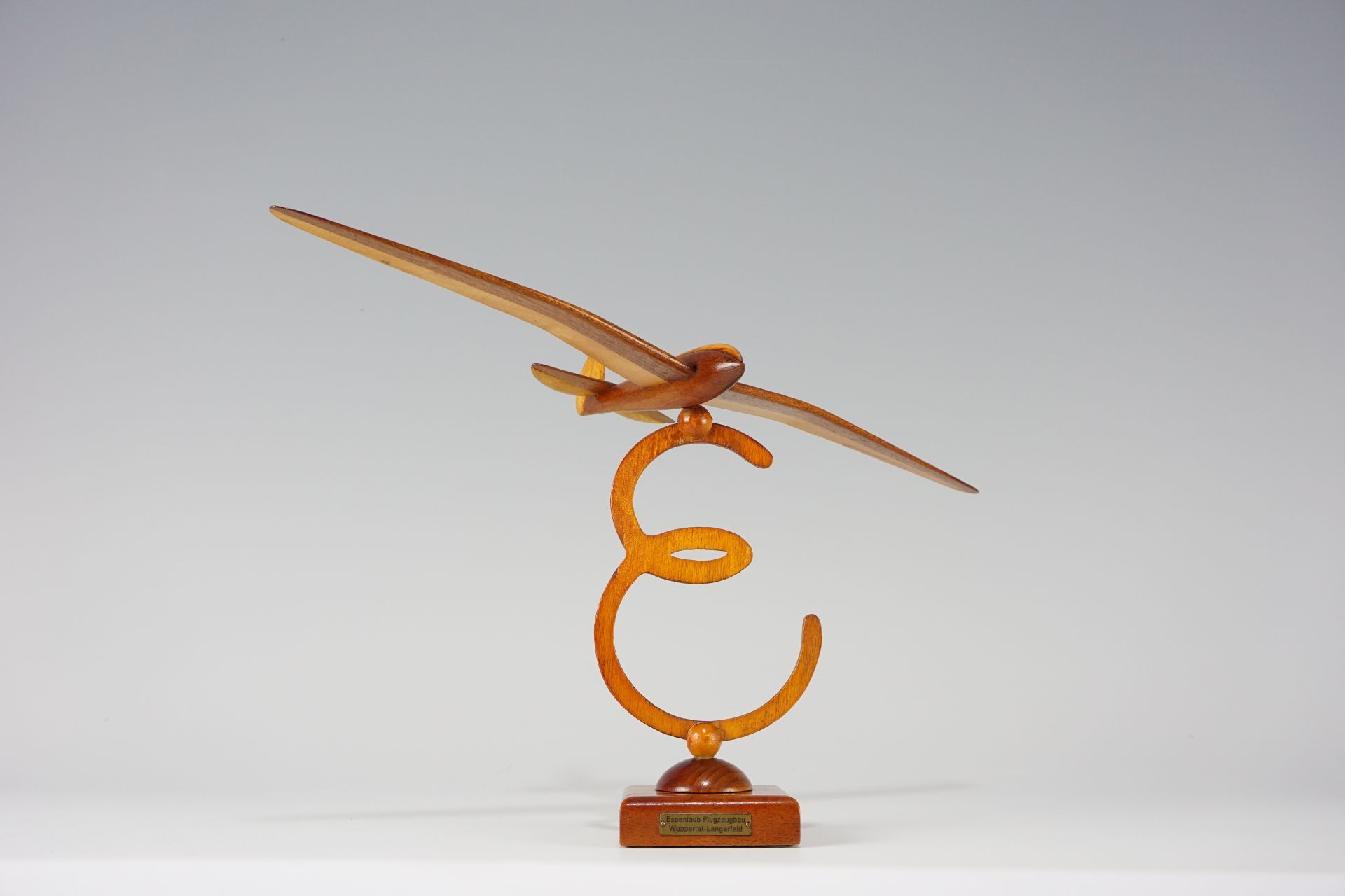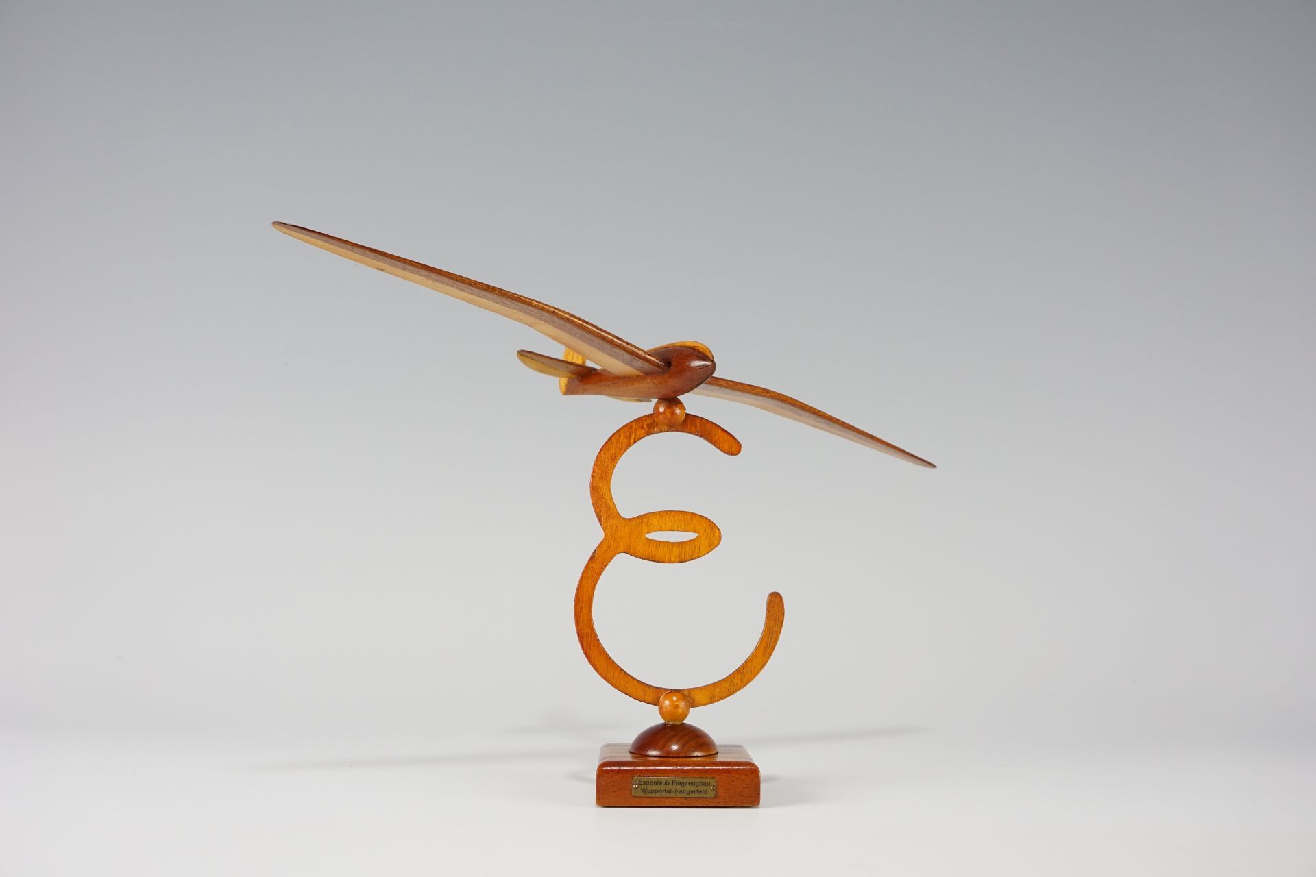 The plane rests, rotatable, on a large cursive script -E, which in turn takes on the beautiful light and darker wood tones as a base. There is a plaque on the base that reads: