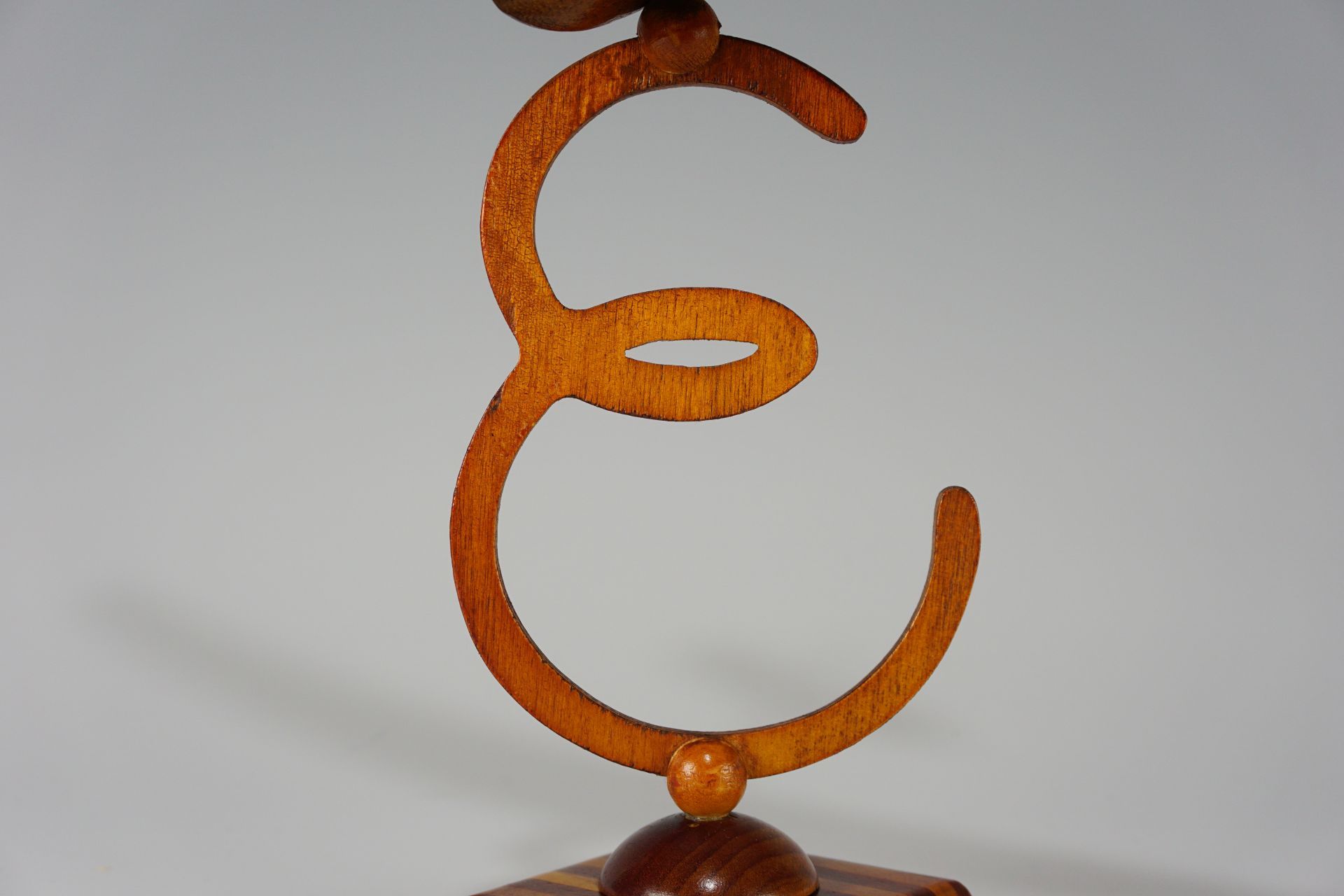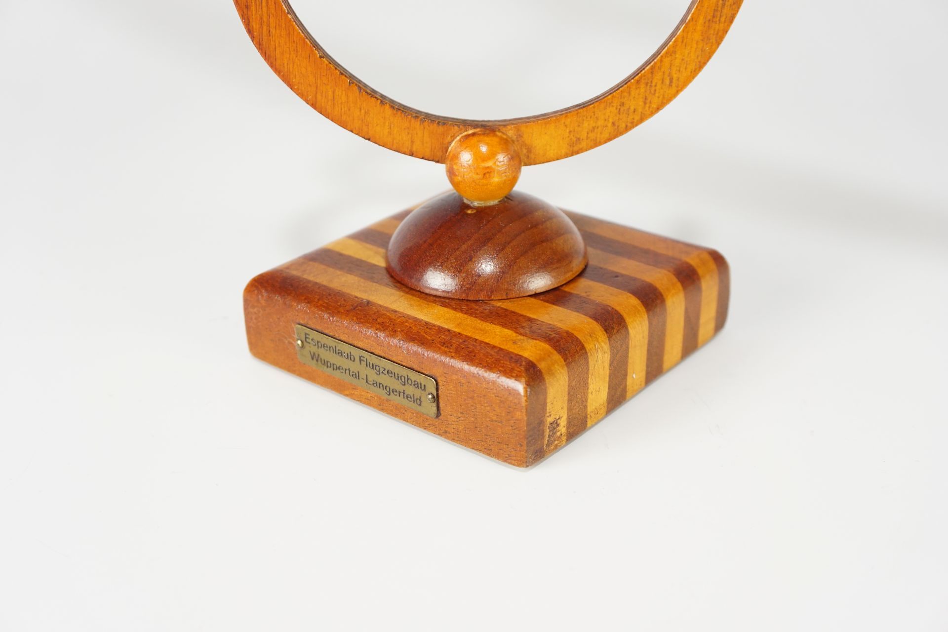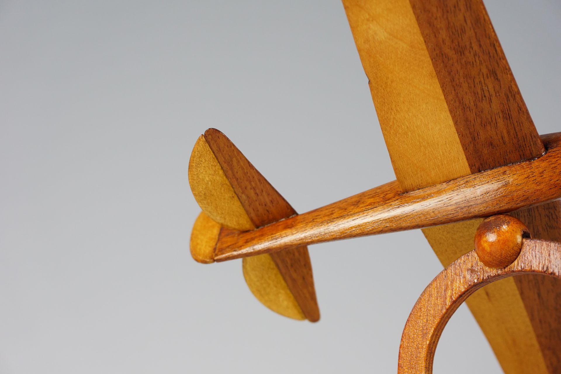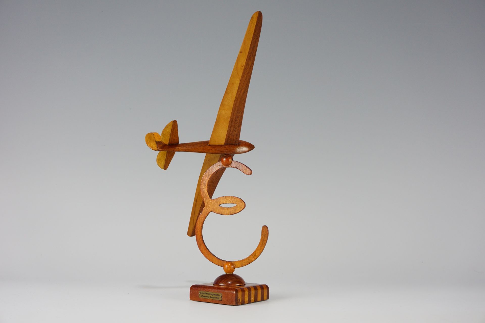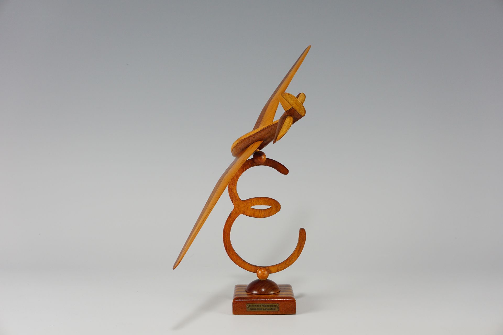 The plane rests, rotatable, on a large cursive script -E, which in turn takes on the beautiful light and darker wood tones as a base. There is a plaque on the base that reads:
