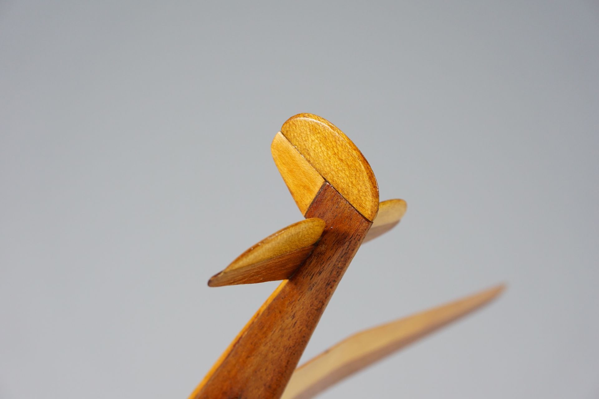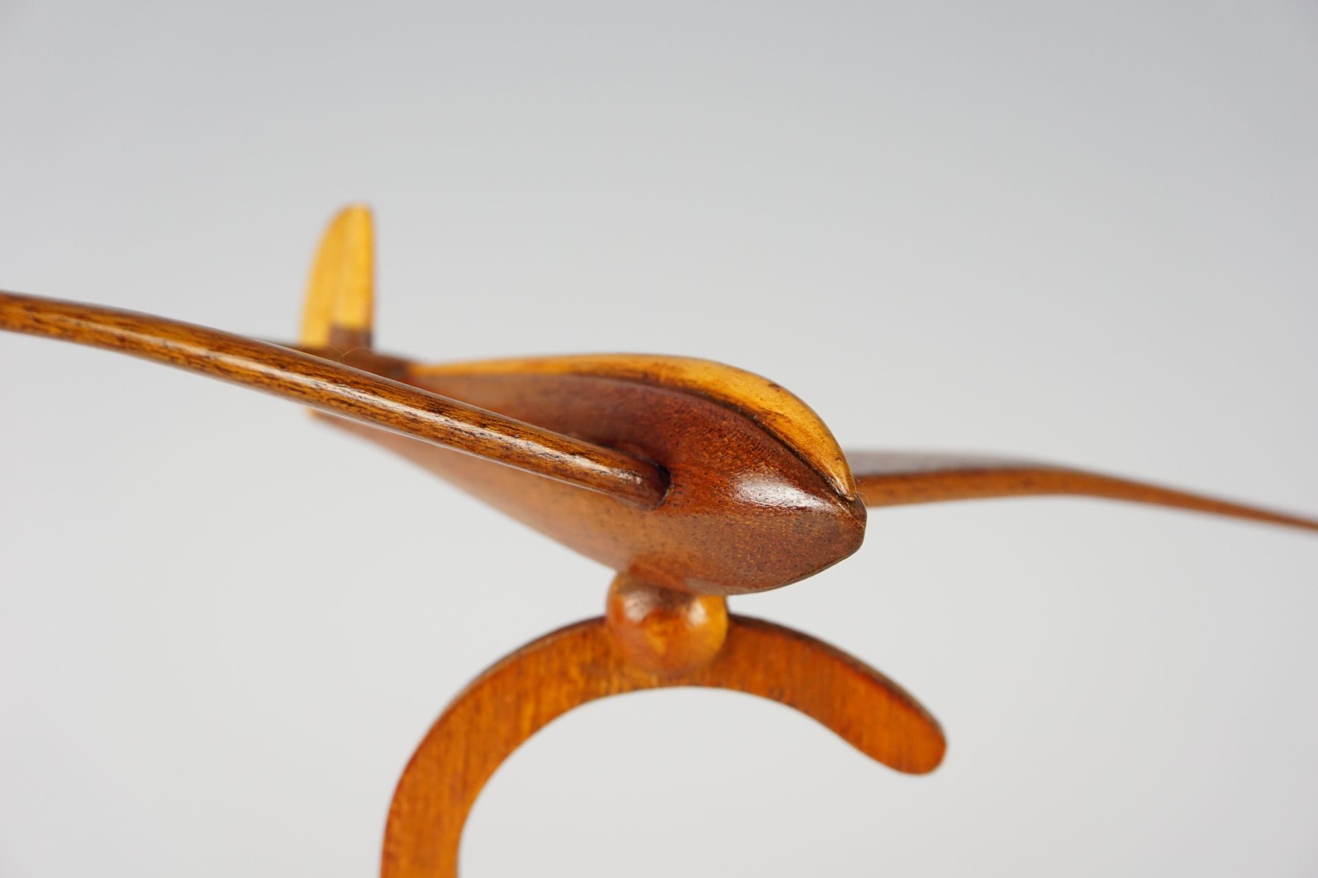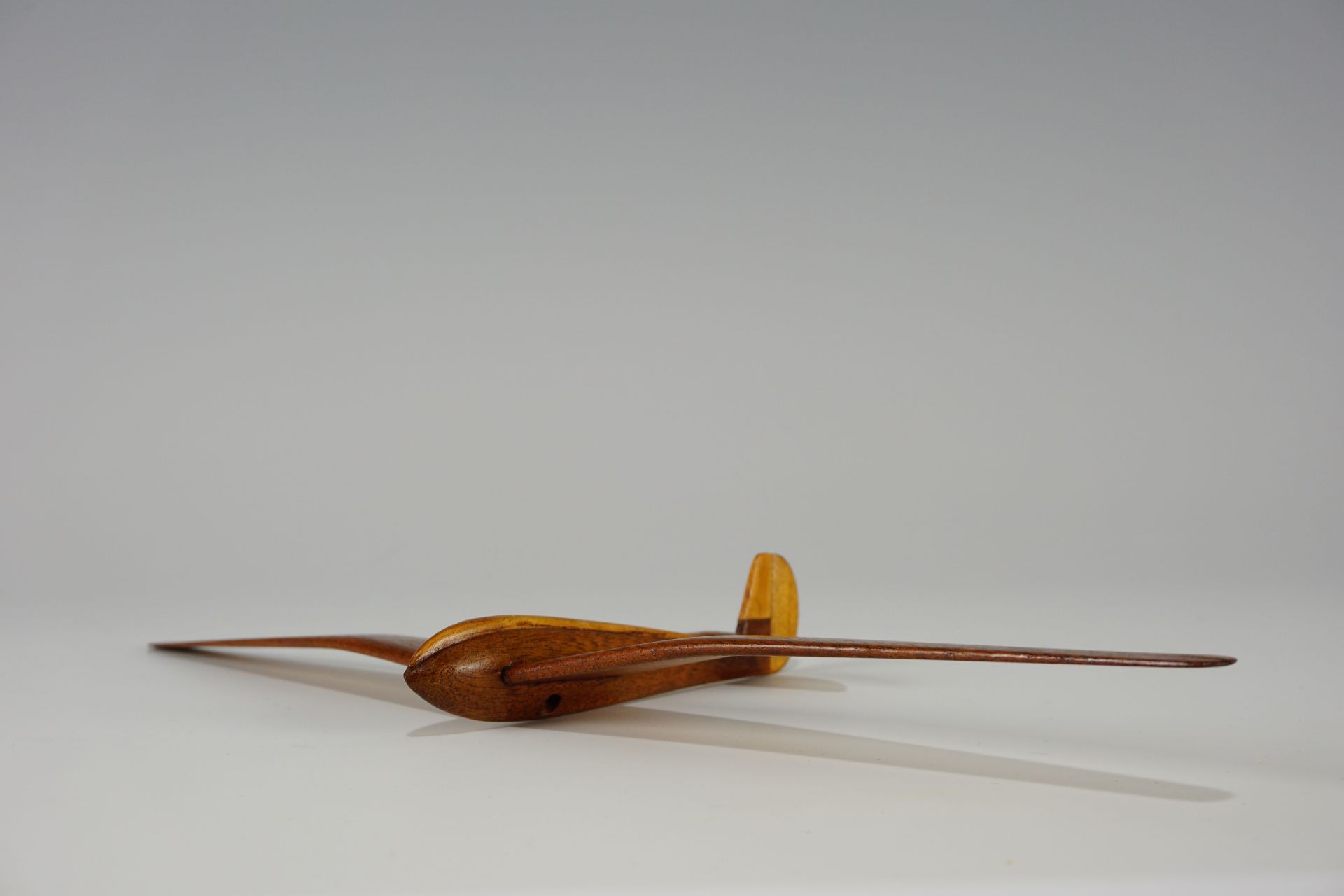 The delicate lines, the thin, slightly angled wings, the tapered fuselage in a streamlined shape and the rounded rudders at the stern... simply magnificent... plus the beautiful use of two woods/wood colors... pure elegance.