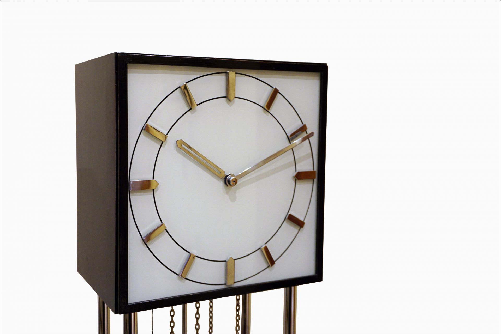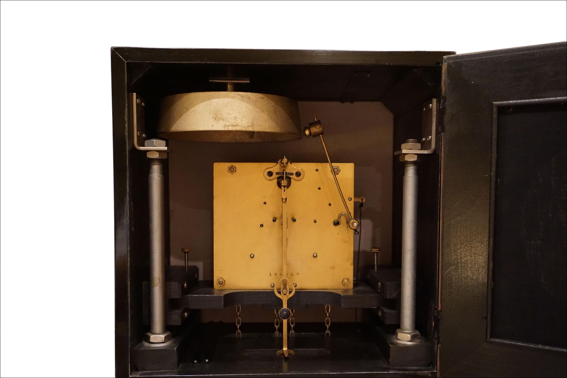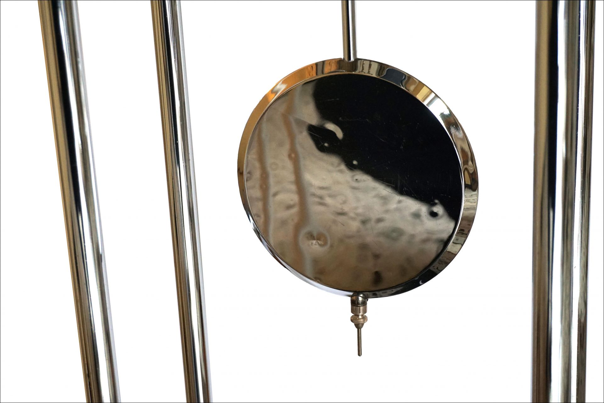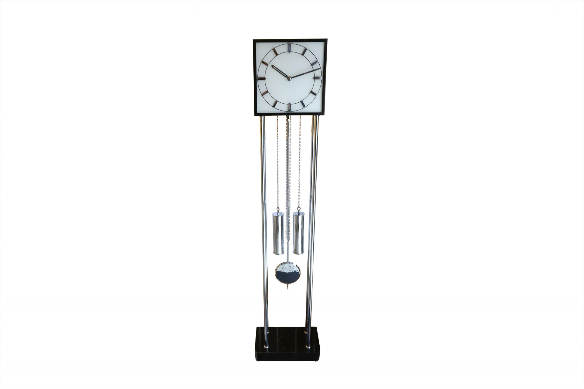 The chromed elements such as numbers, pointers, pendulums, weights, as well as tubular steel supports and support plates still have the original chrome and are also in very nice condition.