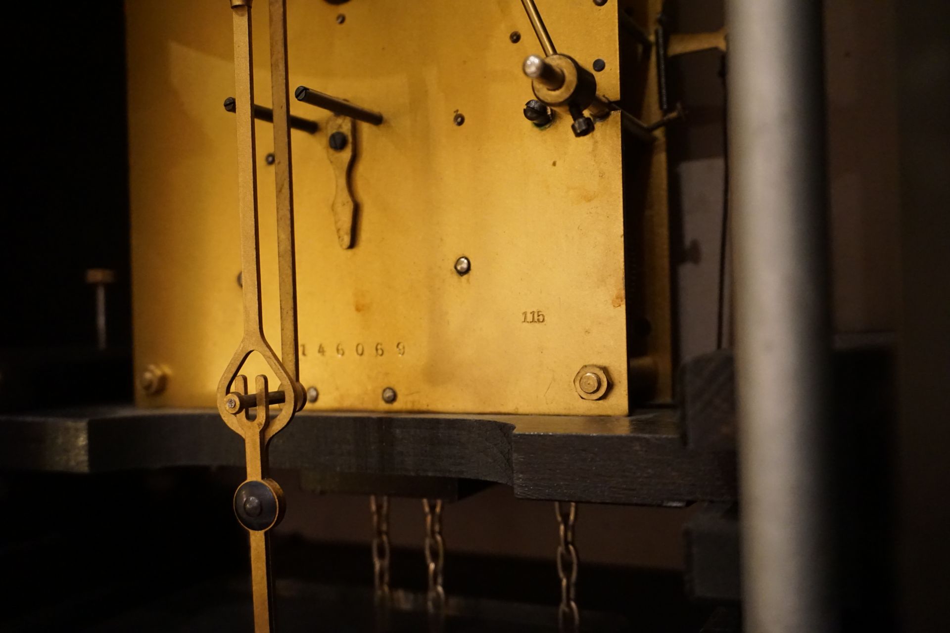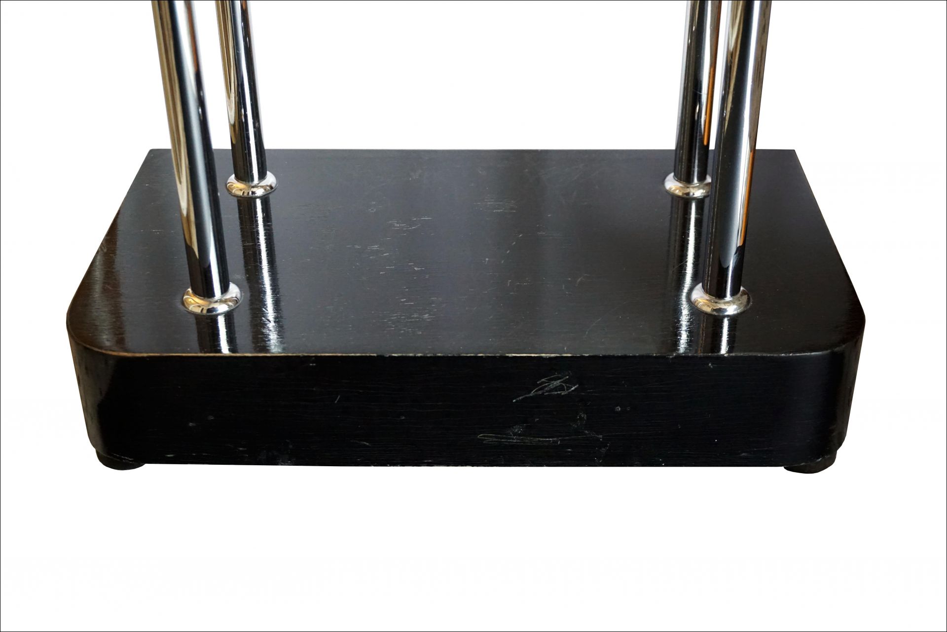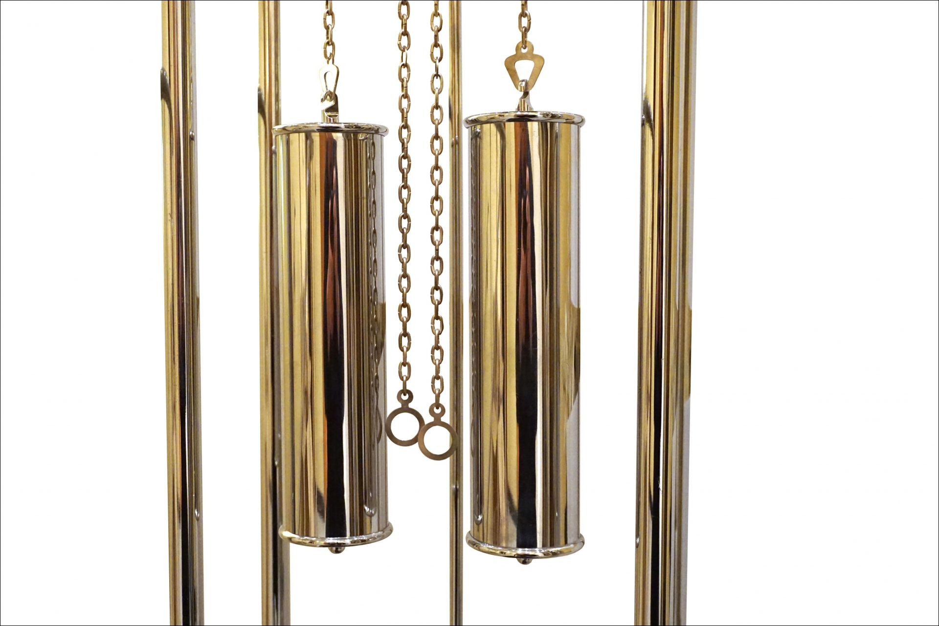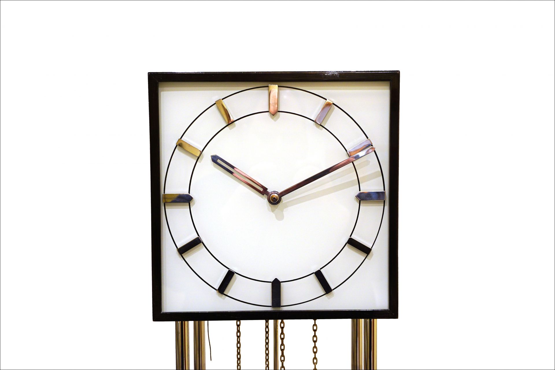 The chromed elements such as numbers, pointers, pendulums, weights, as well as tubular steel supports and support plates still have the original chrome and are also in very nice condition.
