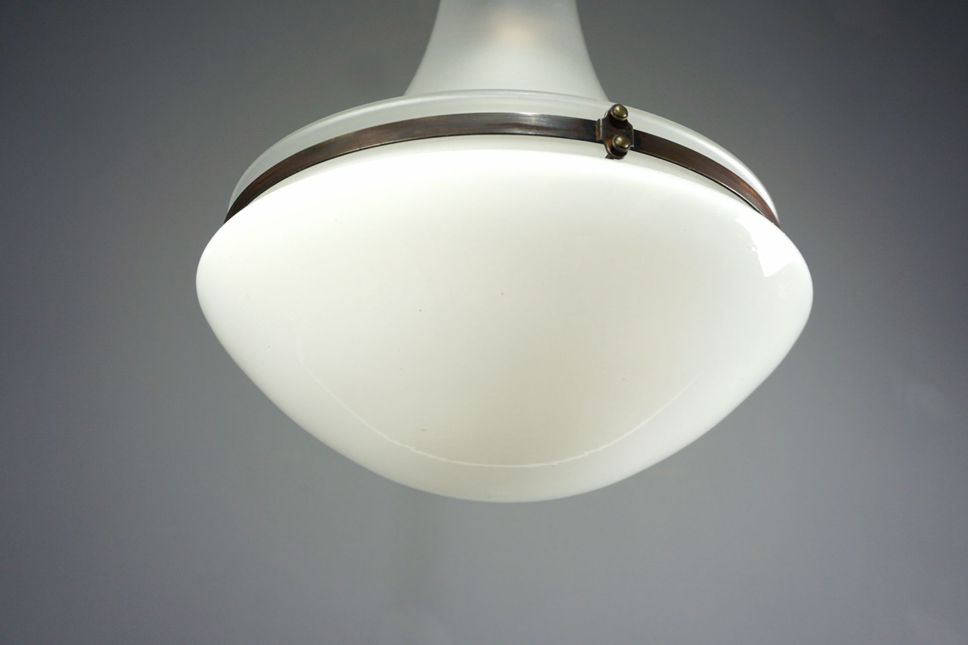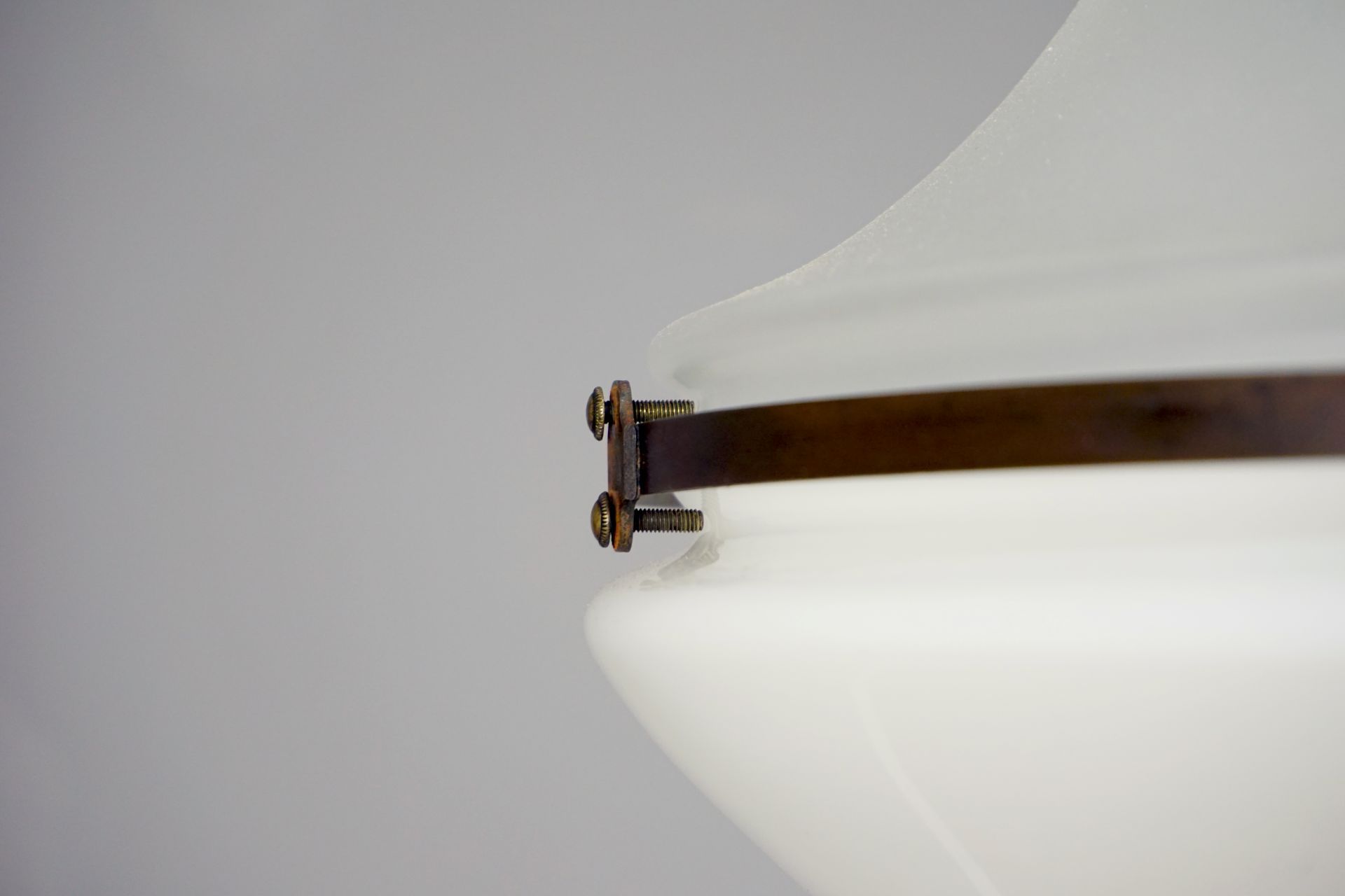Both the upper part and the lower part, which are connected with a metal ring, were available with a satin finish or made of white opal glass. The Luzette offered here is a dream of originality.