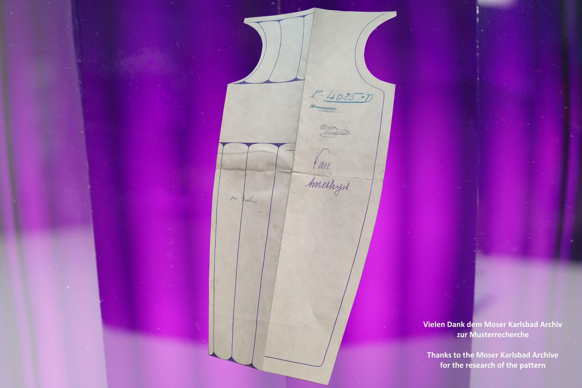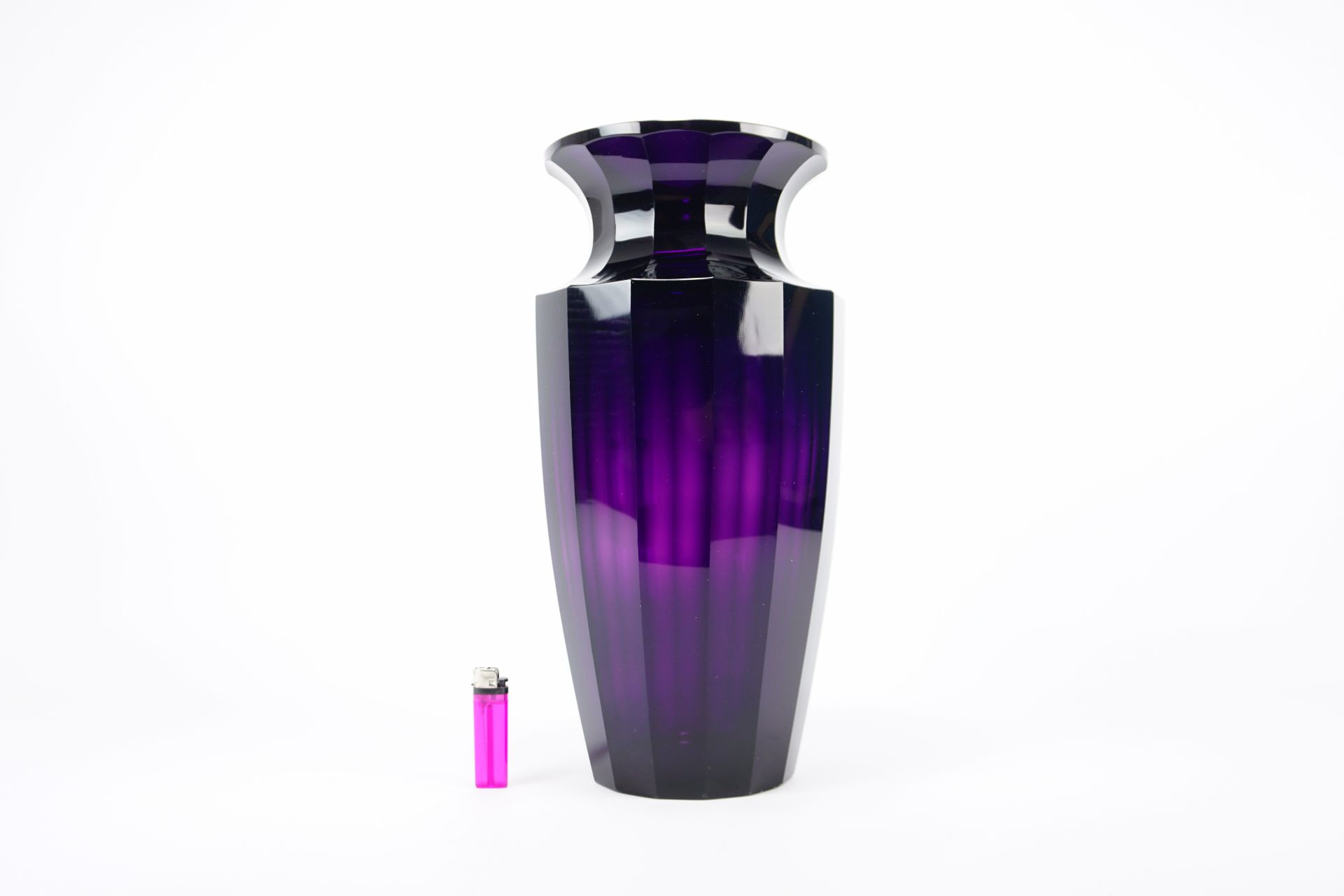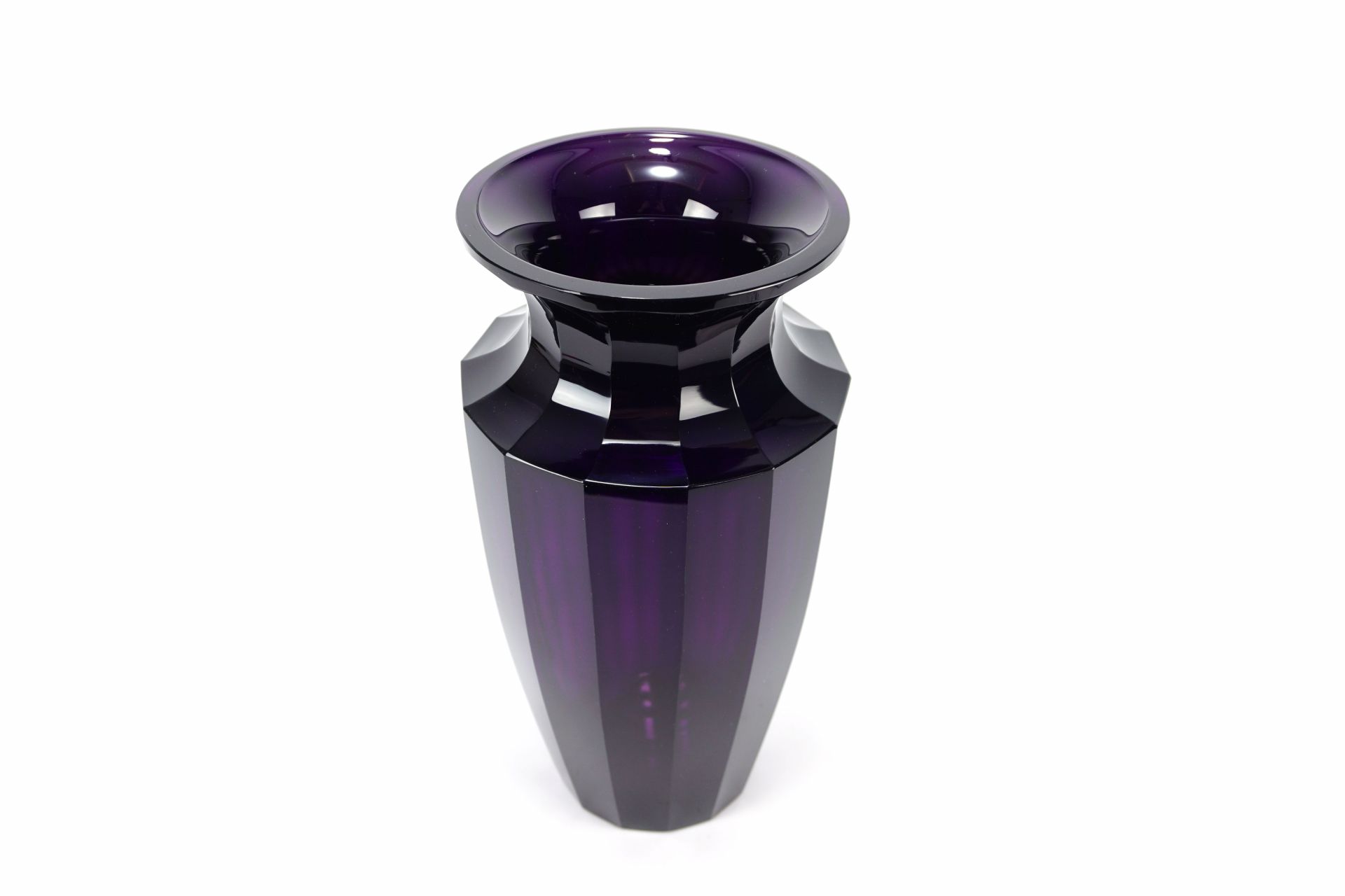 Despite an intensive search on various platforms,..., the large internationally established auction houses and their freely accessible archives, reference works, search engines, etc., we could not find any other such large and heavy vase in this typical geometrically cut design. When we asked Moser Karlsbad, however, we were able to find the model number of this type in the version with a surrounding frieze in the archive. It was model number 4025, the present vase is a version of this type without a frieze.