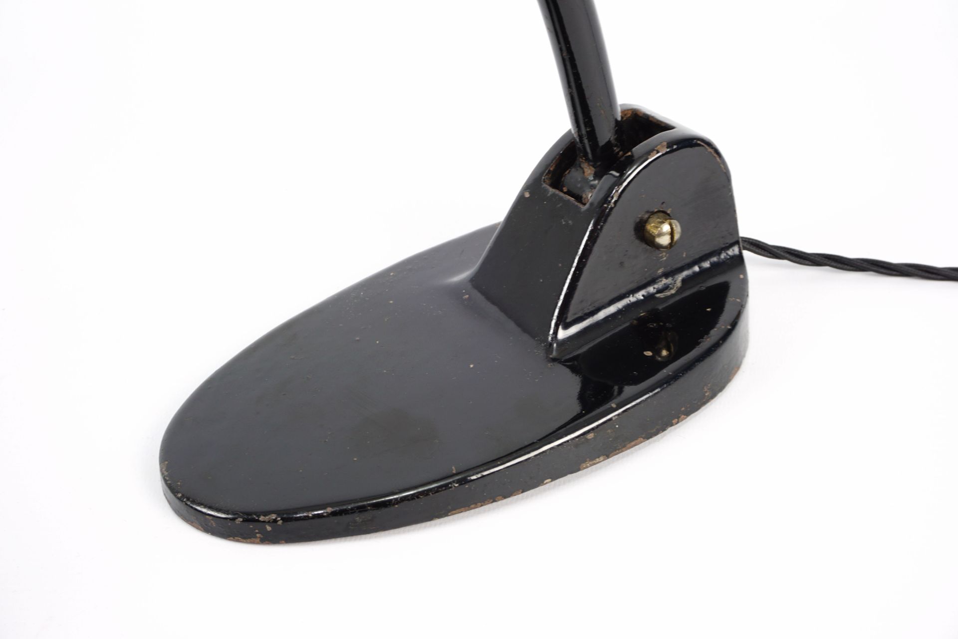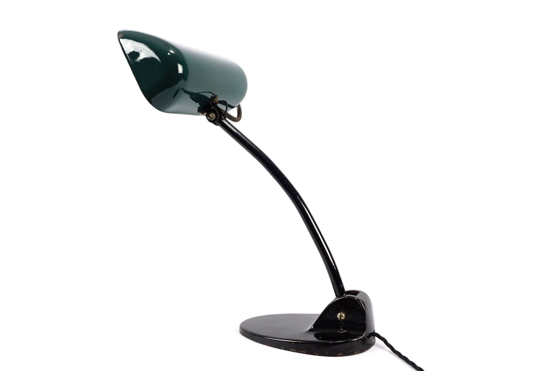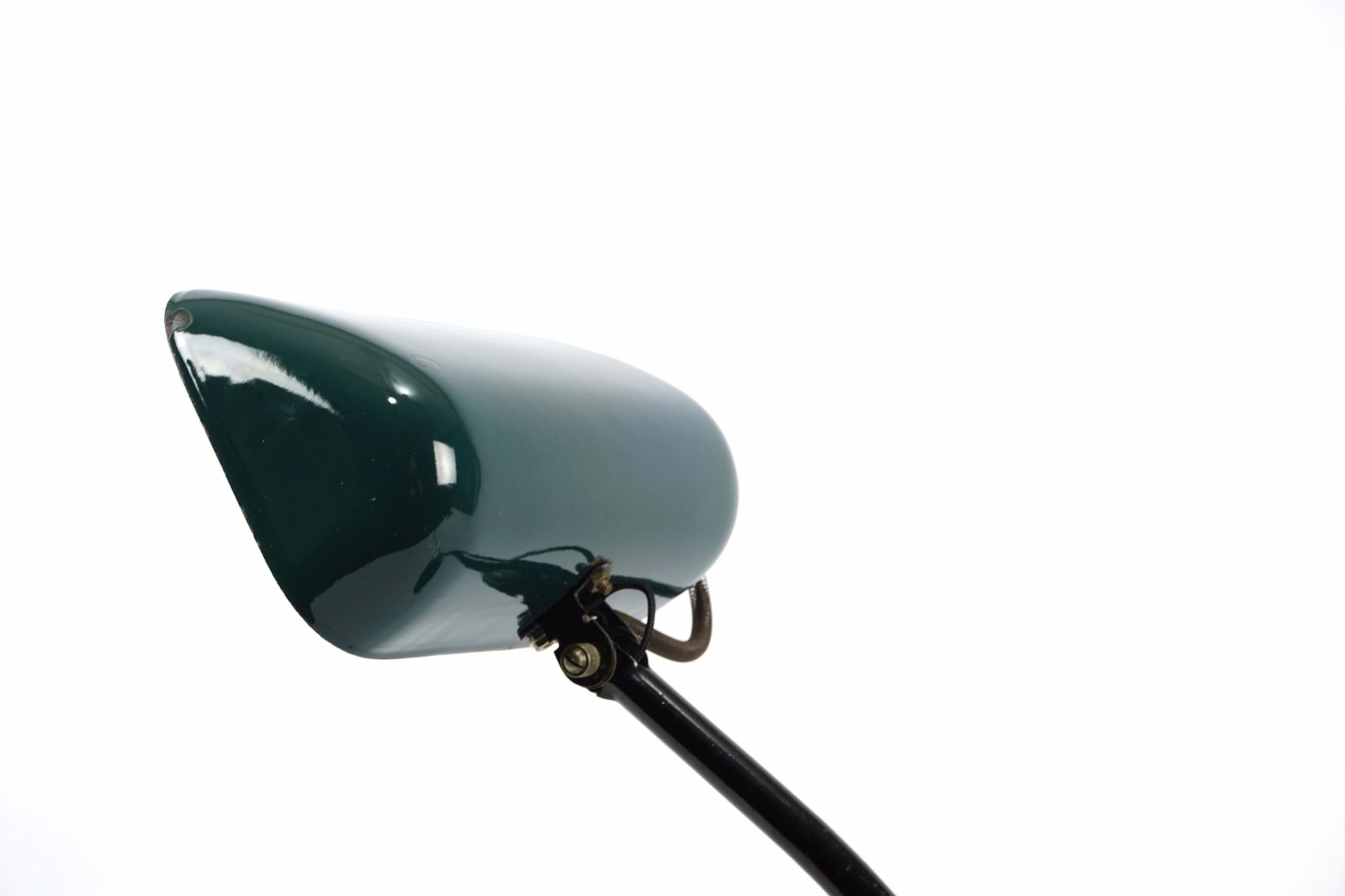 The base with the moveable arm are painted black, while the shade is enamelled in darkgreen and white.