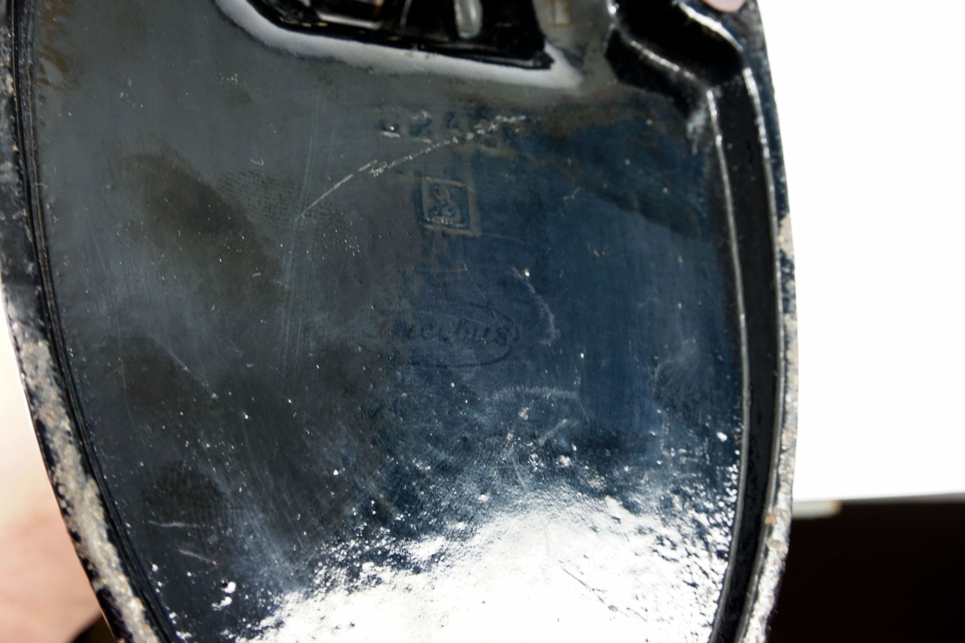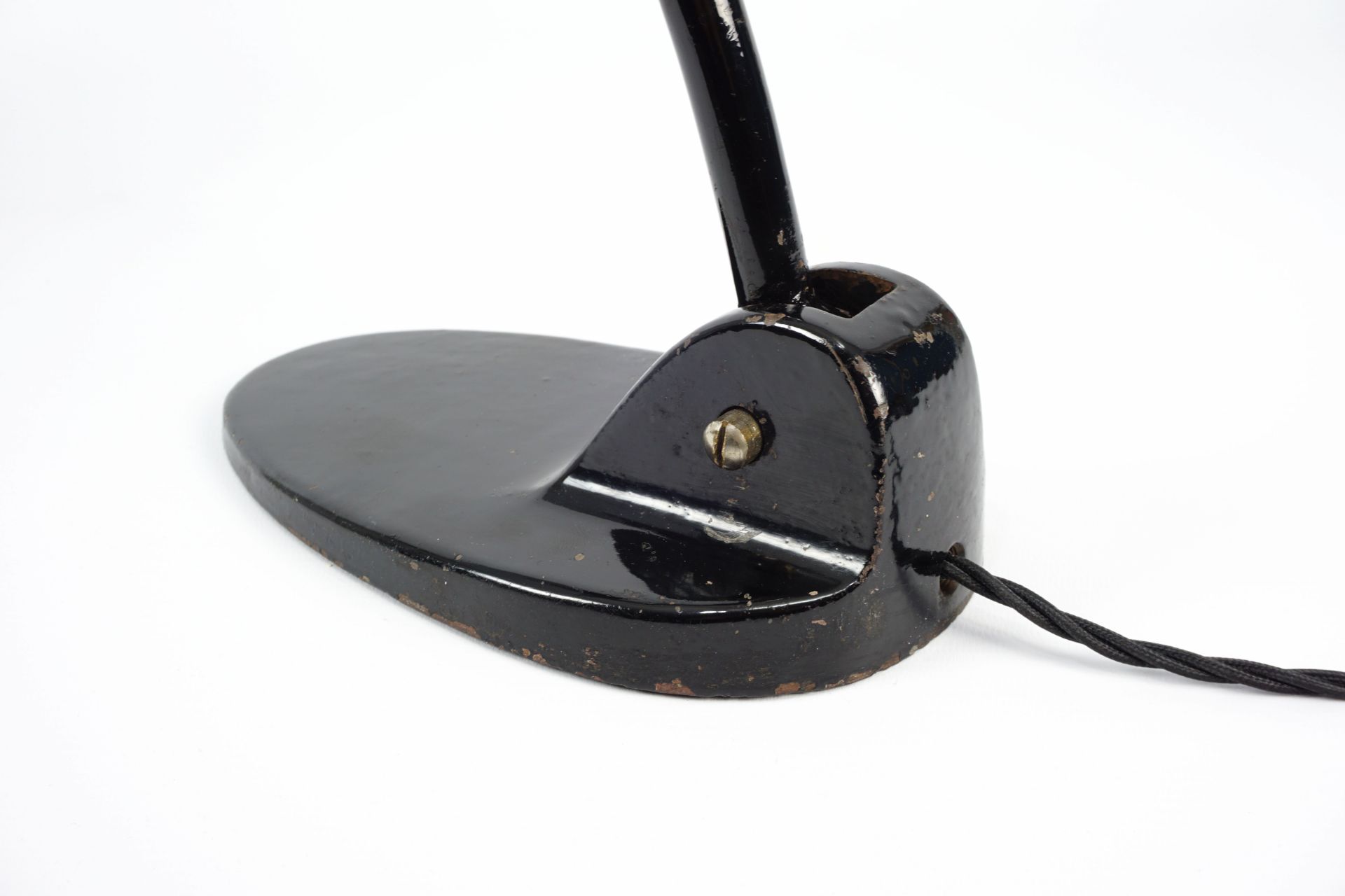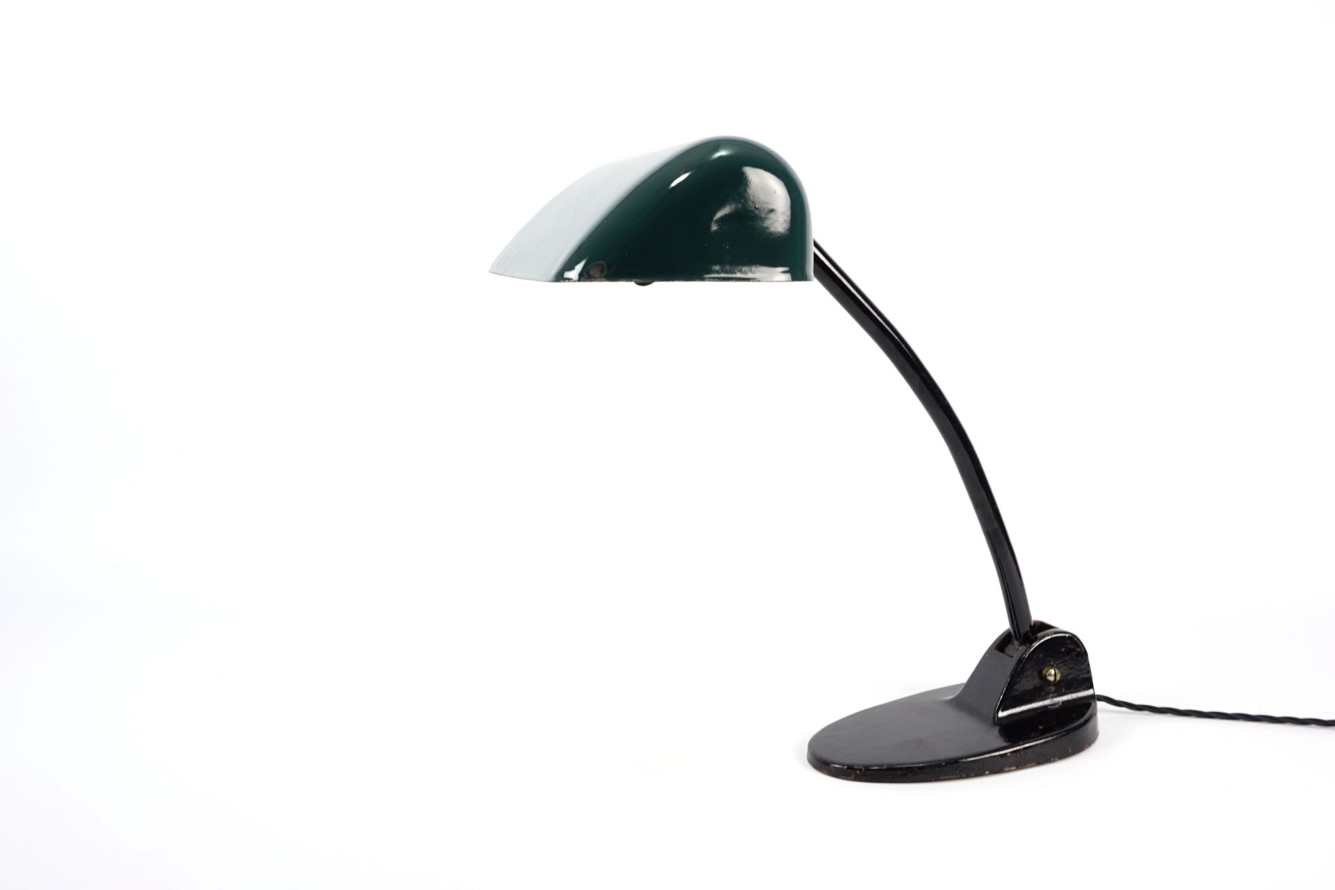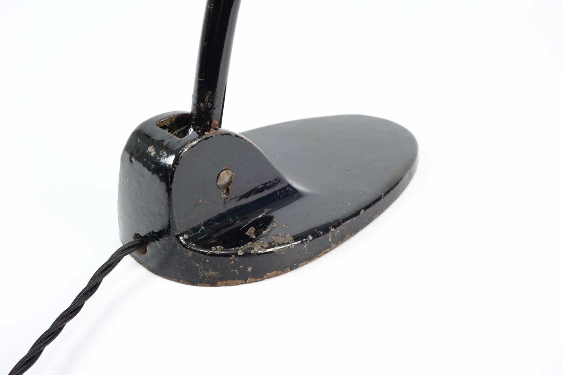 The base with the moveable arm are painted black, while the shade is enamelled in darkgreen and white.