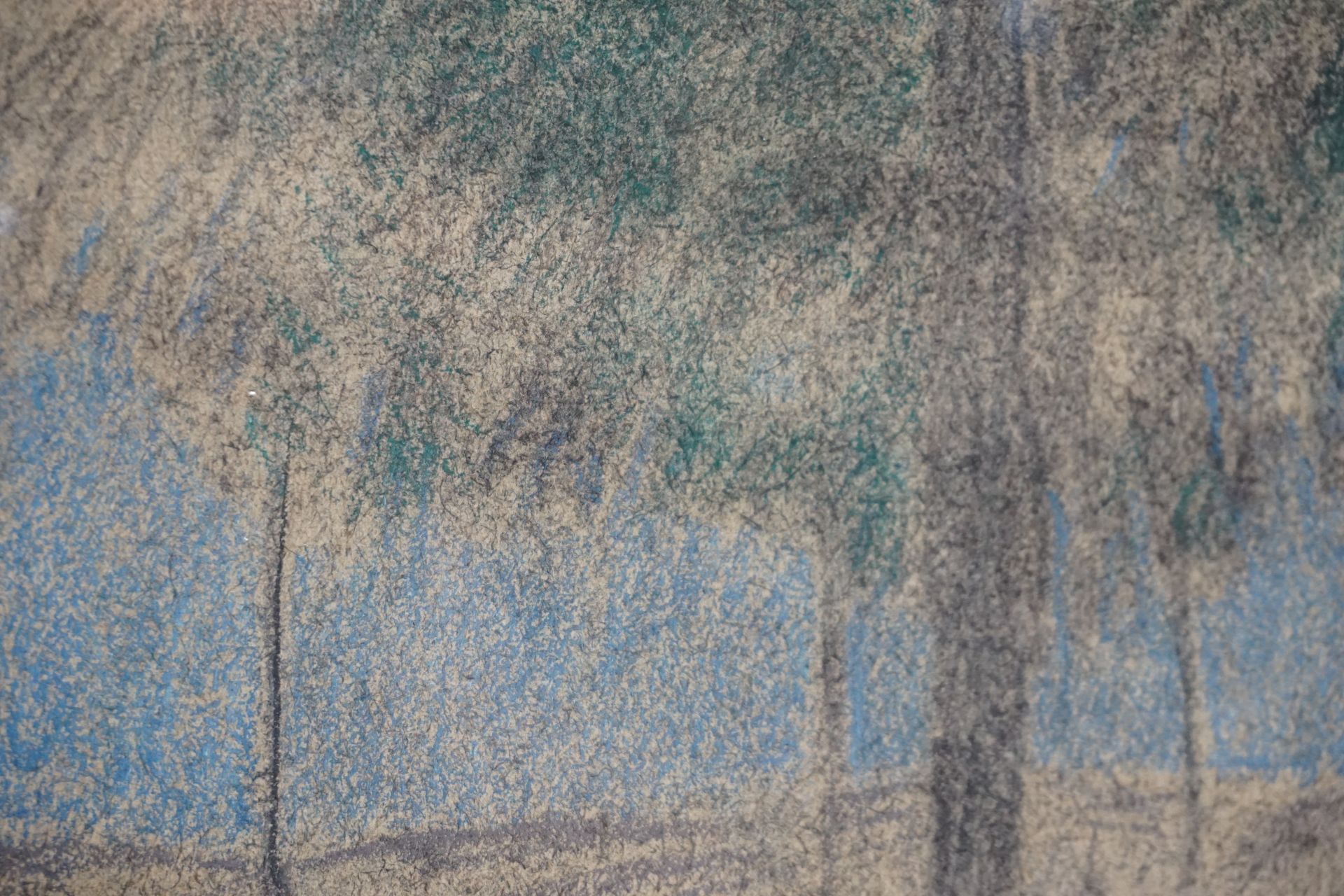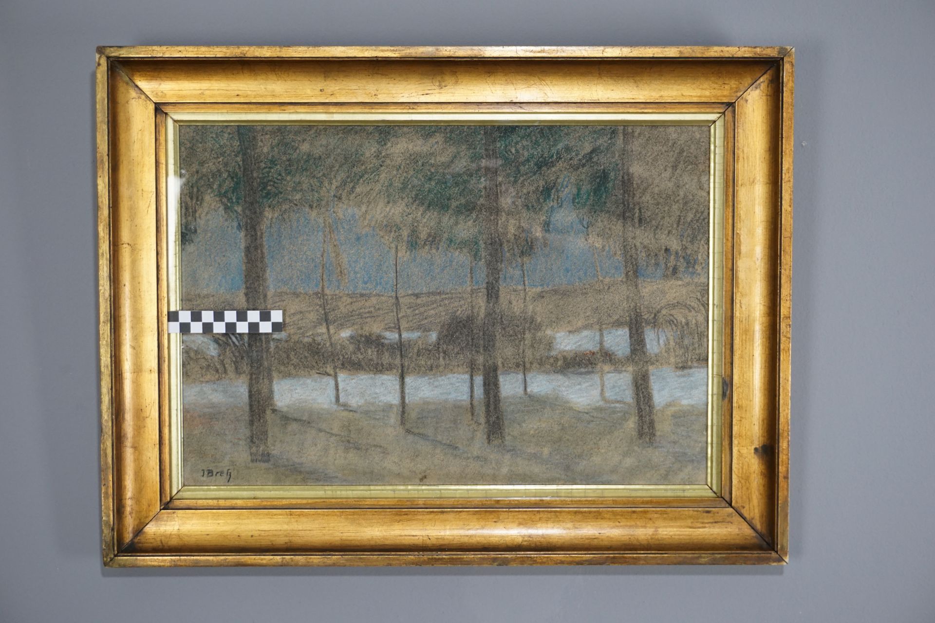 The drawing on greyish cardboard, reduced to a few colours, shows the view from a forest onto a river bank and a small island/green planting in the river.