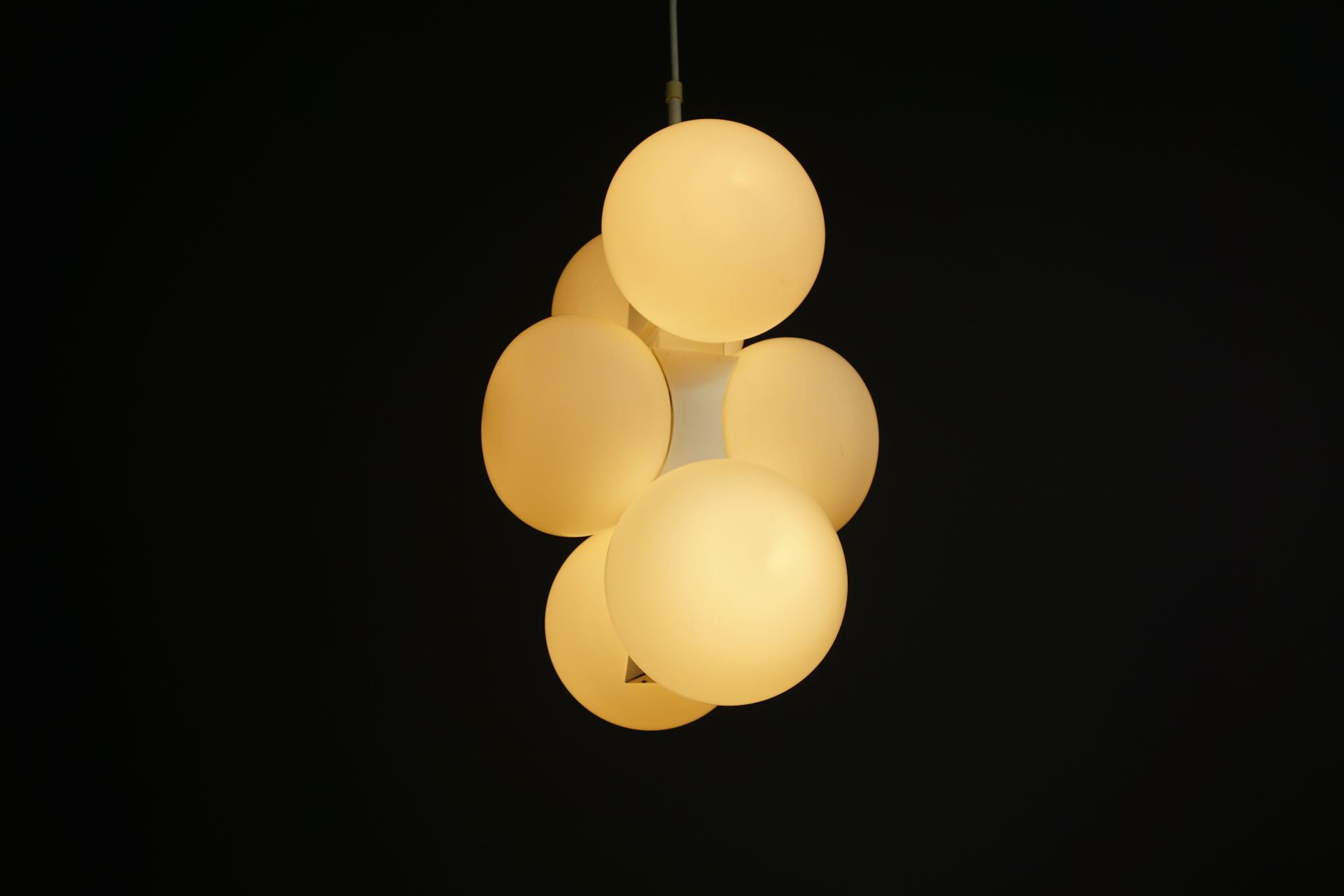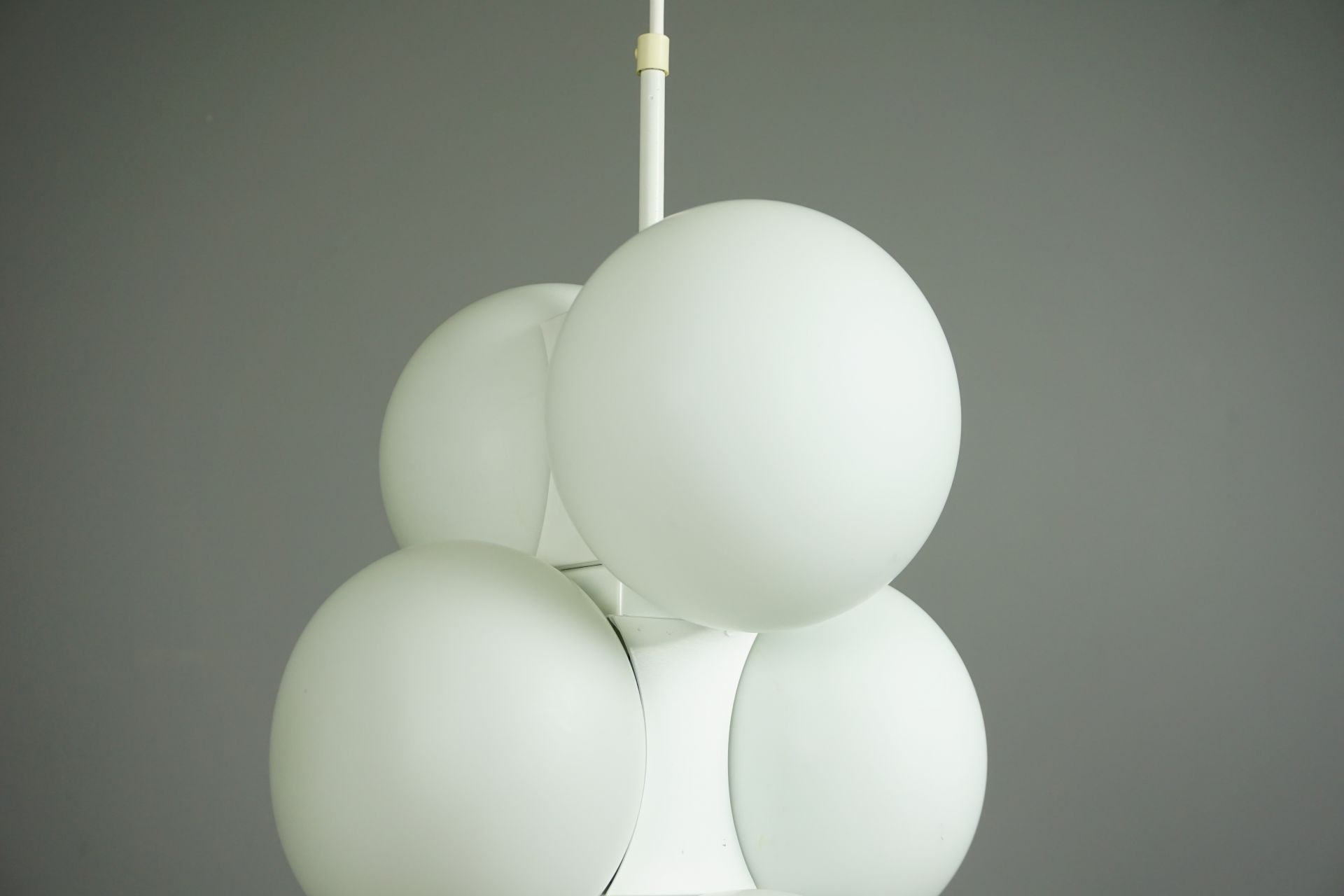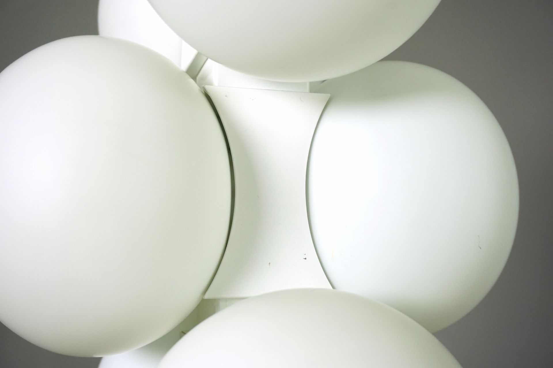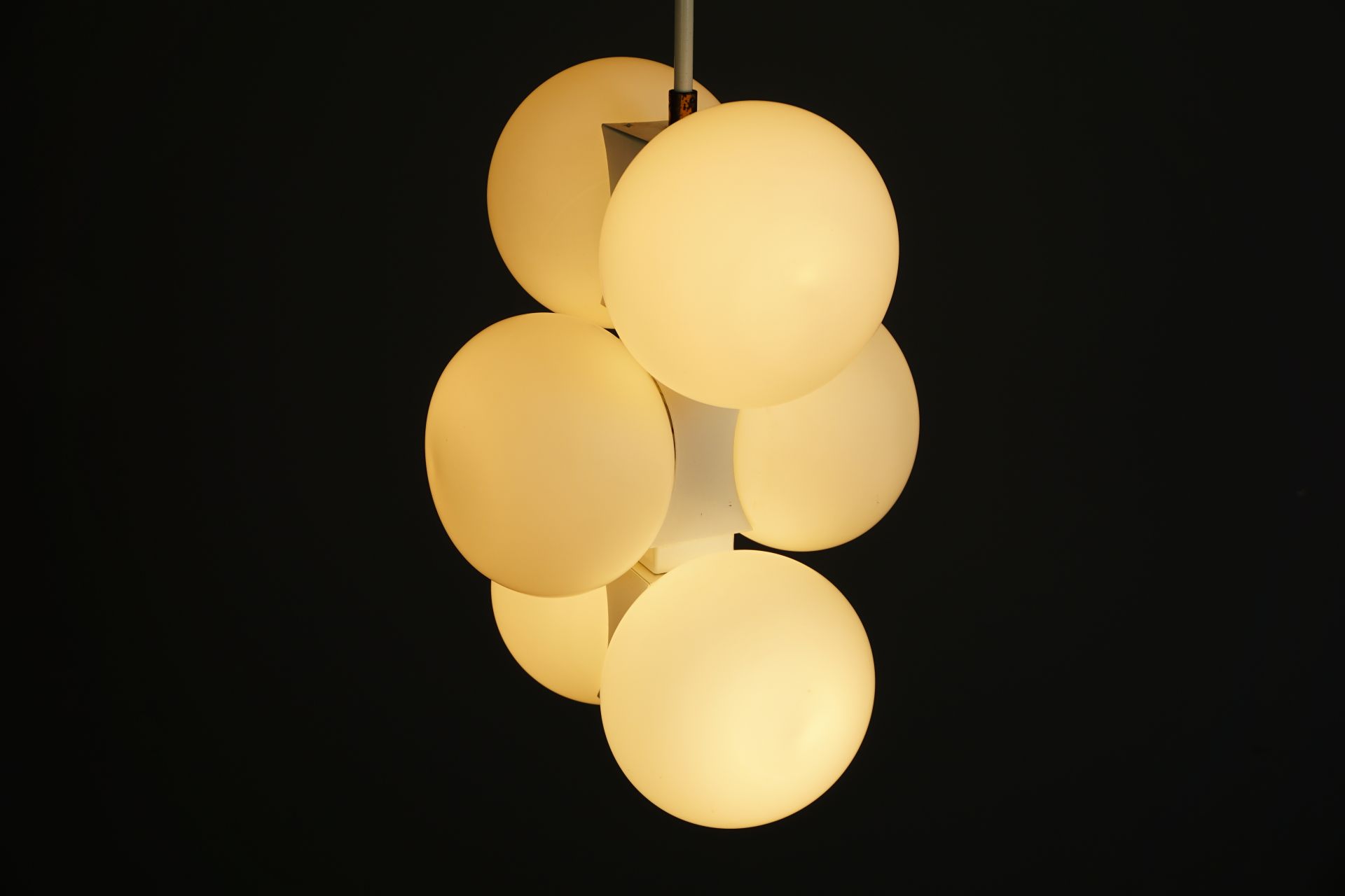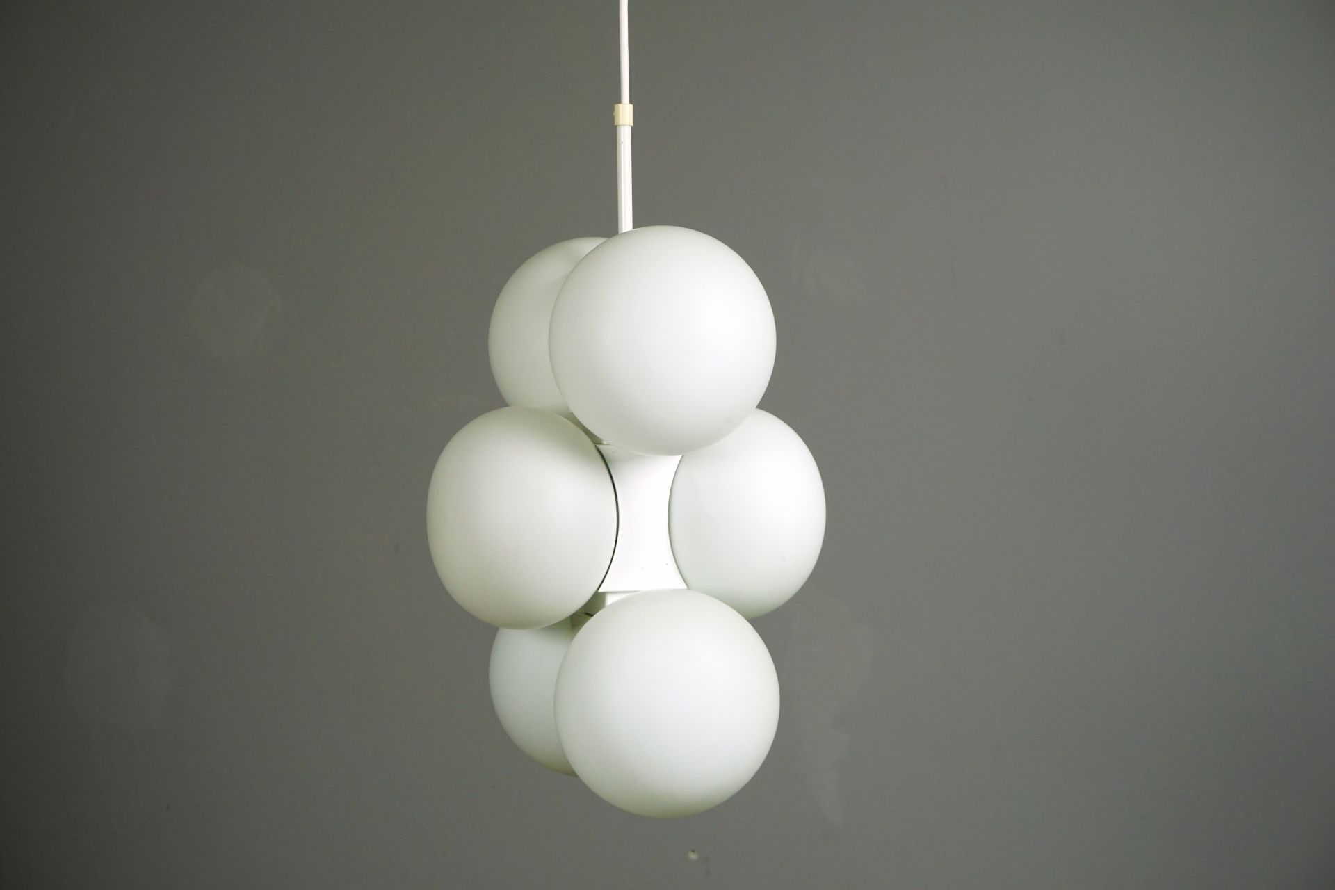 The lamp consists of individual, interconnected building blocks with 6 matt opal glass spheres.