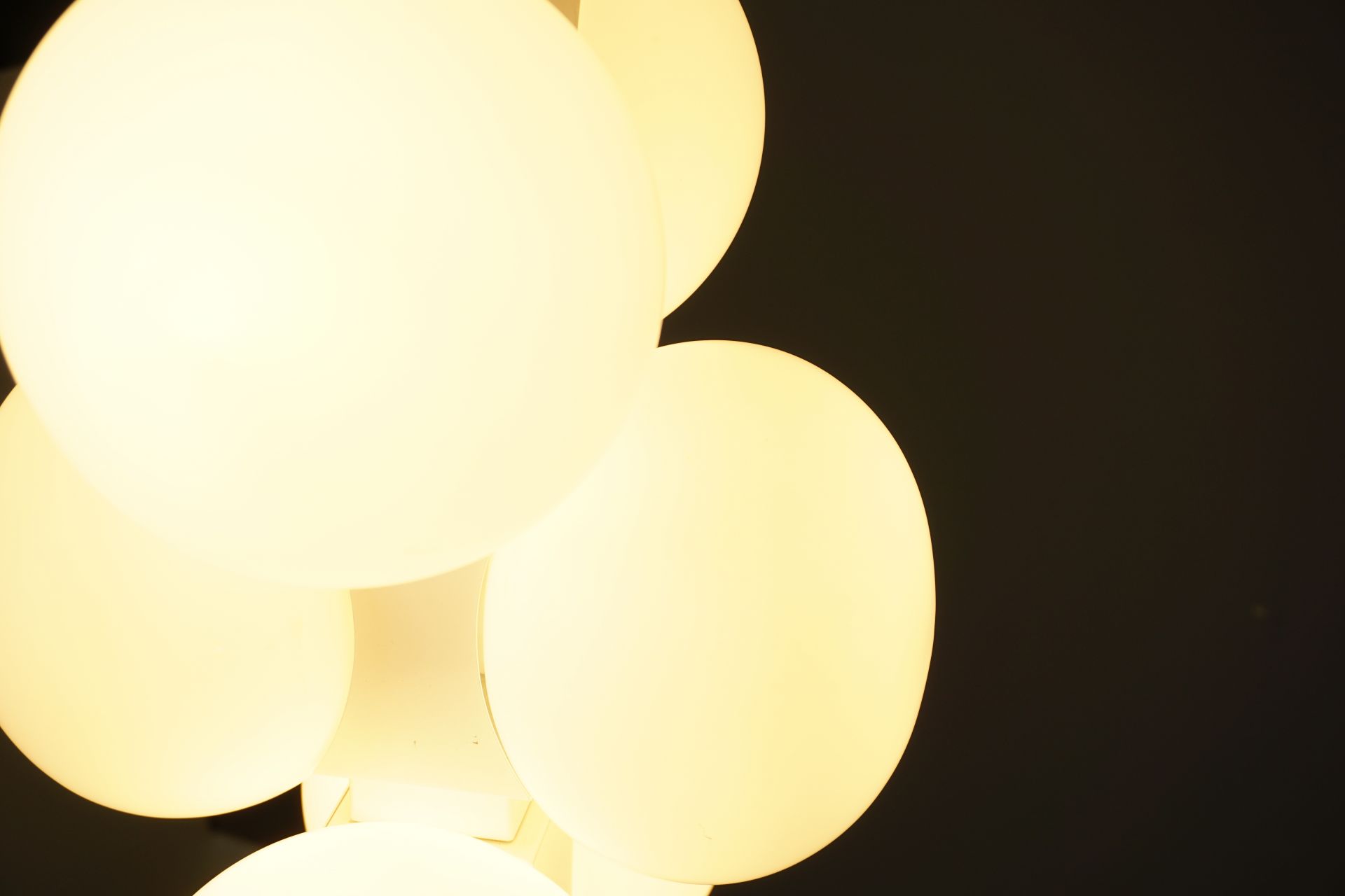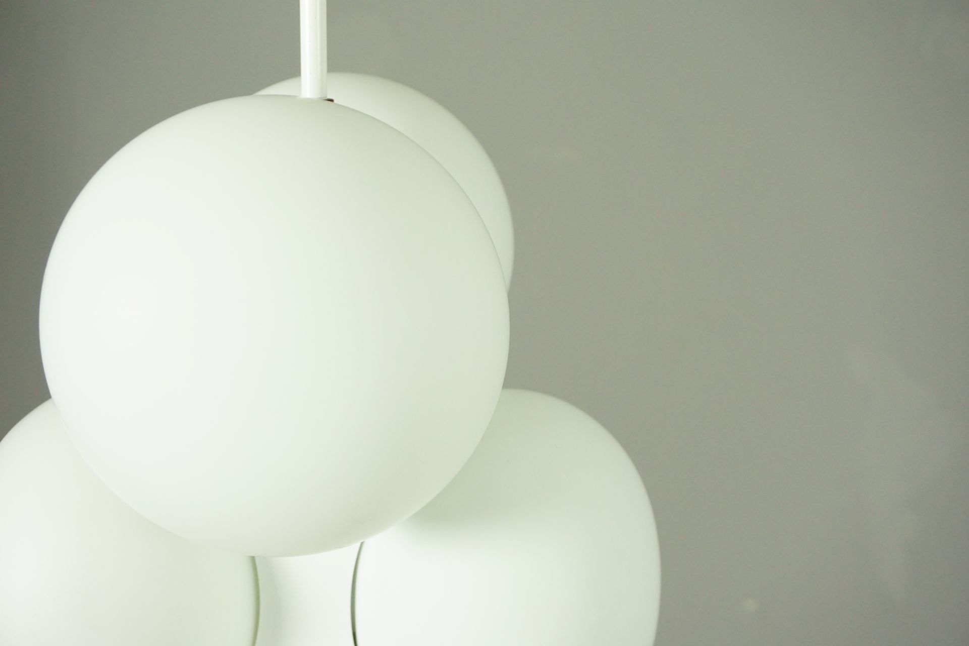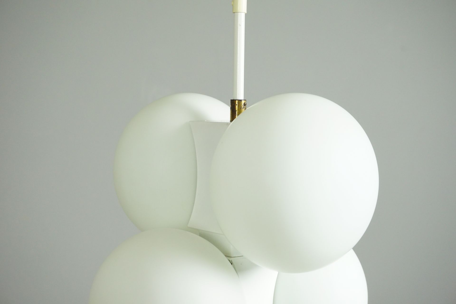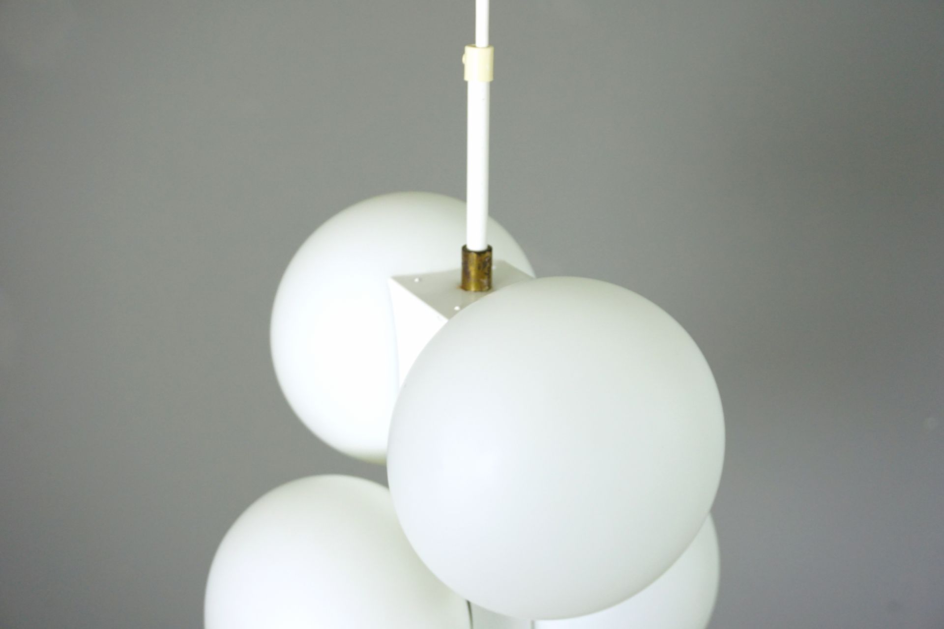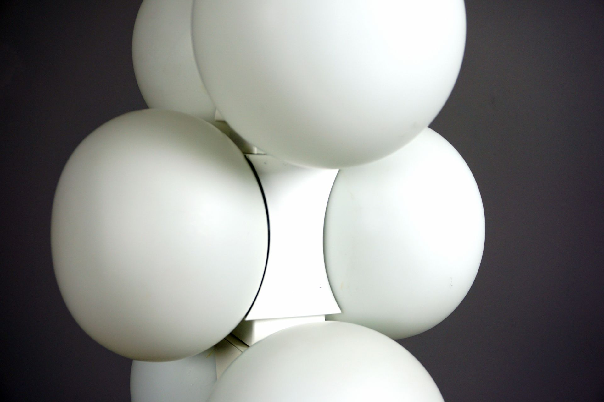 The lamp consists of individual, interconnected building blocks with 6 matt opal glass spheres.
