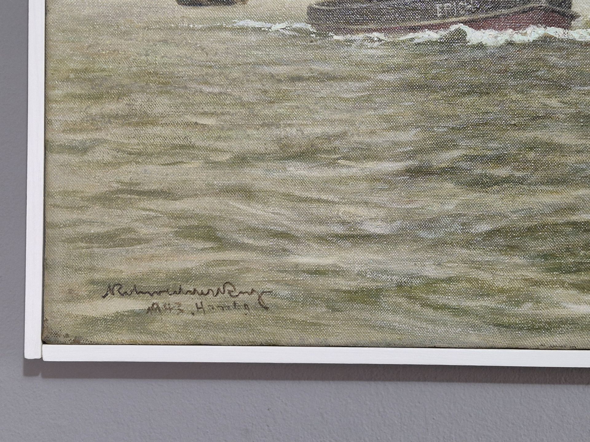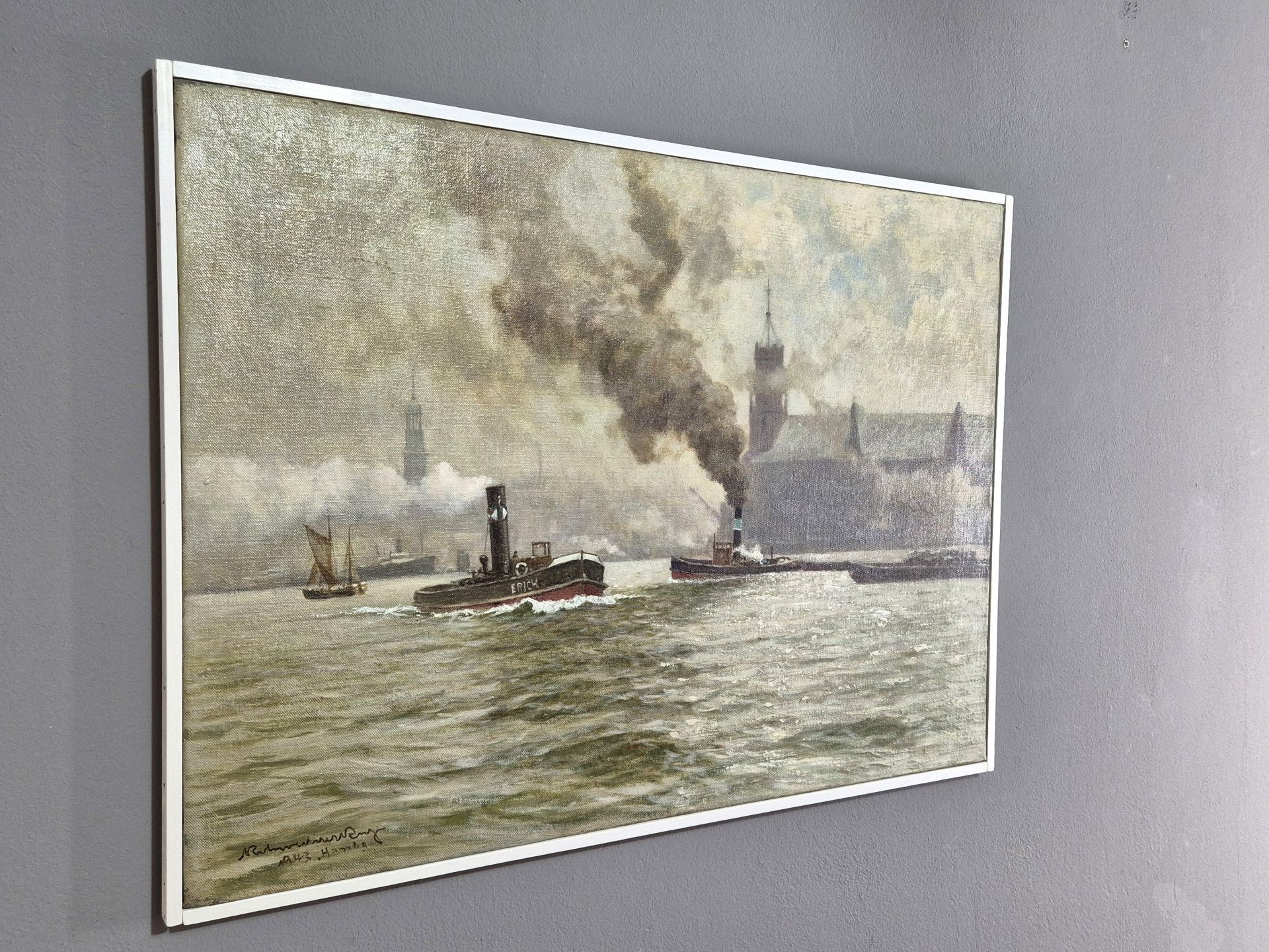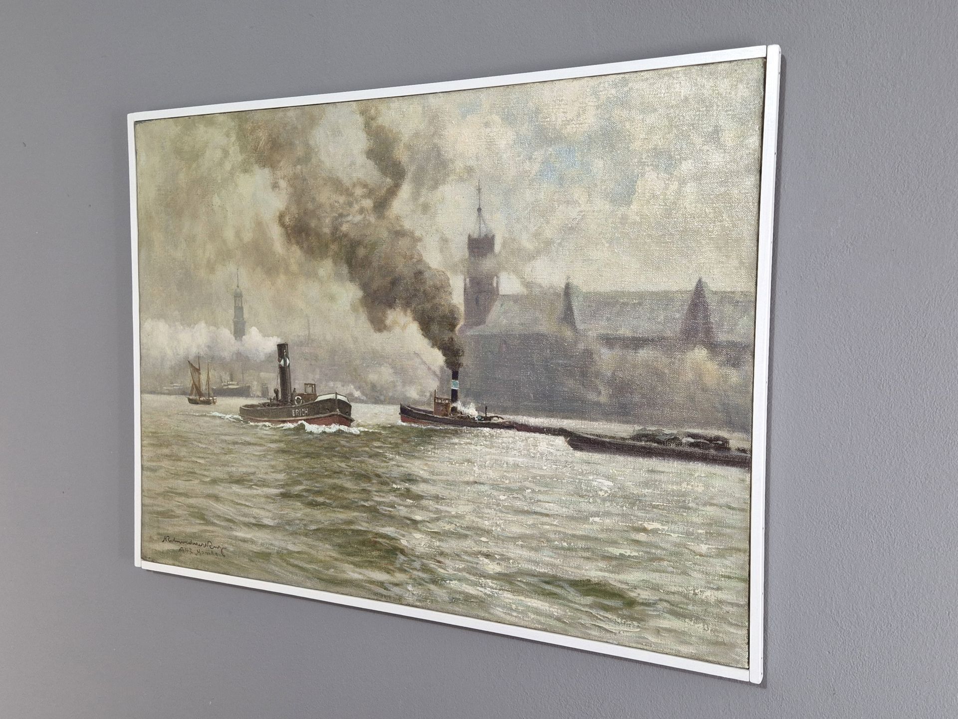 The picture measures 75.5 x 55 cm and is framed with a simple, timeless white wooden studio frame. With this, the total size is 78 x 57.5 cm. Here it is up to the buyer to use a different frame according to their own preference. We think the simple frame is appropriate and timeless. It suits both modern and antique furnishings. The picture is signed "KRohwedderRuge 1943 Hambg" at the bottom left. Rohwedder Ruge has also titled the picture "Hamburg Hafen/ Kehrwiederspitze" on the wedgewood frame on the back. Very good condition. Careful restoration in the form of cleaning and removal/renewal of the varnish layer. Any bright spots are light reflections and not defects in the painting.