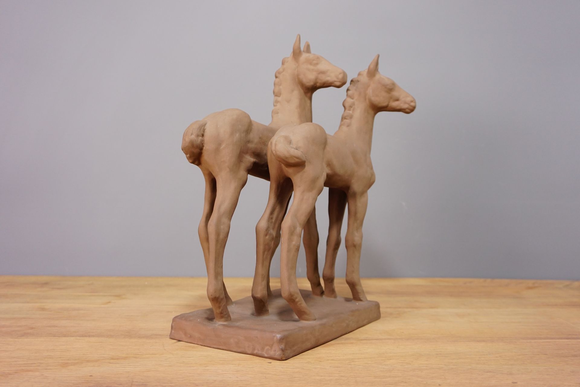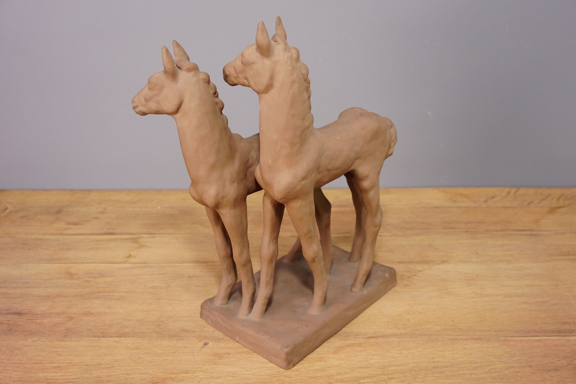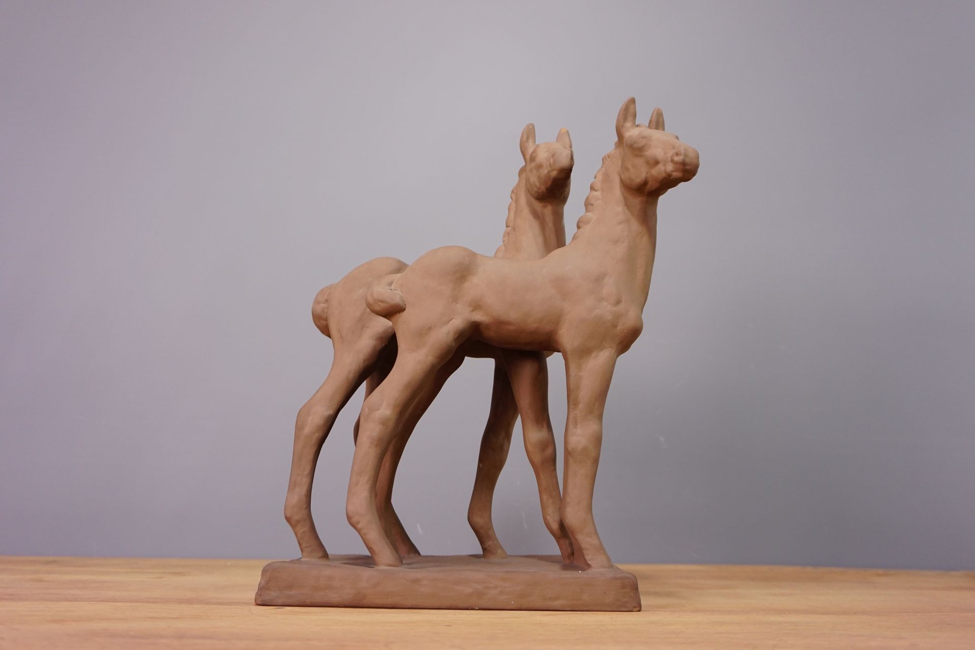 Beautiful monochrome ceramic sculpture of two young horses/foals.