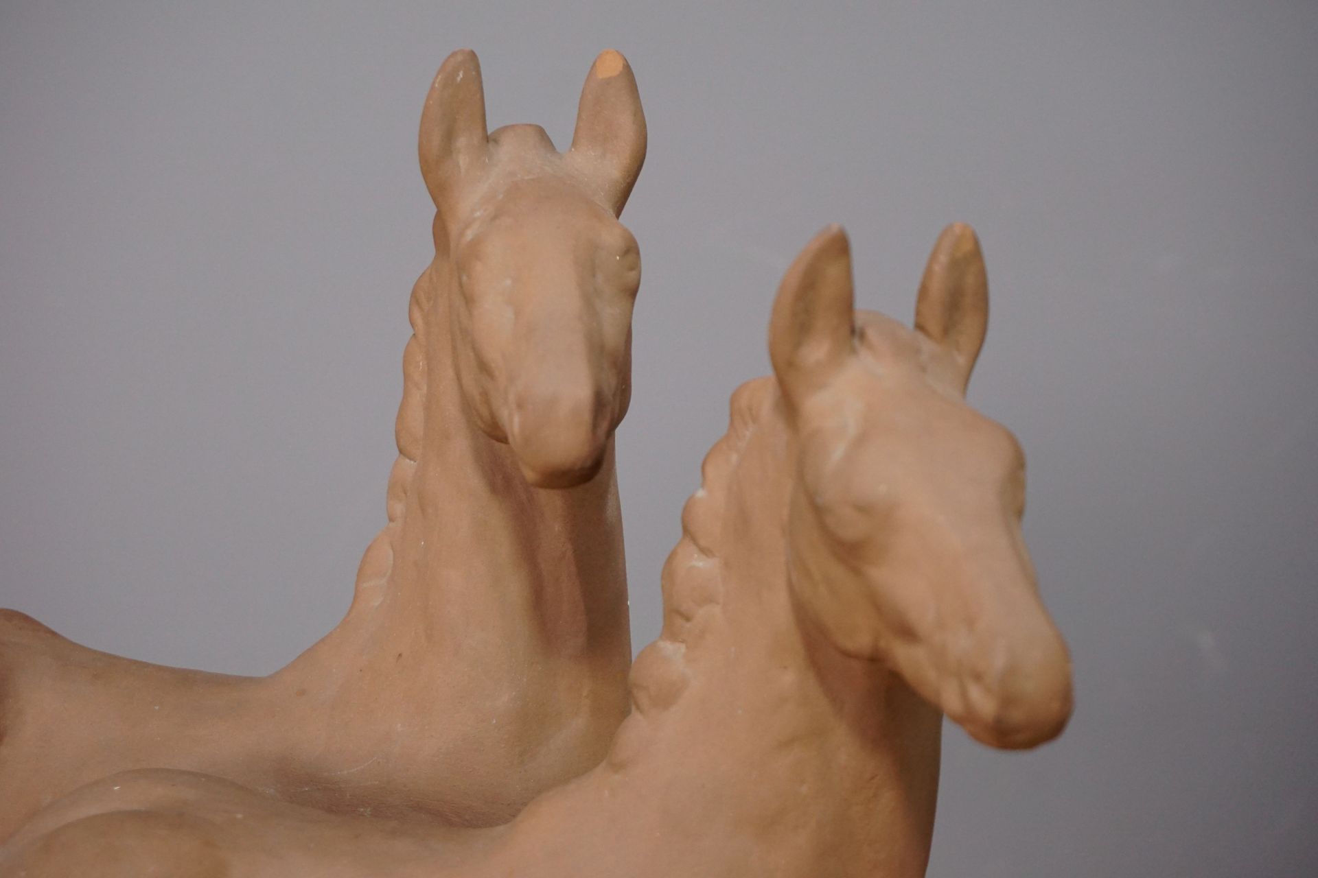 The horses stand side by side, slightly offset, on a rectangular plinth with an alert, inquisitive attitude and their heads raised. Very plastic and lifelike shape.