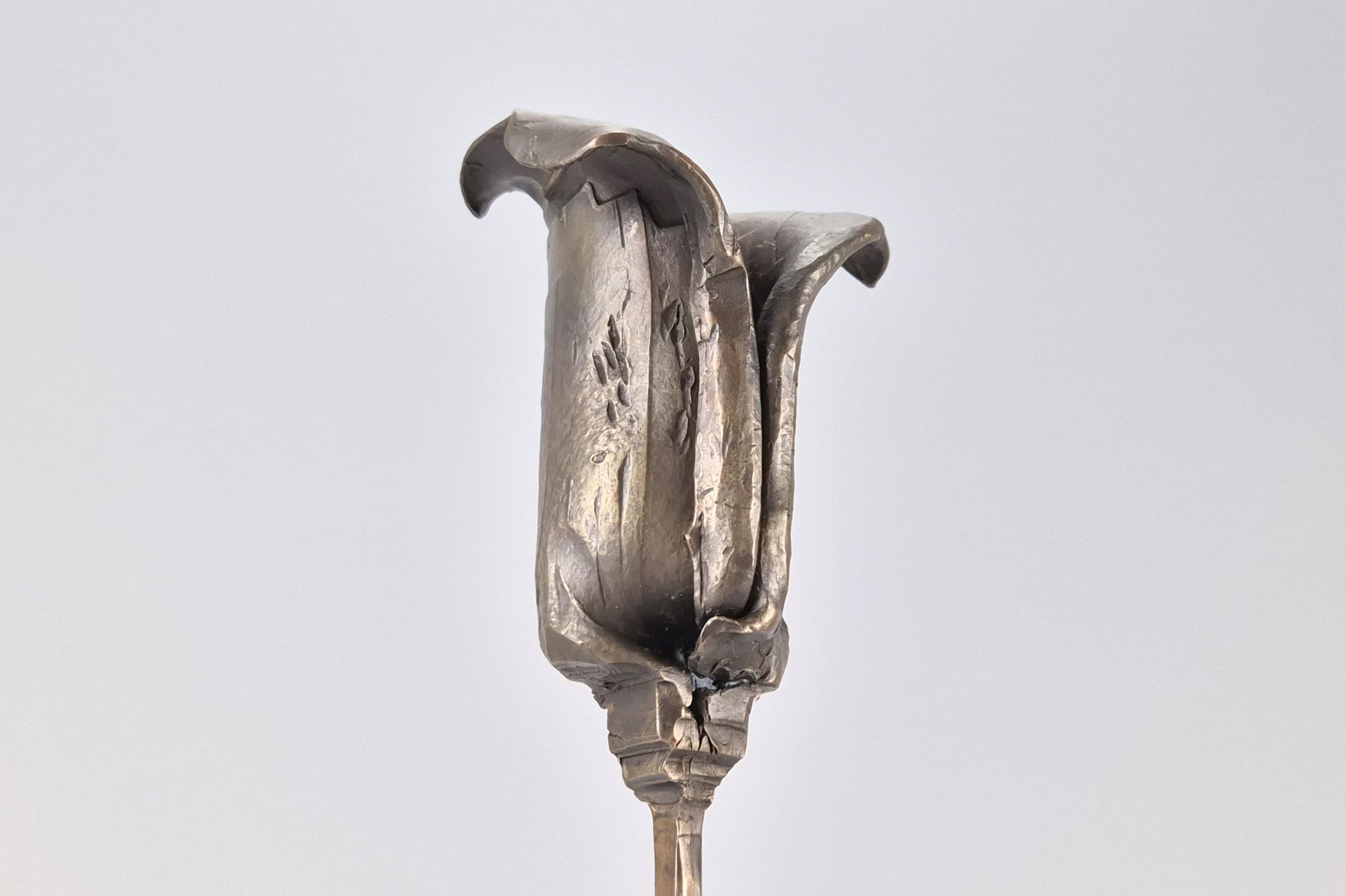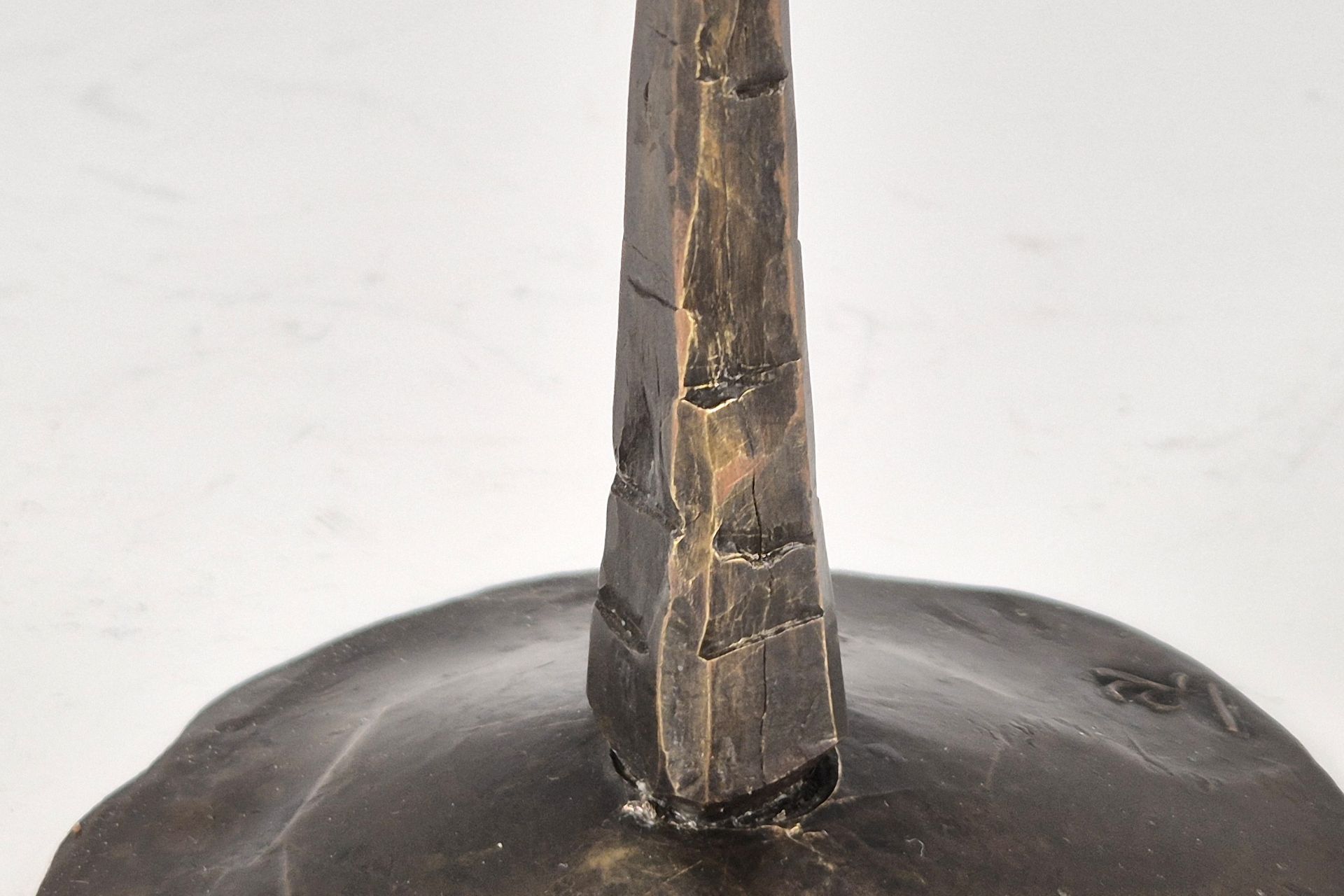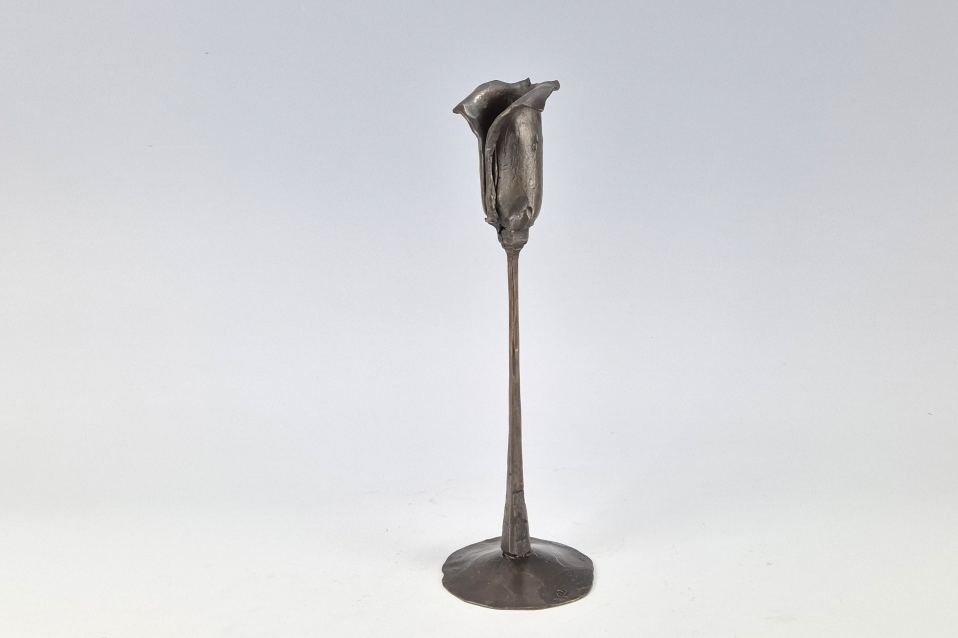 Candlestick No. 1 is made of bronze in the brutalist style, has a round base, a square tapered stem, and a bud that opens like a rose, in which you can place the candle.