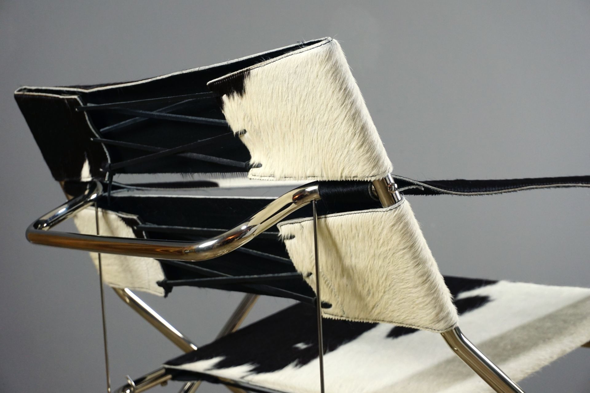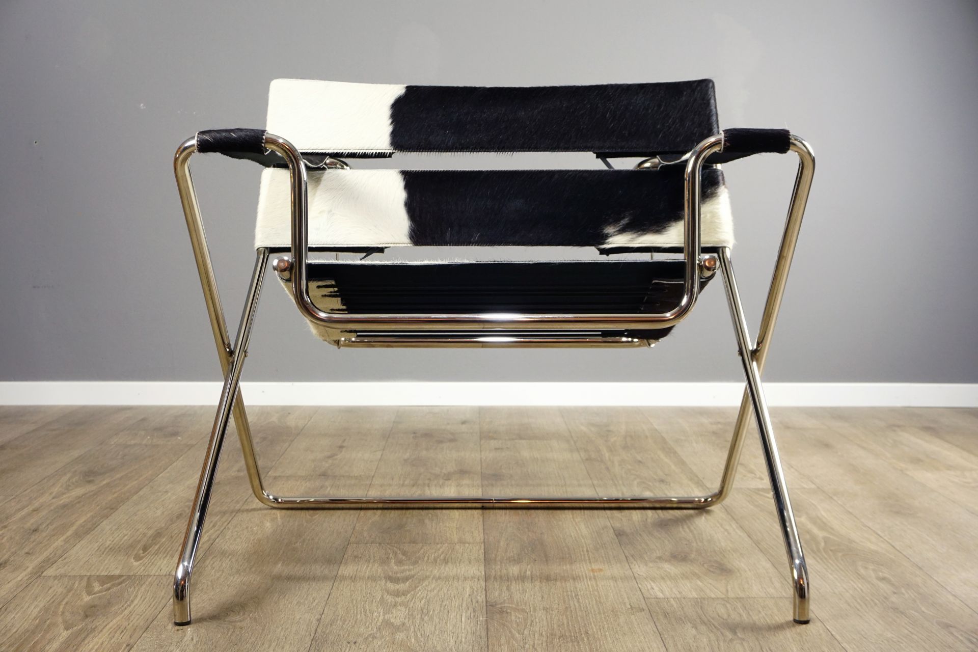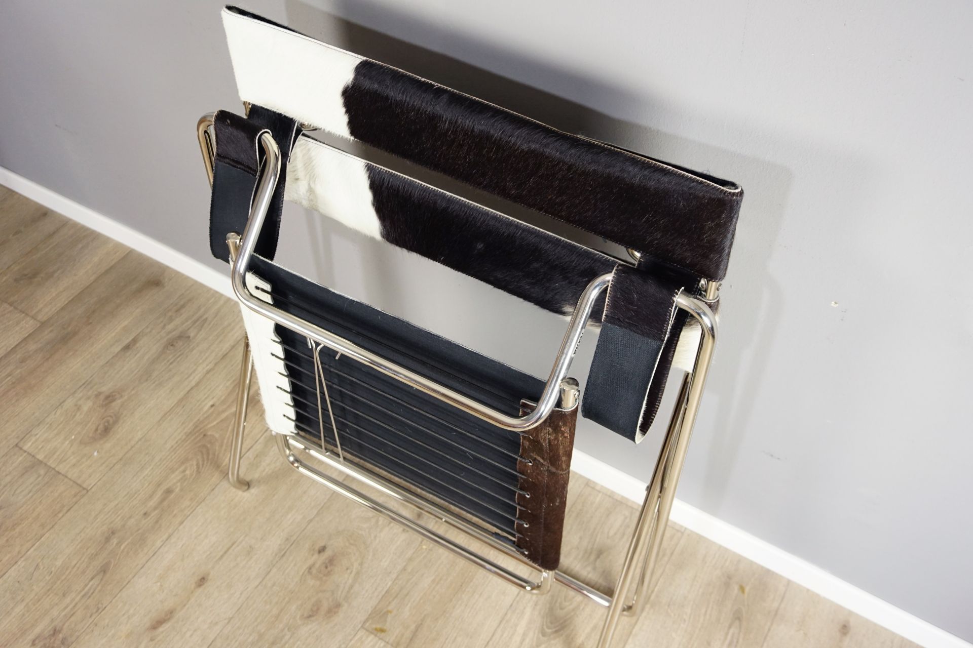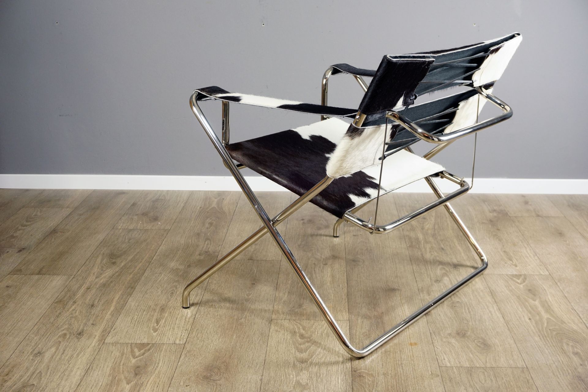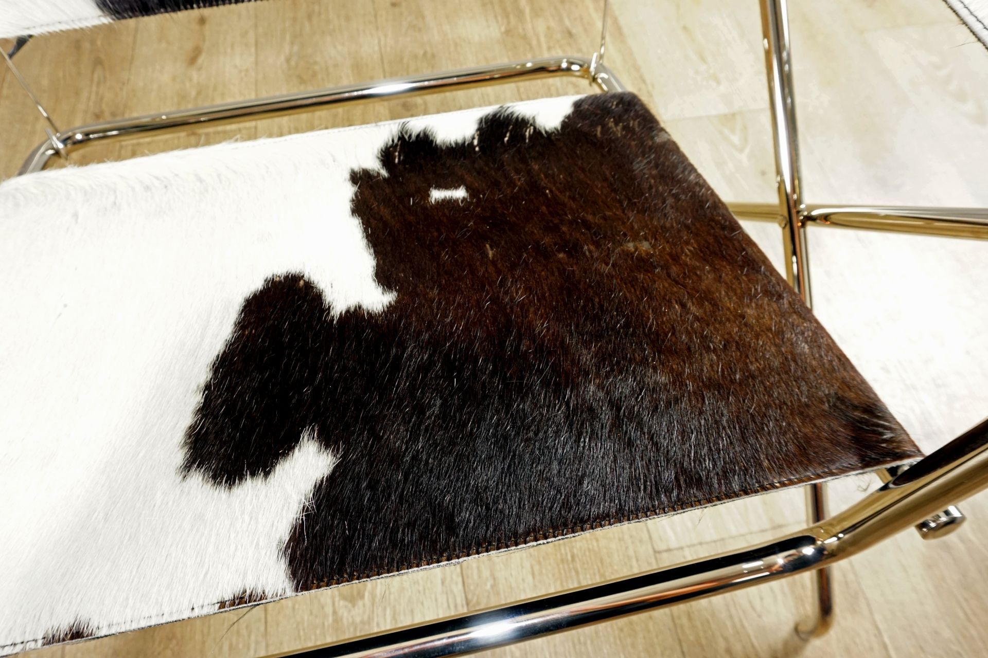 In addition to the design itself, the version offered here impresses with its combination of nickel-plated steel tube and cowhide. In contrast to chrome, nickel plating is visually warmer and also authentic, as the slightly brighter, whiter/colder chrome which came onto the market around 1930. Thanks to the cowhide in white/brown/black, each model is unique.