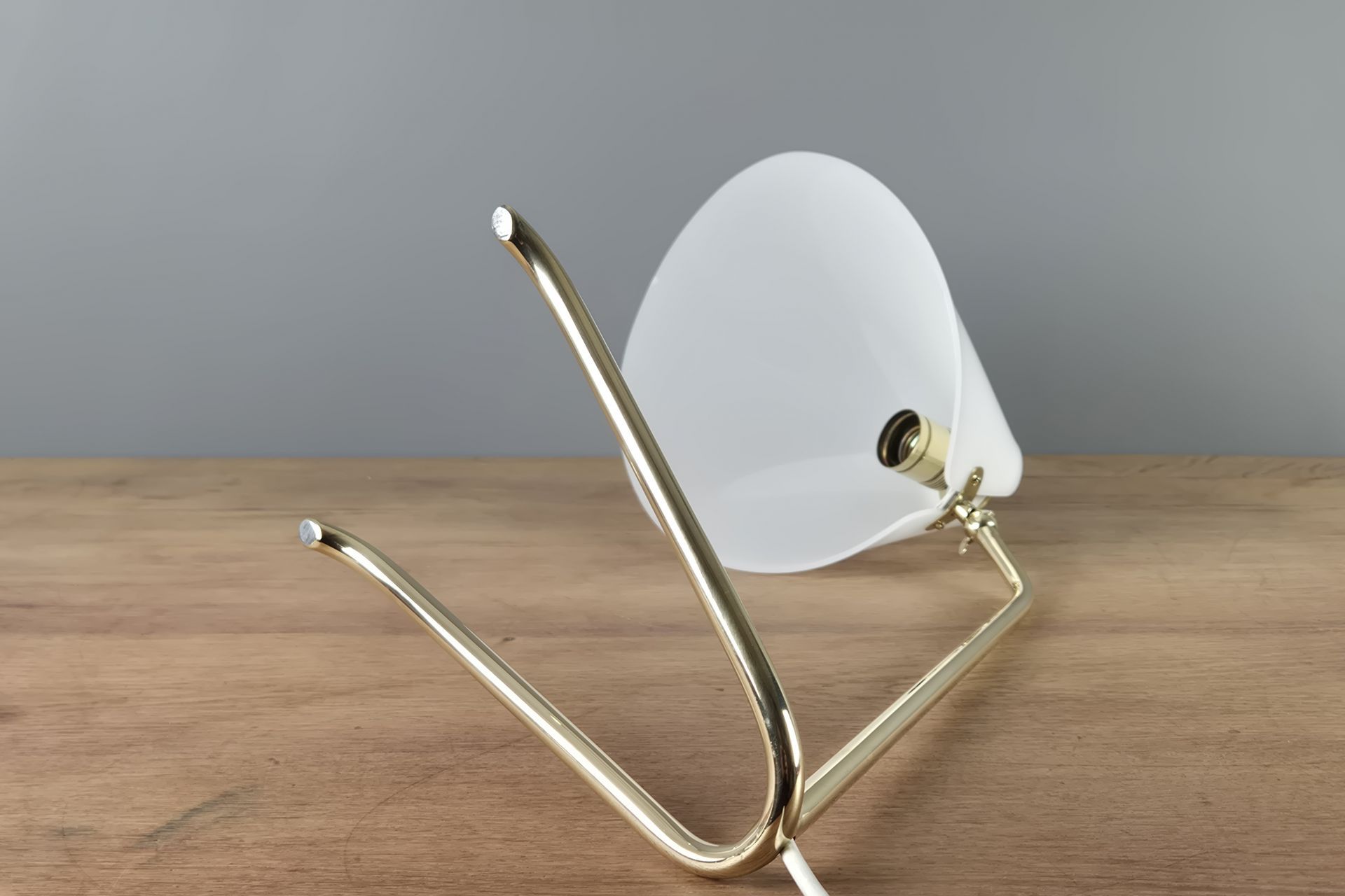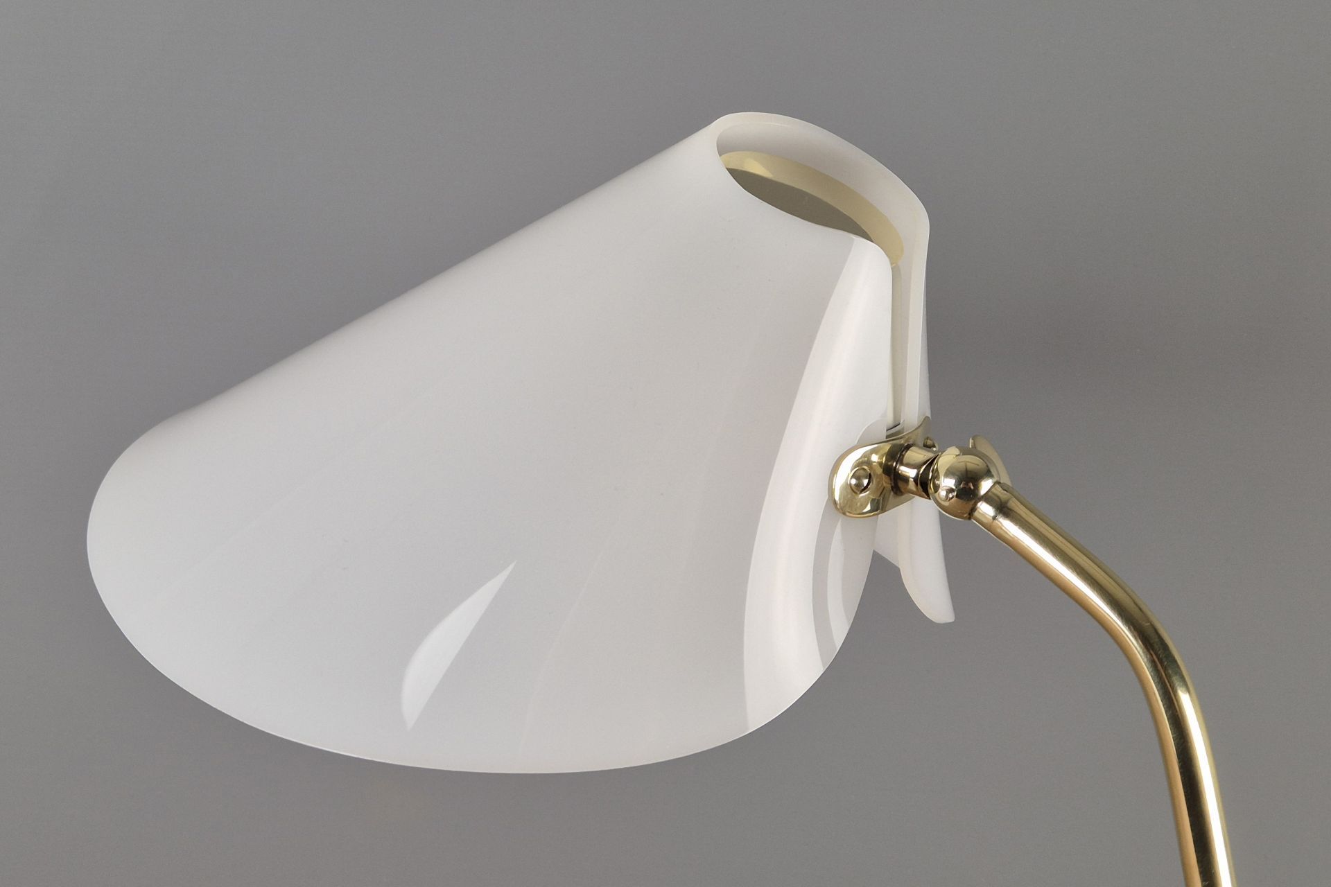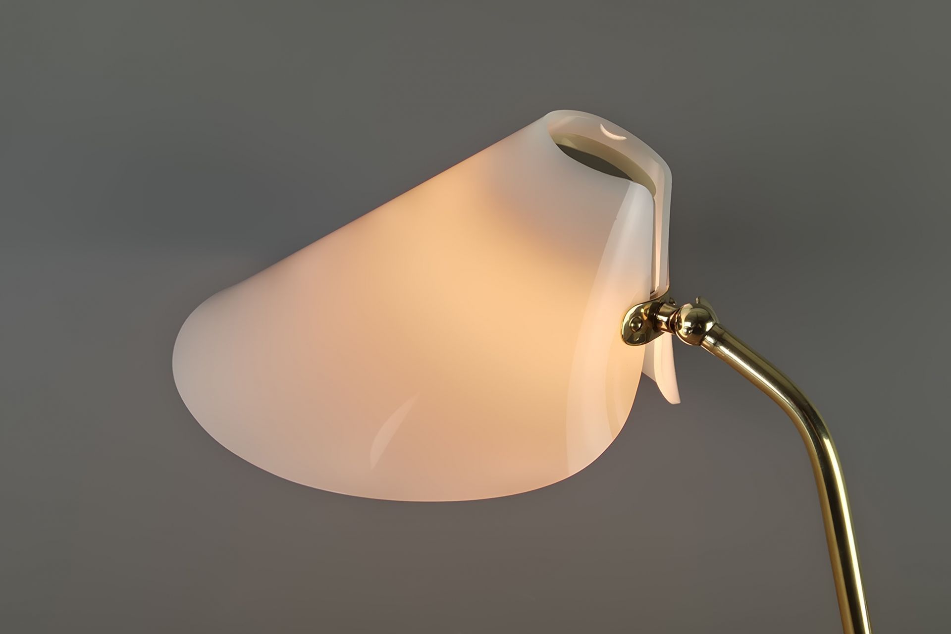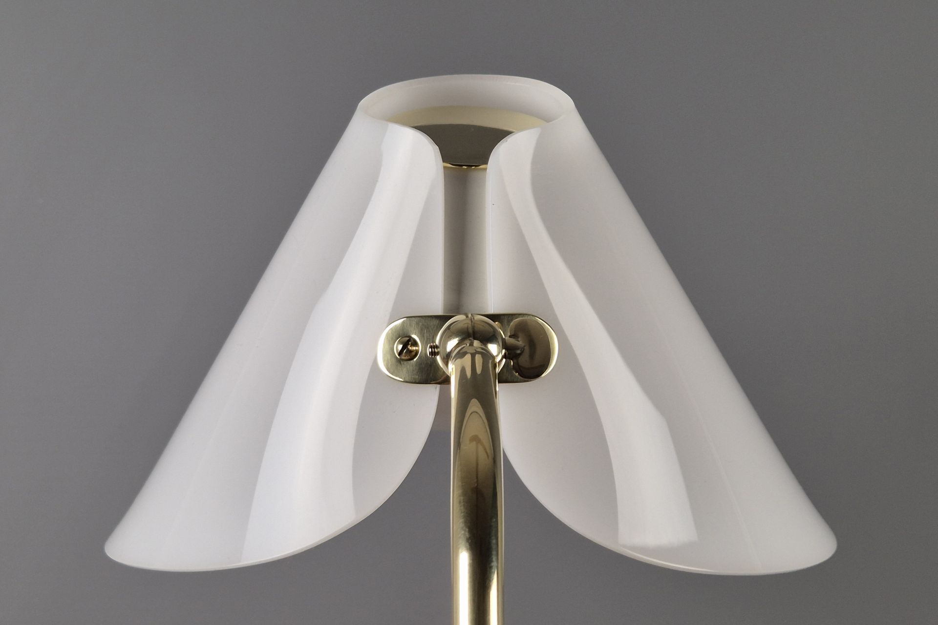 The choice of materials and form is very understated, yet beautifully designed, and its graceful construction gives it a visually light appearance. The V-shaped, slightly wavy base is fixed to the arm. A small joint and wing nut create a movable connection to the white, sail-shaped shade.