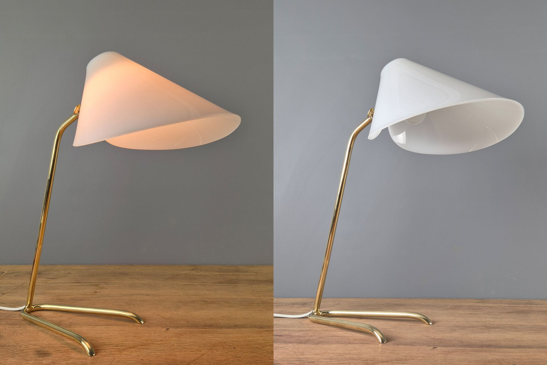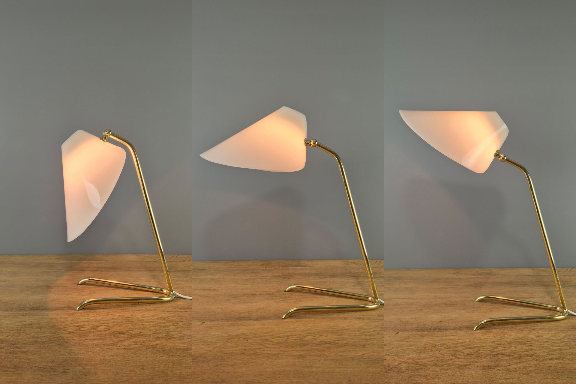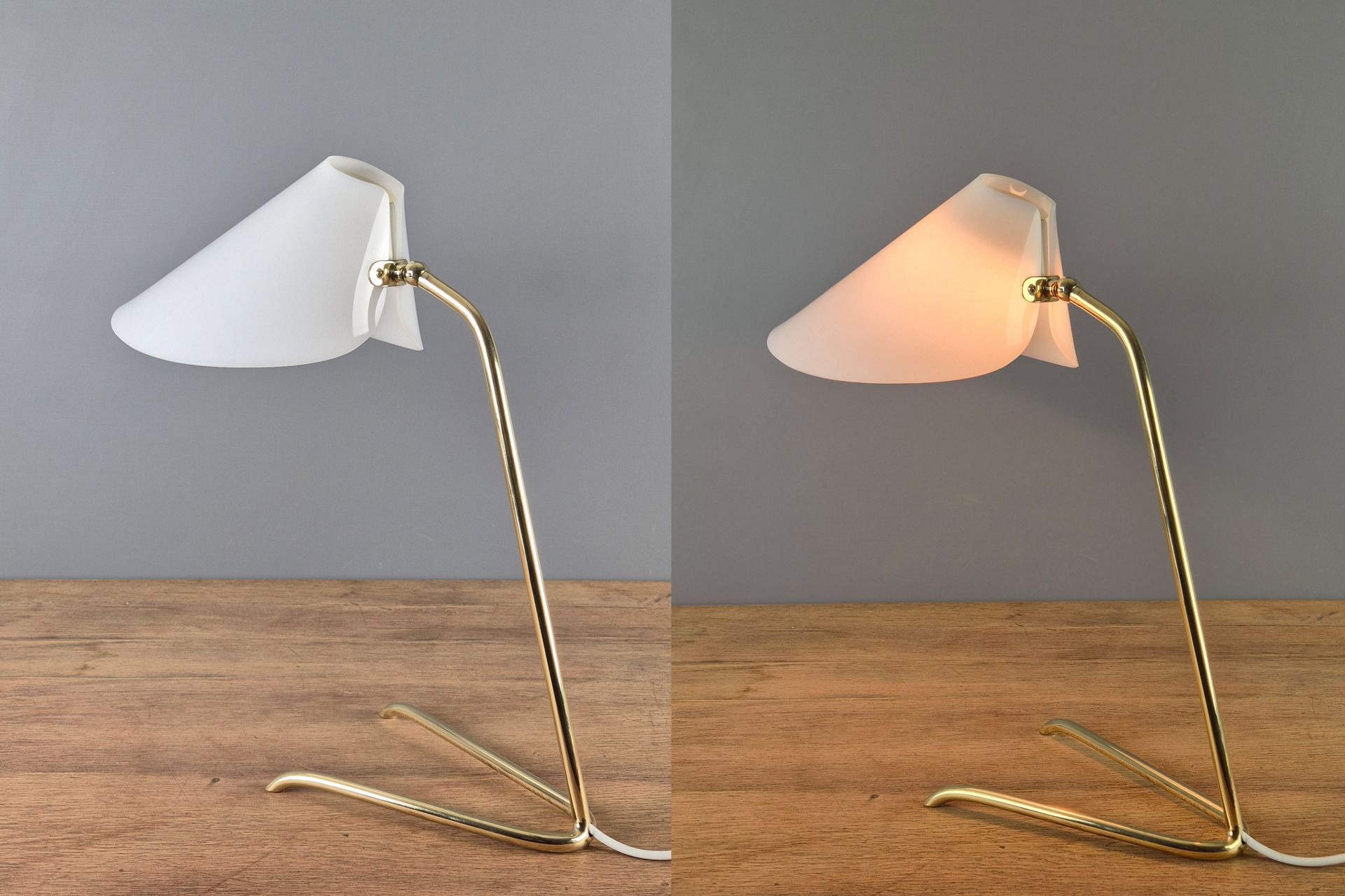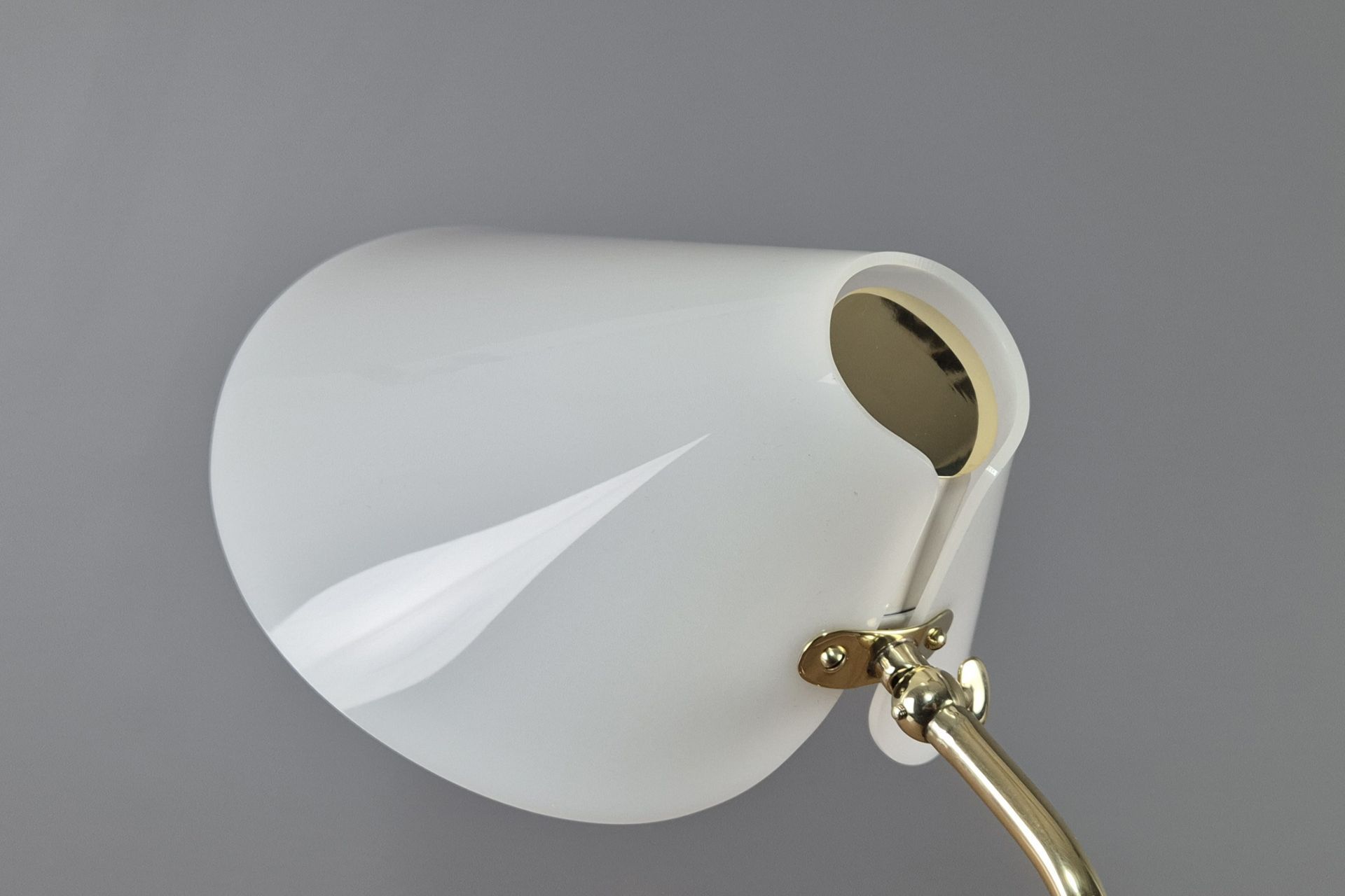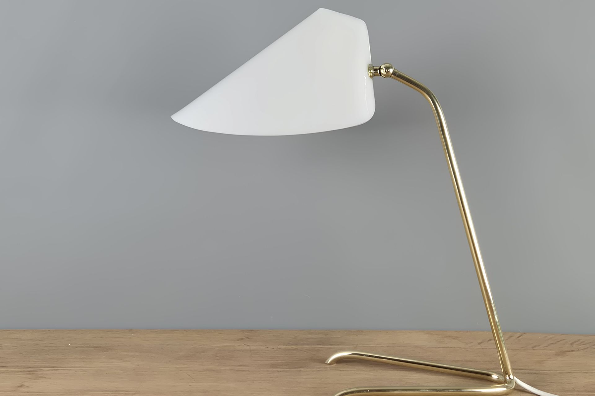The choice of materials and form is very understated, yet beautifully designed, and its graceful construction gives it a visually light appearance. The V-shaped, slightly wavy base is fixed to the arm. A small joint and wing nut create a movable connection to the white, sail-shaped shade.