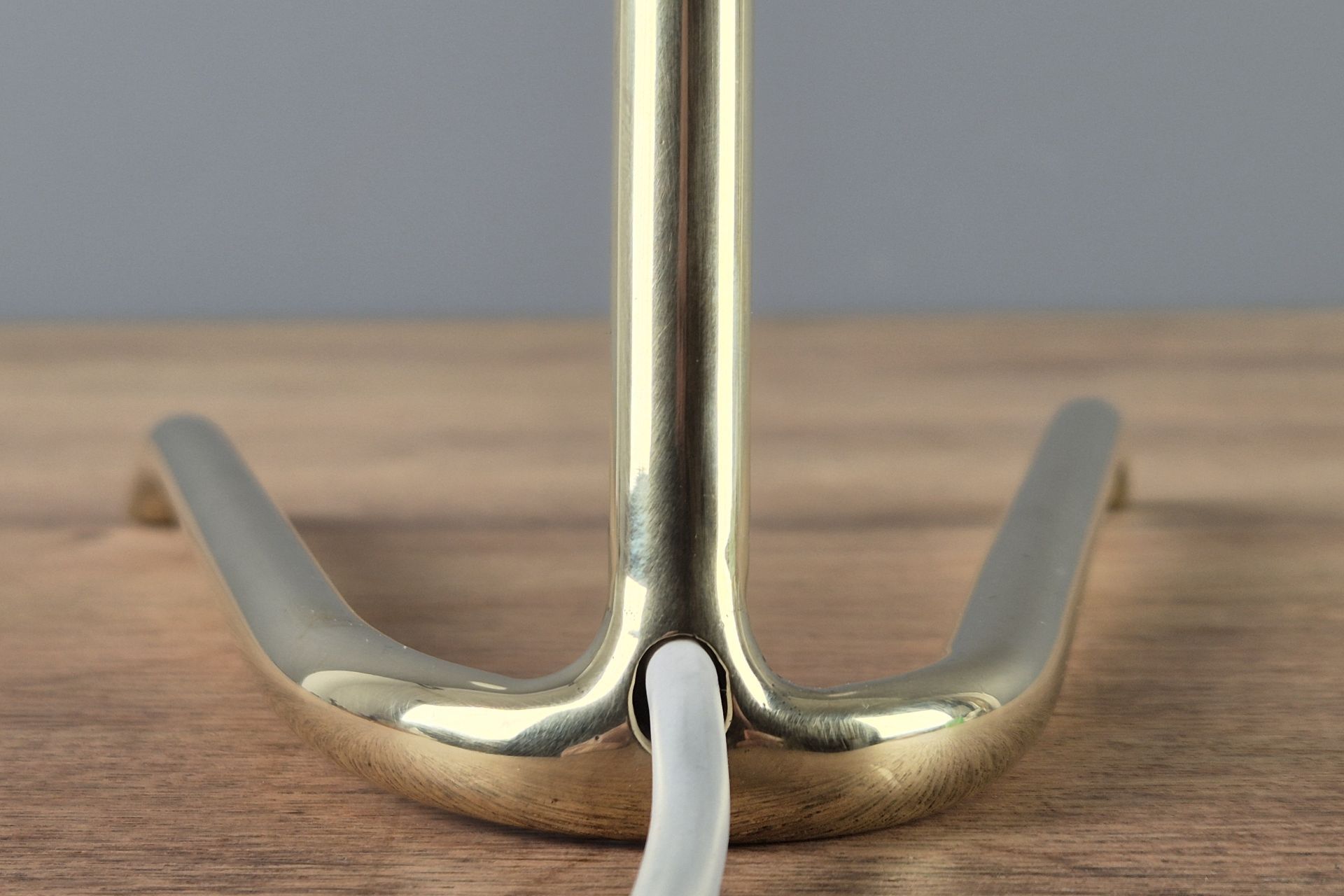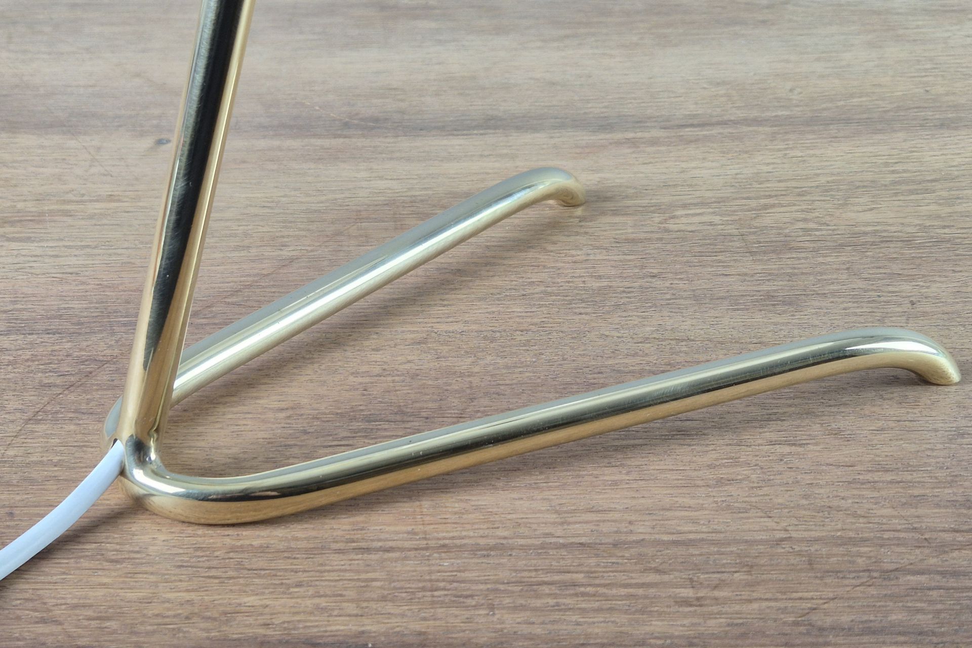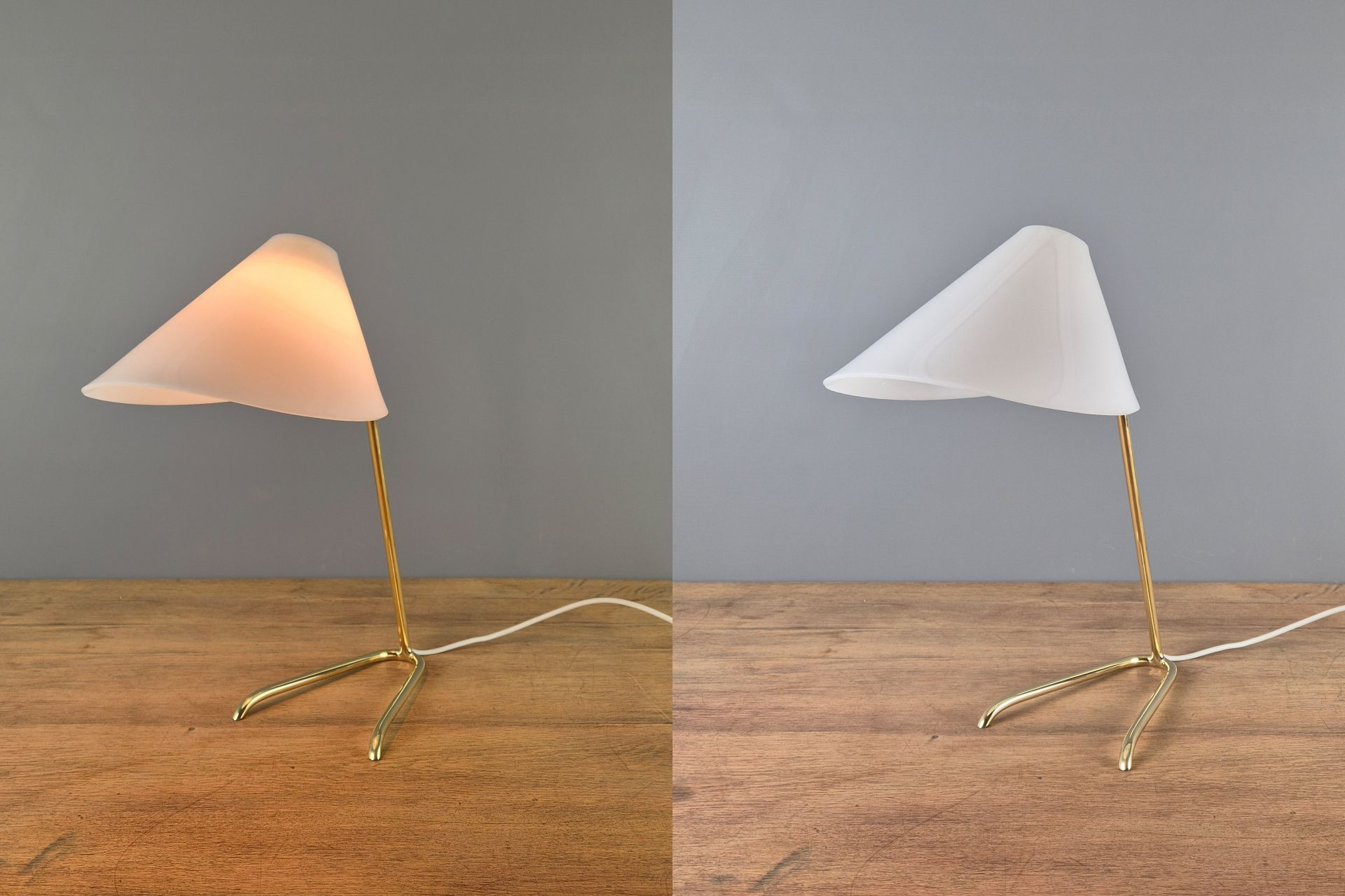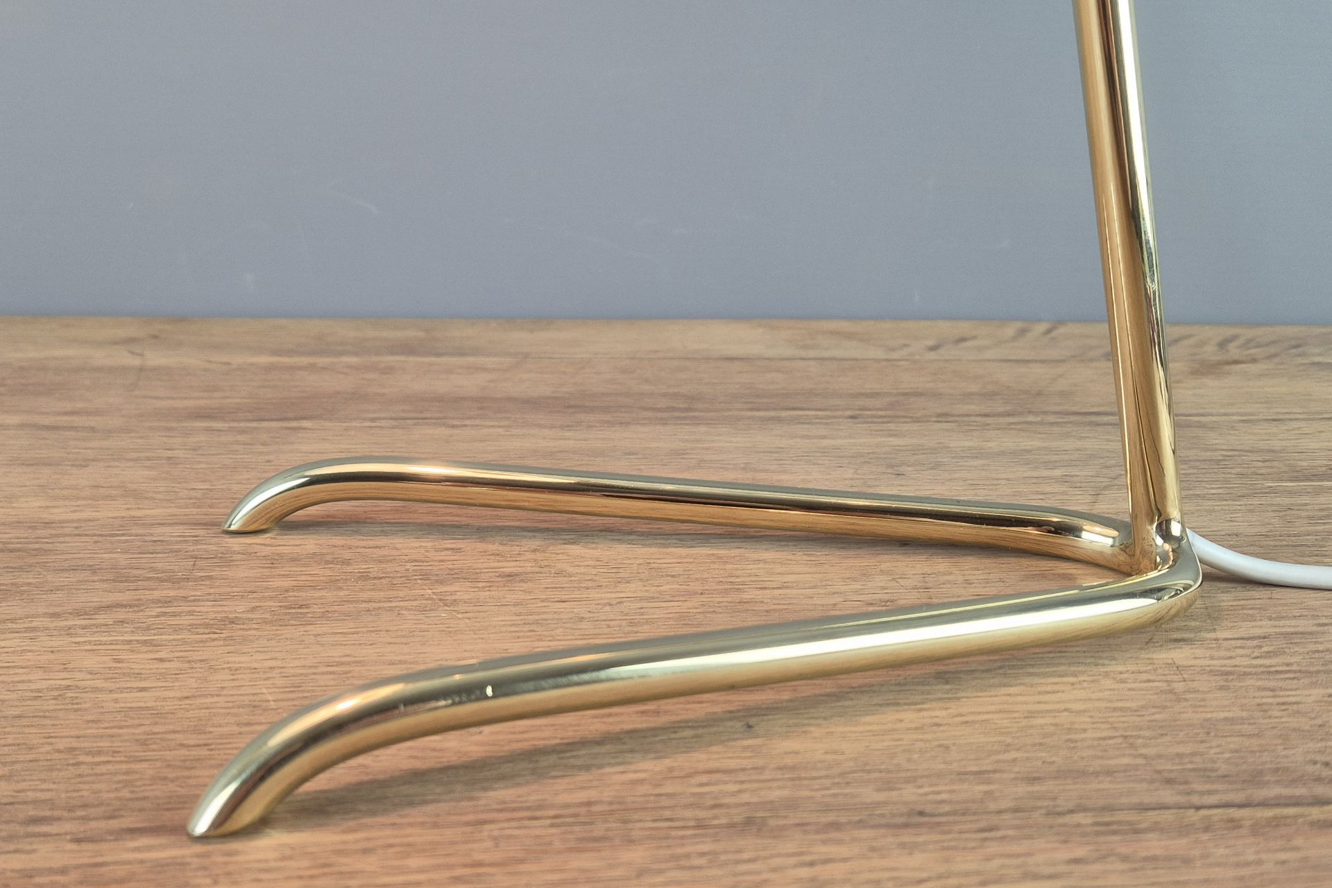 The choice of materials and form is very understated, yet beautifully designed, and its graceful construction gives it a visually light appearance. The V-shaped, slightly wavy base is fixed to the arm. A small joint and wing nut create a movable connection to the white, sail-shaped shade.