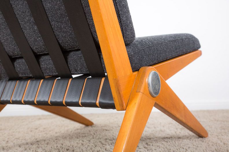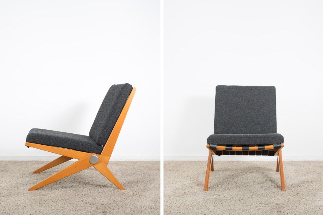 Wonderful scissor chair from Pierre Jeannert for Knoll International. The armless chair has been professionel restored with correct materials. New straps, new foam, new Hallingdal 180 fabric from Kvadrat-Denmark