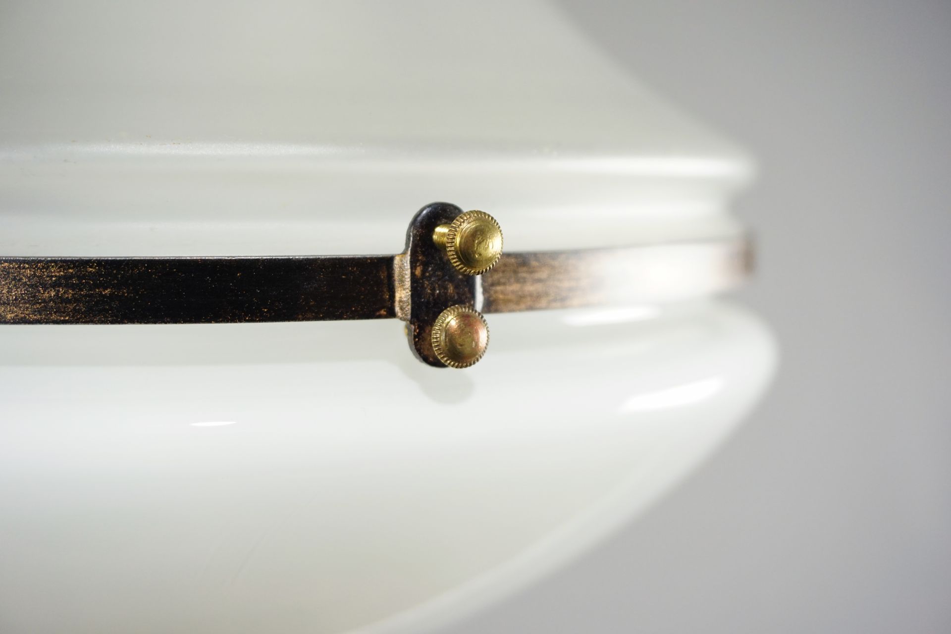 Both the upper part and the lower part, which are connected with a metal ring, were available with a satin finish or made of white opal glass. The Luzette offered here is a dream of originality.
