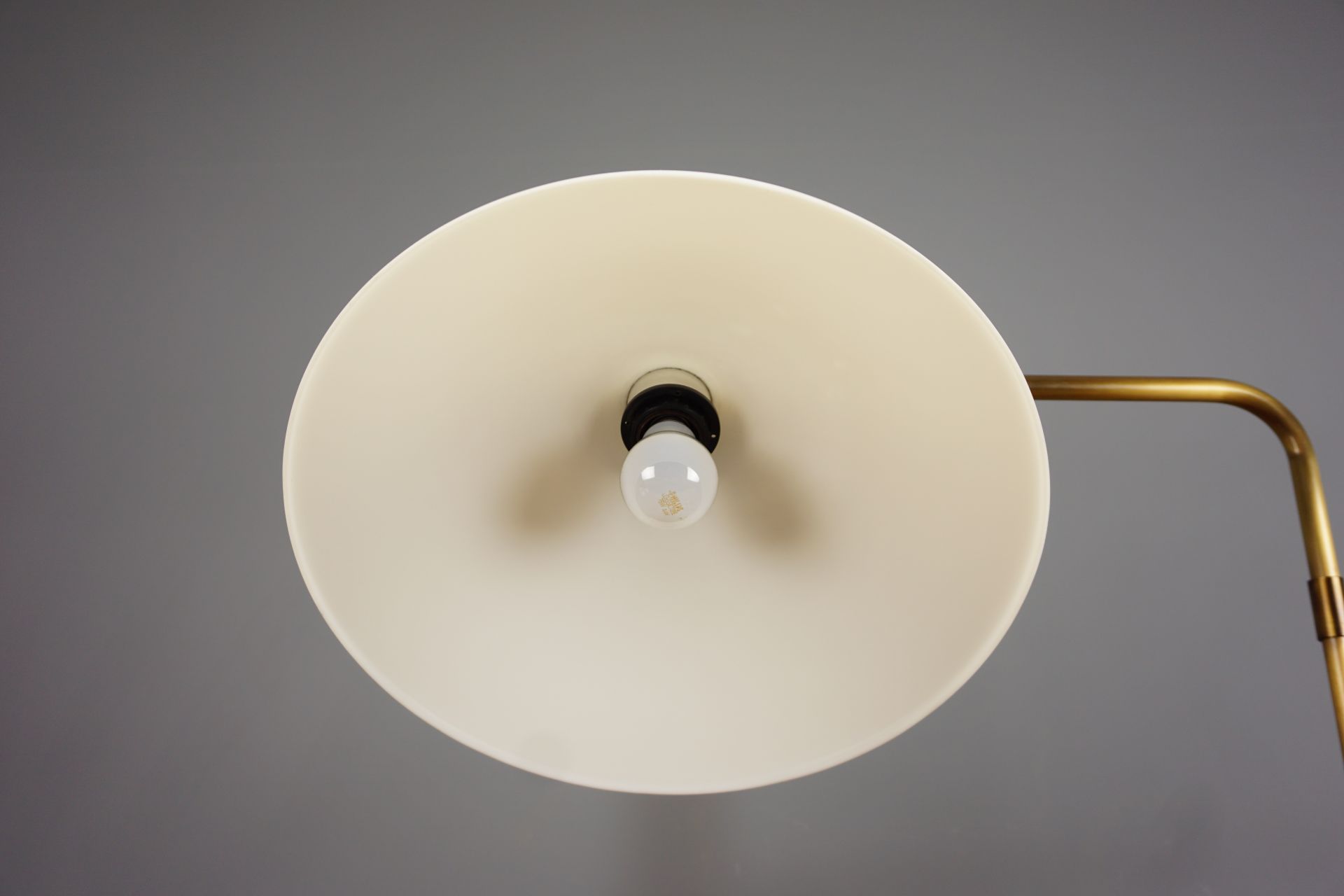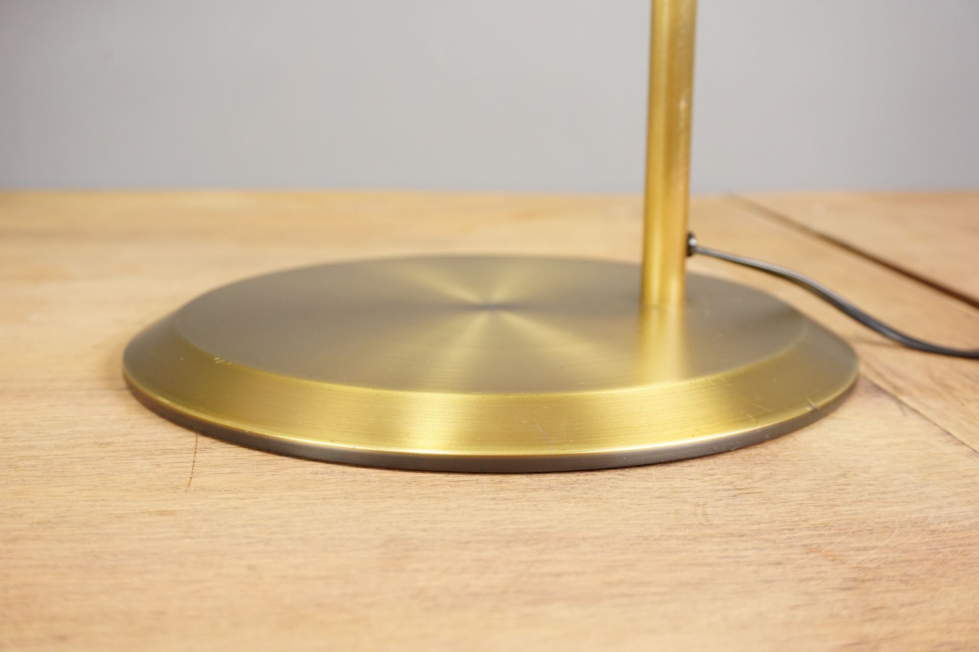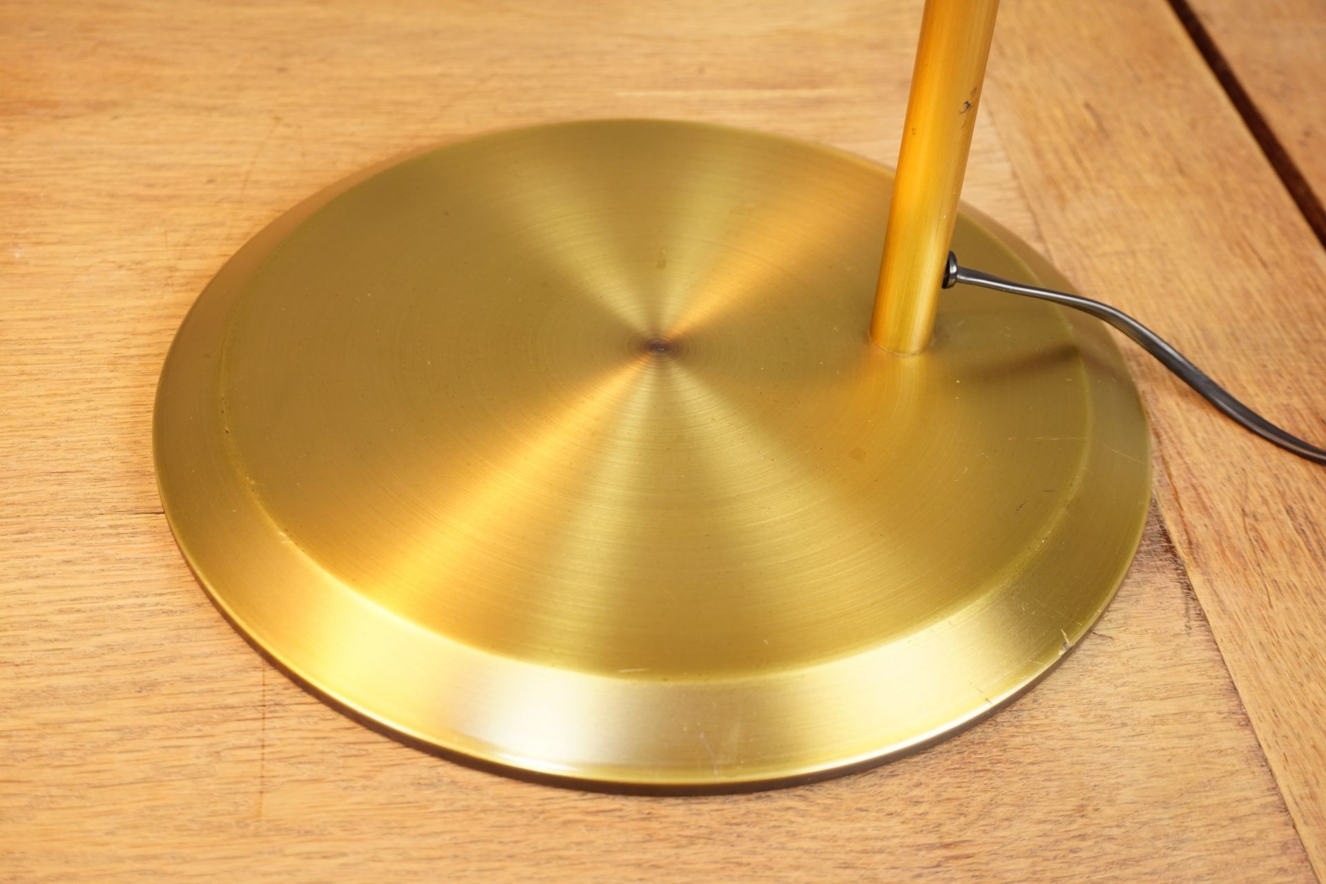 Round, flat base with an angled and rotatable lamp arm made of turned/matt brushed brass in combination with a cylindrical lamp socket and switch in a "turbine design".