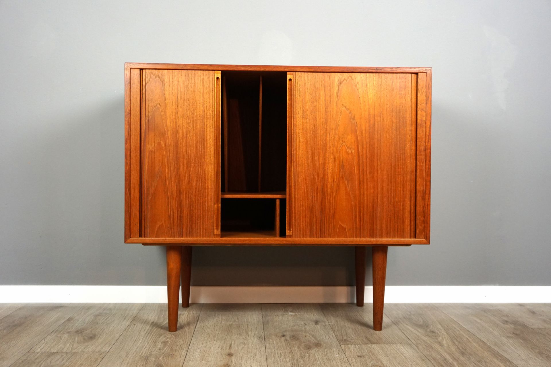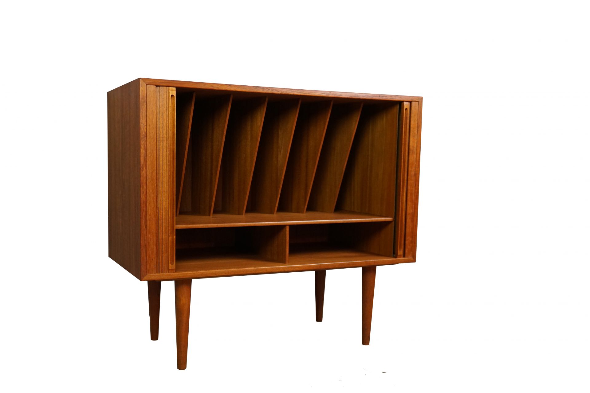 Wonderful Record Cabinet from Kai Kristiansen for FM Møbler -Denmark Teakwood with tambour-doors. Very good condition with just 1 preowner.