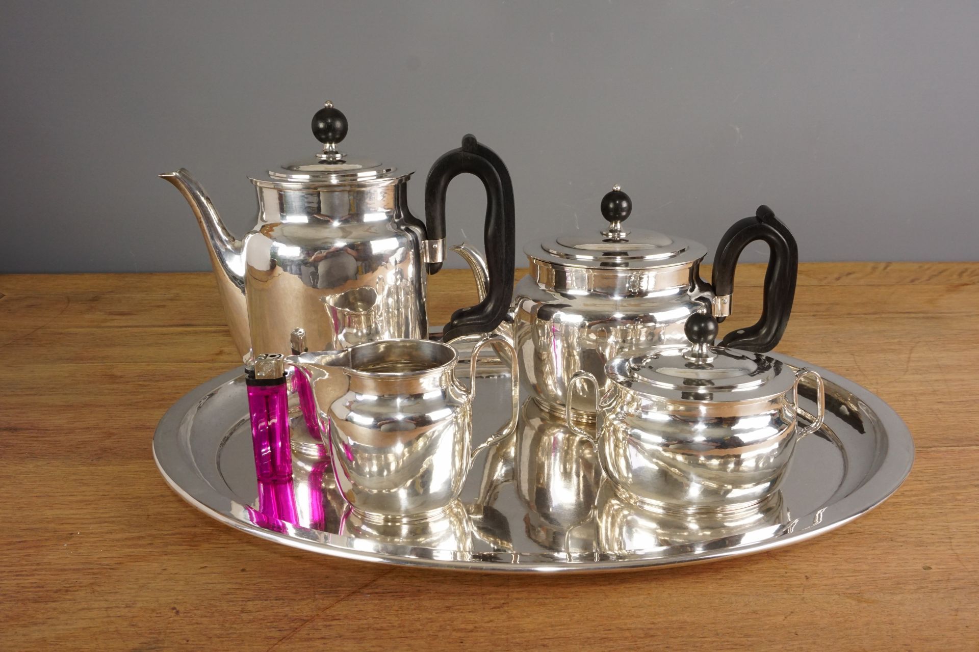 Das Set besteht aus einem ovalen Tablett, einer Kaffeekanne, einer Teekanne, einer Zuckerdose sowie einem Milch/Sahne-kännchen.