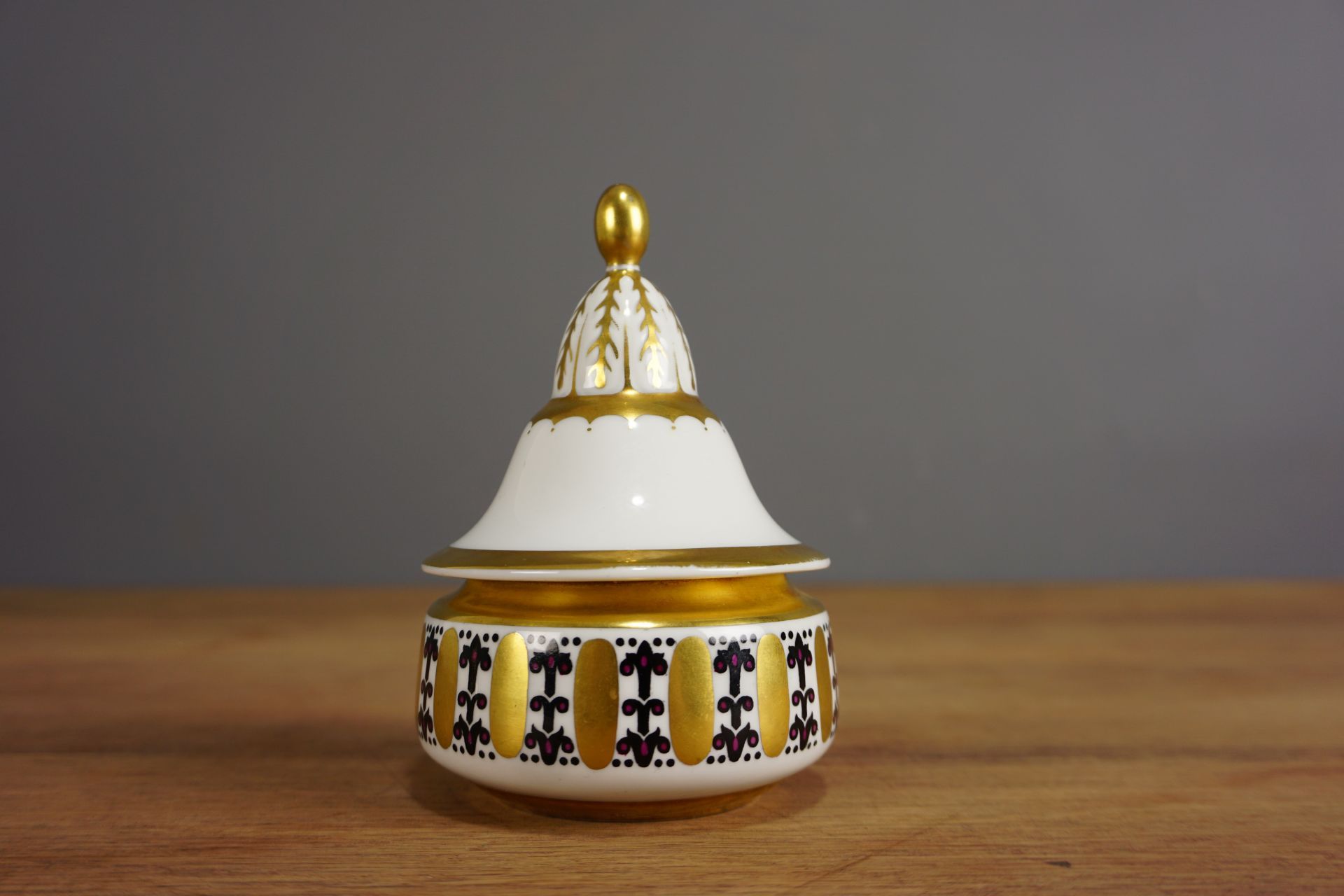 Sehr schöner Zustand, keine Chips, farbfrisch und bis auf geringste Abriebsspuren Gold am Deckel perfekt.