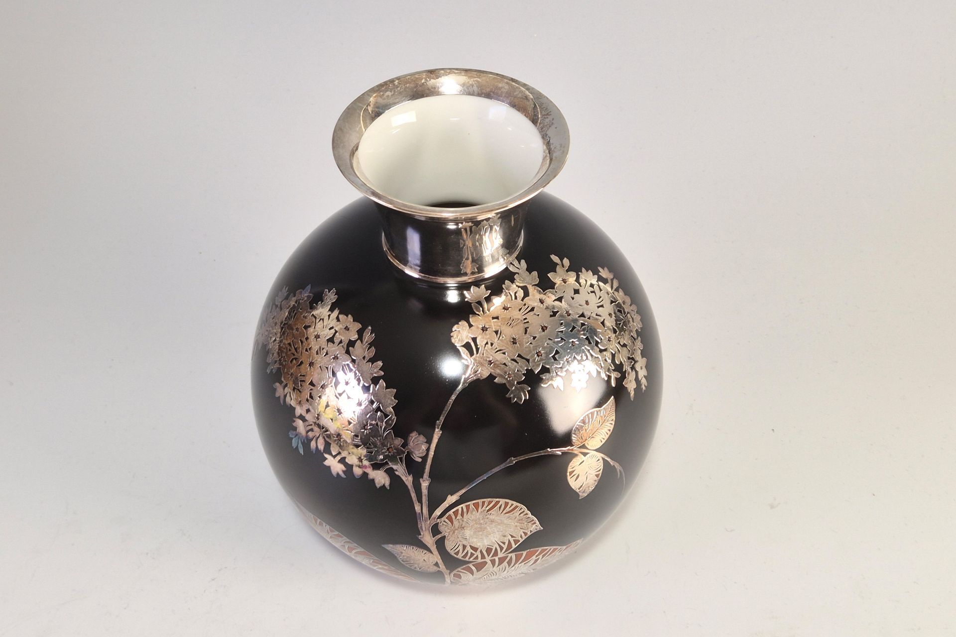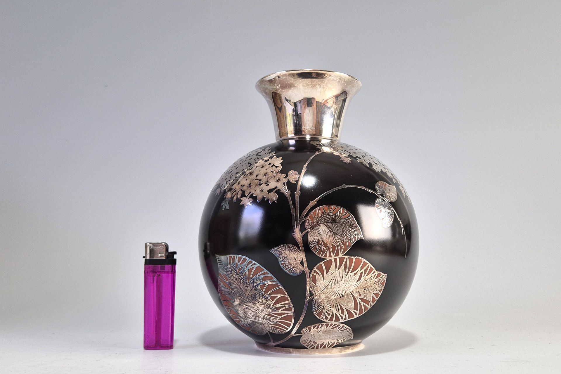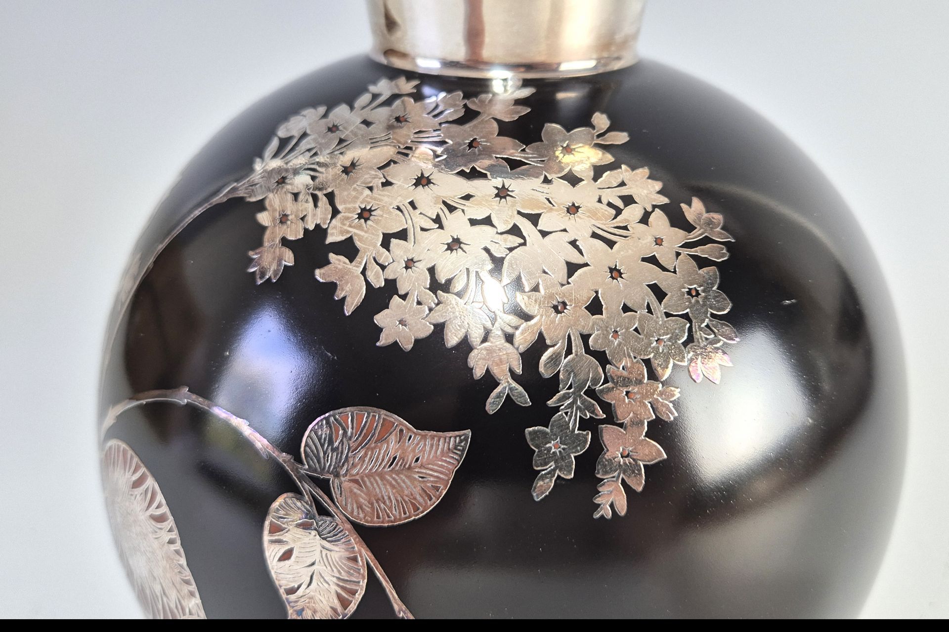 Der Hals ist flächig mit Silber überzogen, wohingehend die kugelrunde schwarze Wandung mit Blütenmustern, Blättern und Zweigen aus Silber belegt ist.