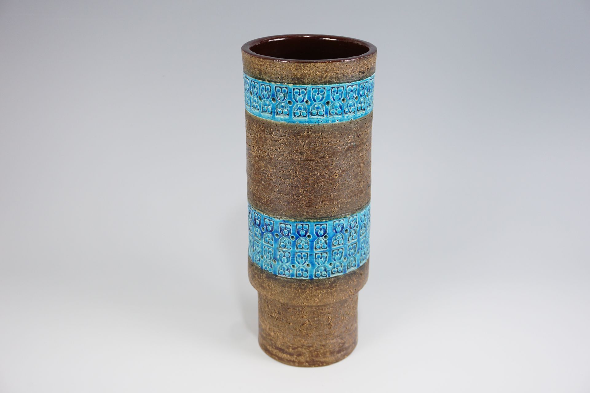 Sehr schöne Keramikvase von Aldo Londi für Bitossi -Italien. Modellserie Trifoglio mit strukturierter brauner Glasur und zwei Friesen in blautürkis.