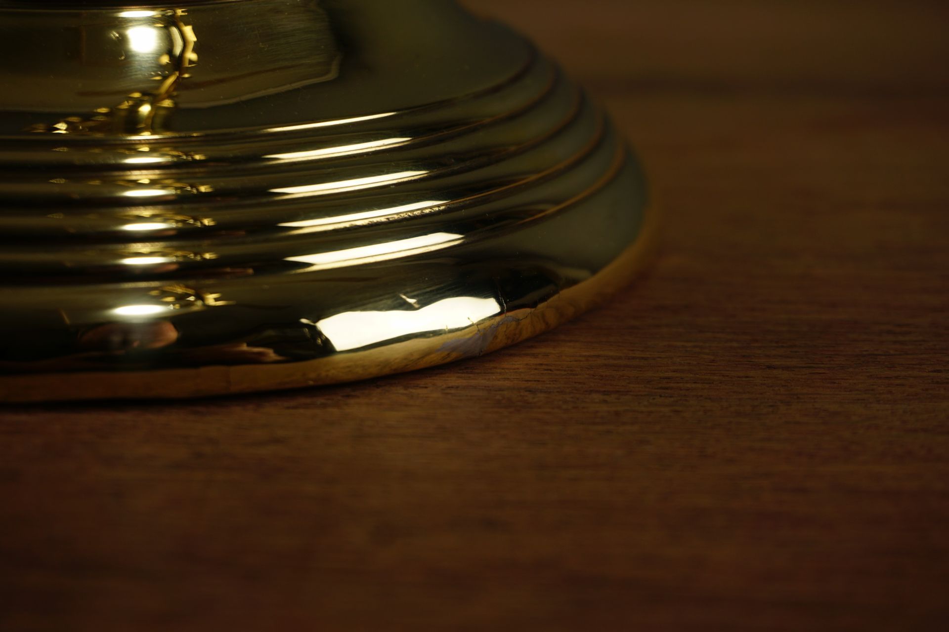 Handwerklich hervorragend im geometrischen Jugendstil gefertigt. Messing, getrieben und gedrückt.