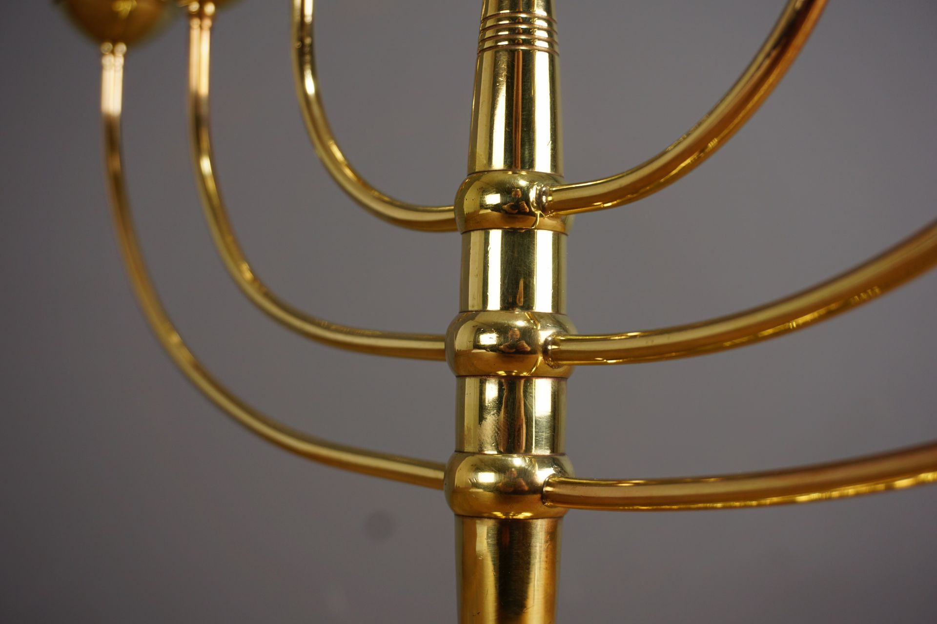 Der Leuchter wurde komplett restauriert, zerlegt, gereinigt und hochglanzpoliert ohne ihm den Charakter eines über 100 Jahren alten Designklassikers zu nehmen. Minimale alters & materialbedingte Gebrauchsspuren sind natürlich noch vorhanden.