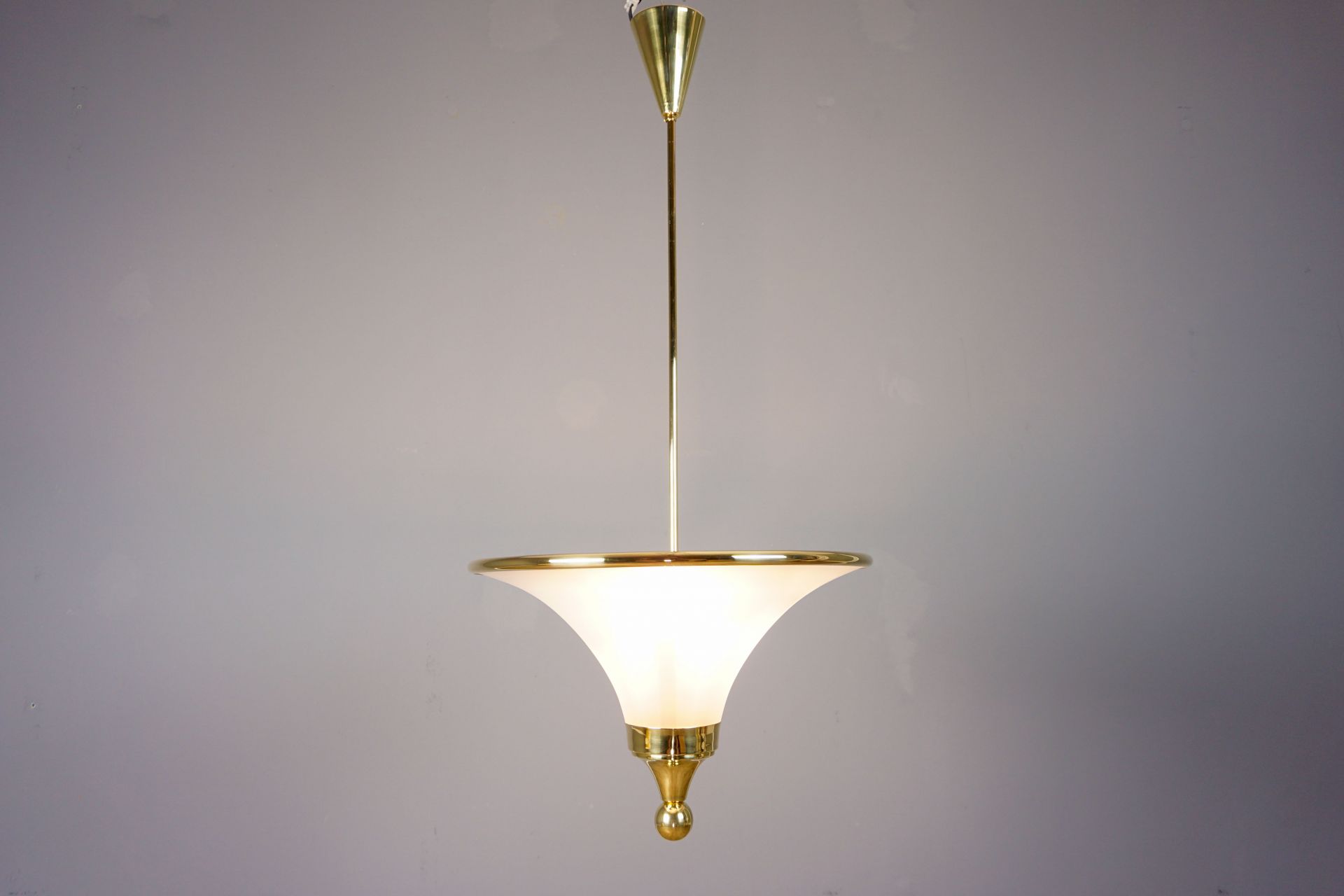 Die Leuchte besteht aus mundgeblasenem satiniertem Glas, konisch konkav zulaufend und polierten Messingmonturen.