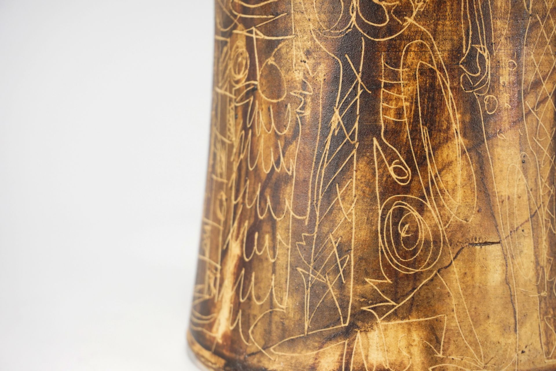 Aussergewöhnlich schöne Oberfläche mit seltener Ritzzeichnung, welche im Zusammenhang mit den Erdtönen an alte Höhlenzeichnungen erinnert. Top Zustand. Unterseitig signiert .