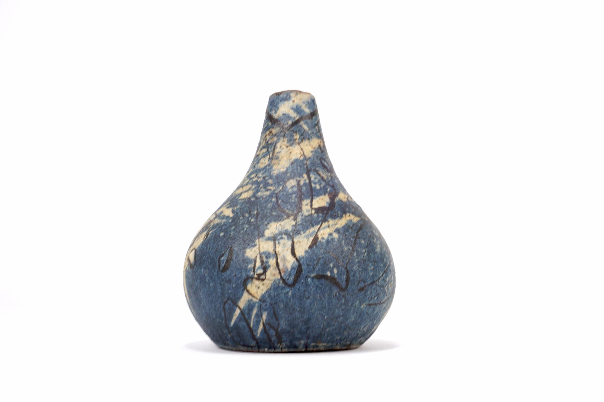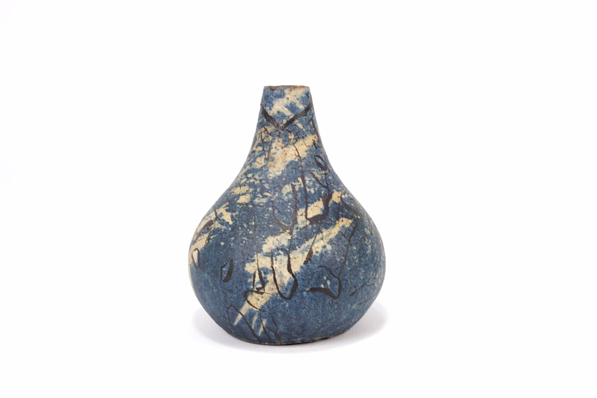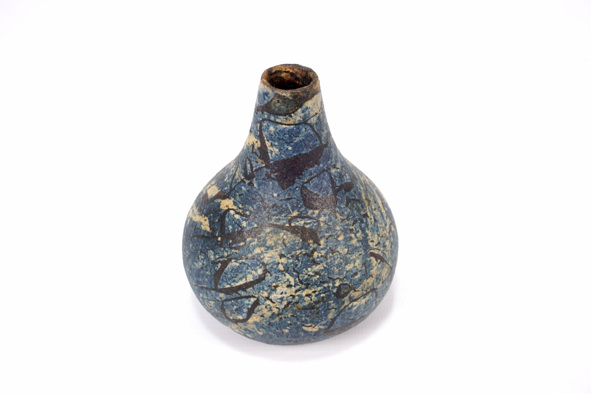 Die kleinere Vase greift dieselbe wilde polychrome Glasur, diesmal mit blau als Hauptfarbe auf.