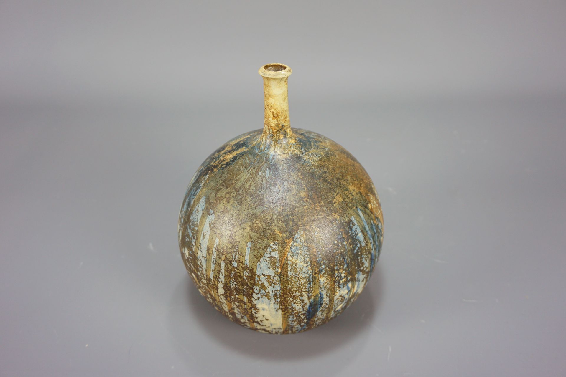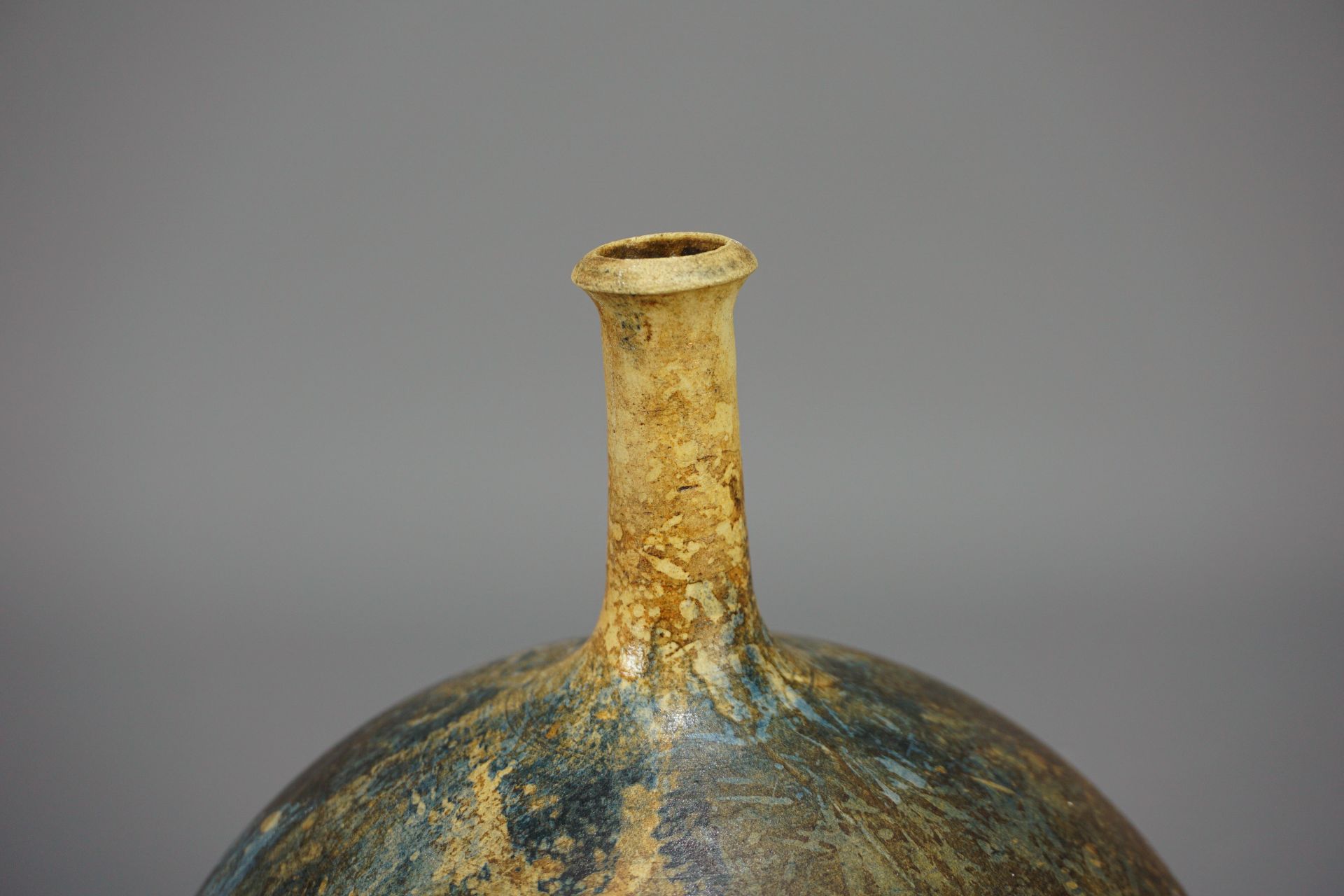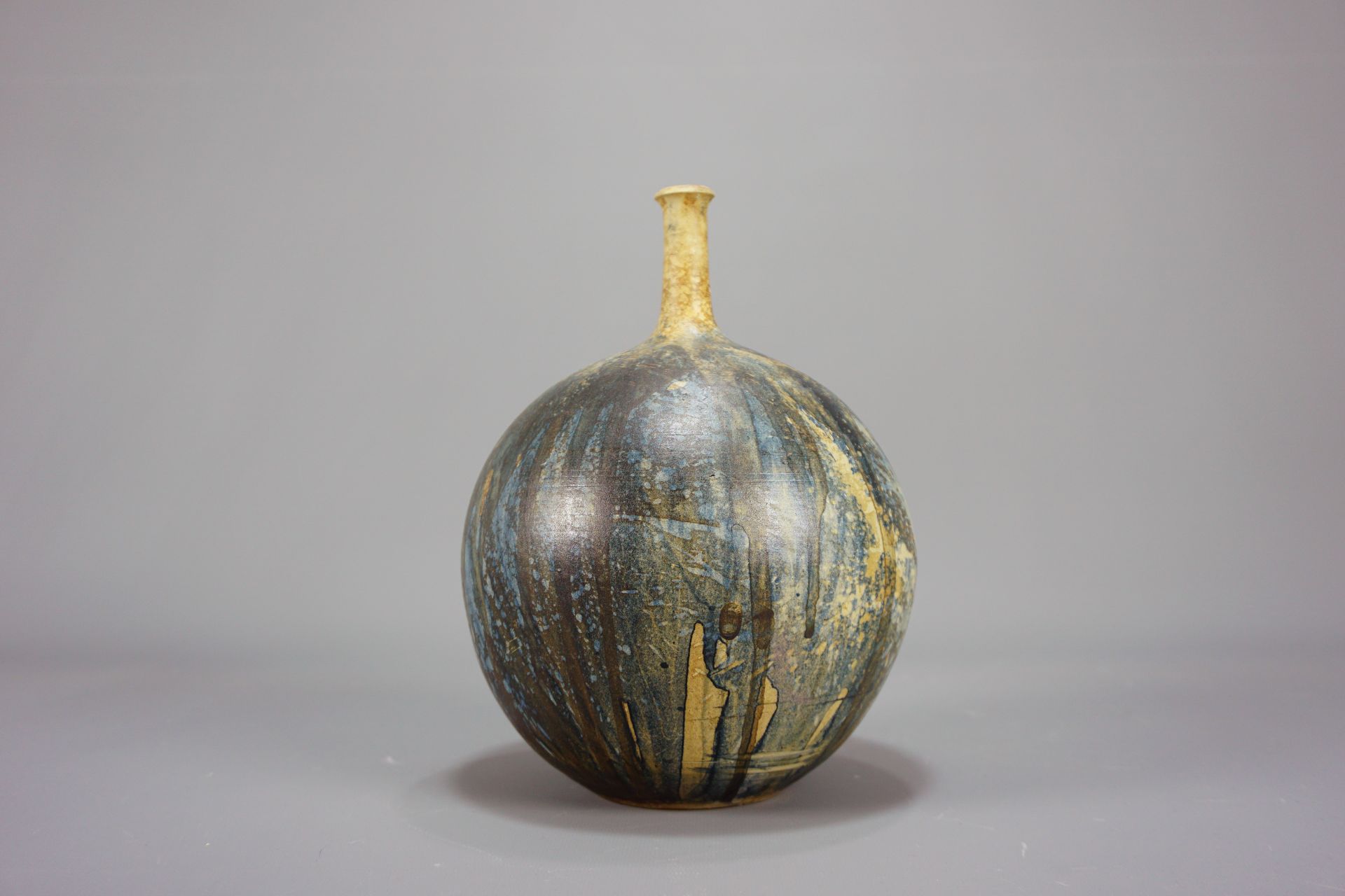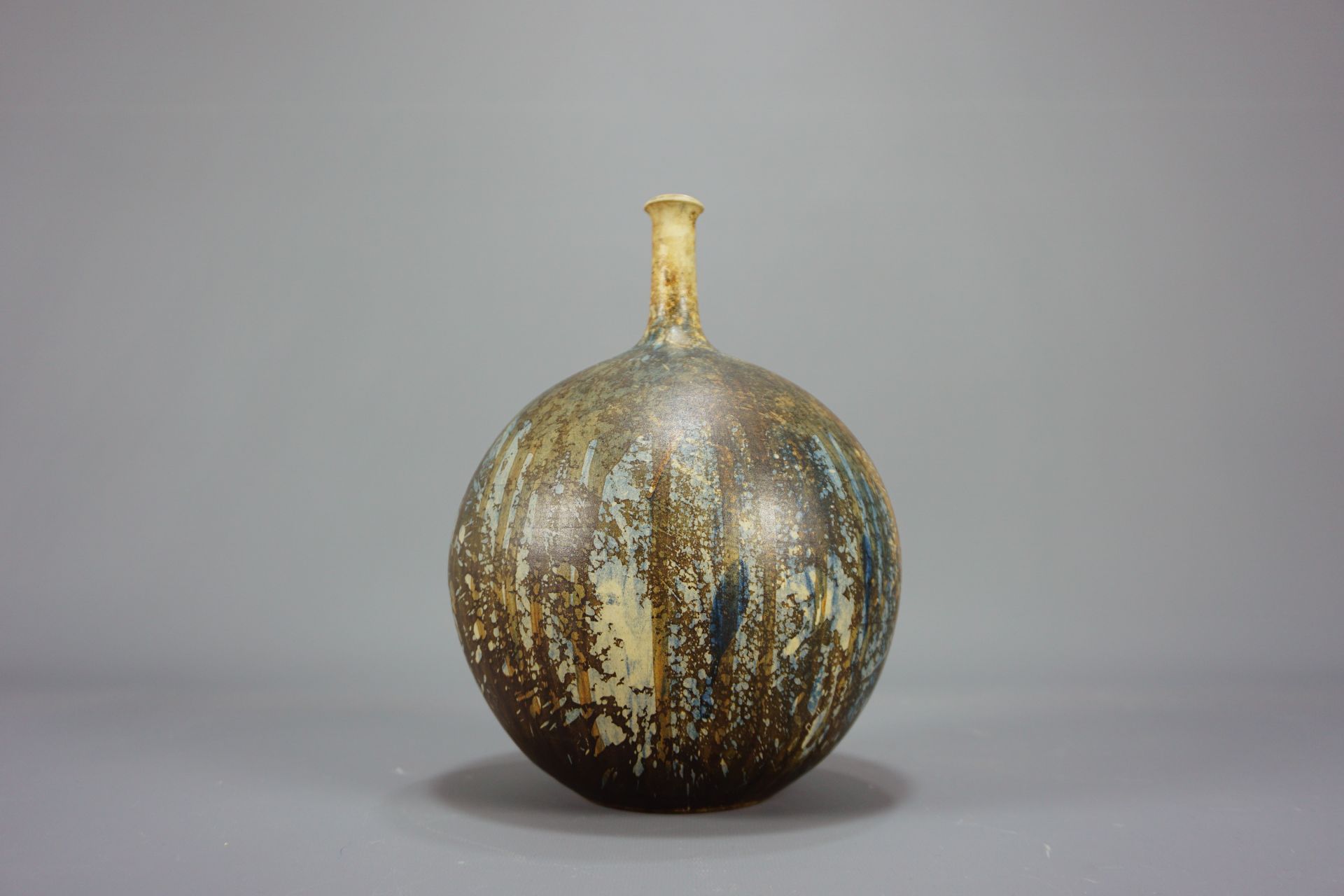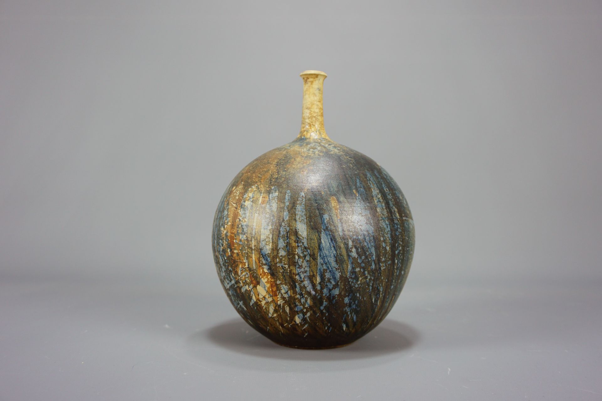 Sehr schöne Studiokeramik in Form einer Kugelvase mit schlankem Hals von 1975.