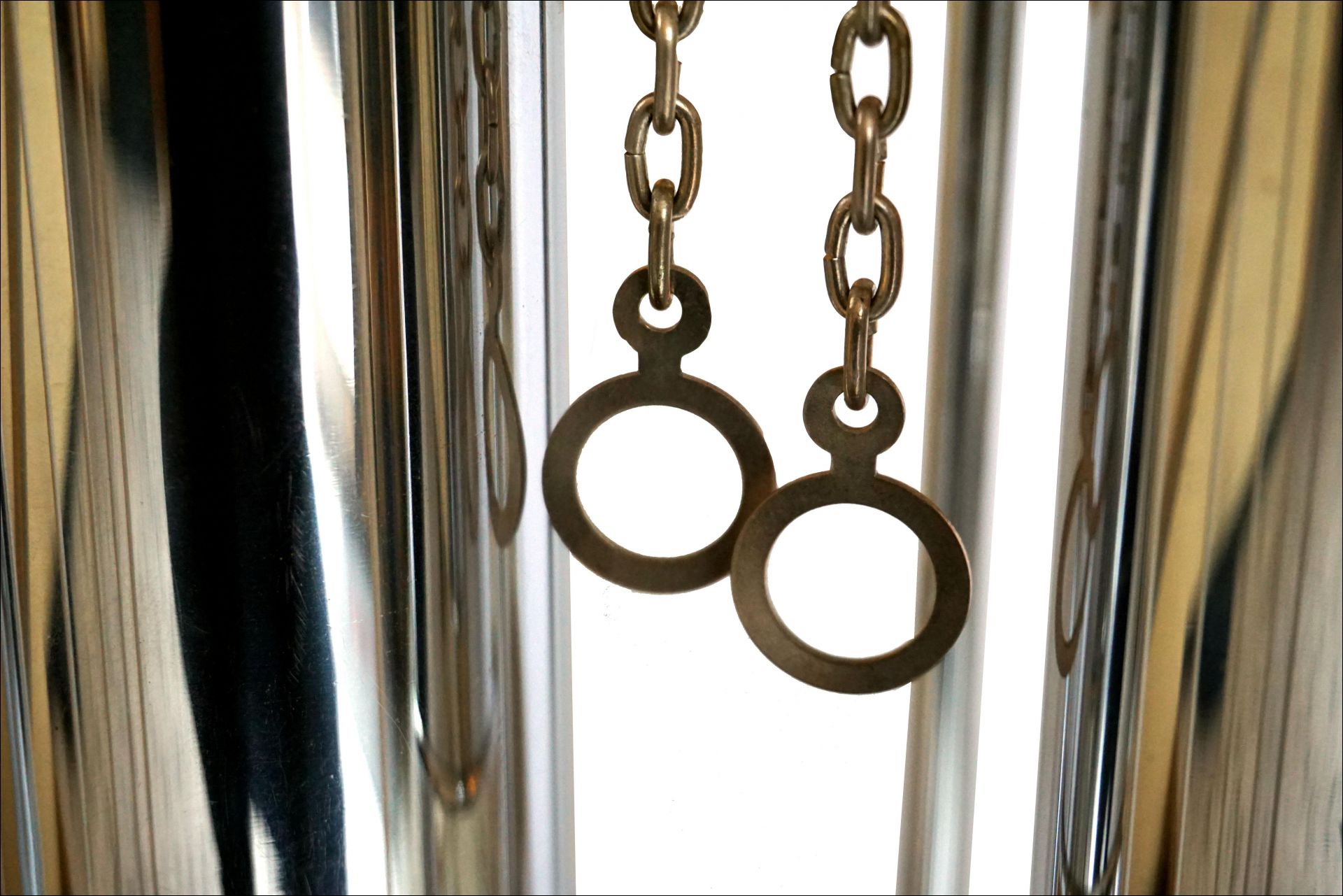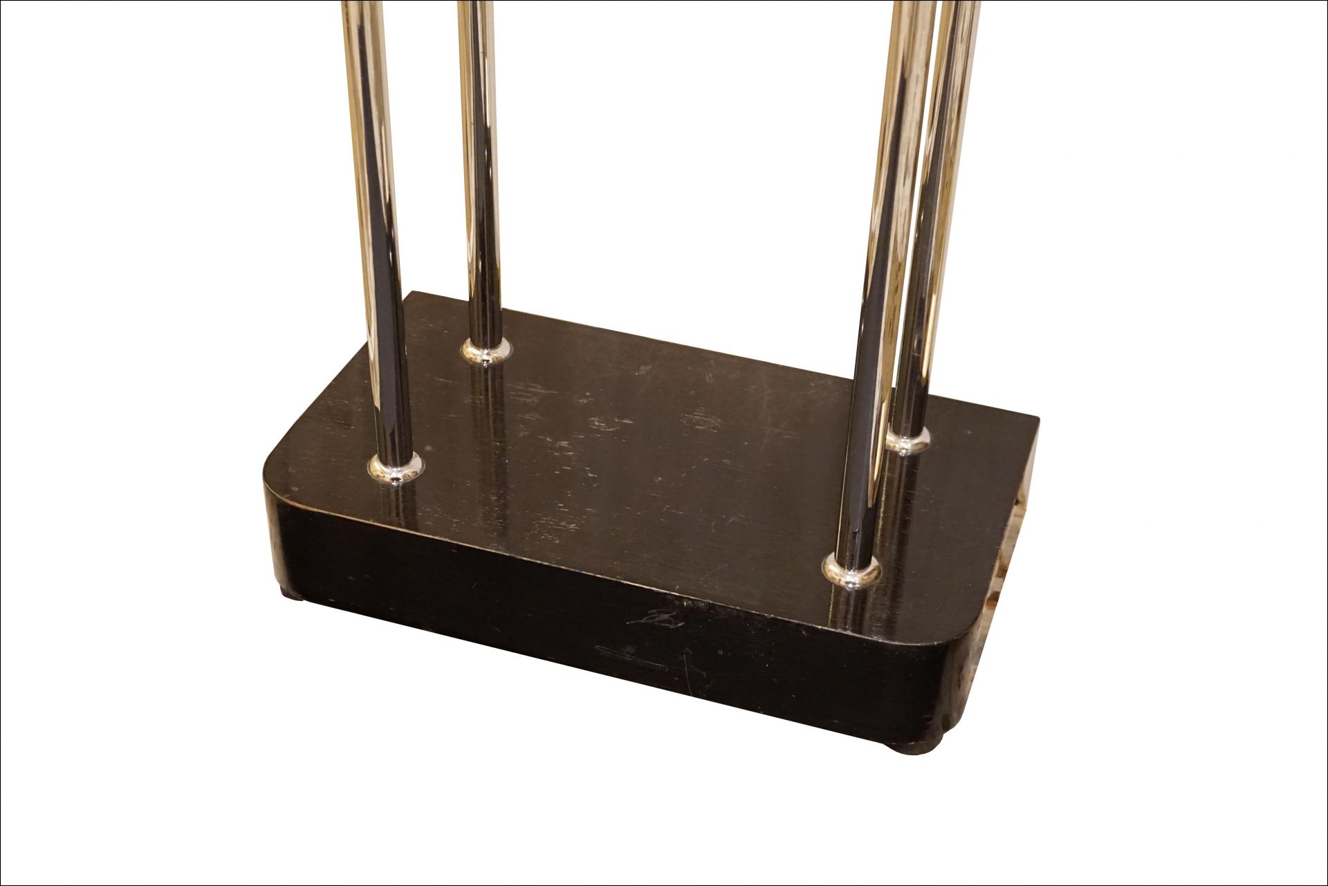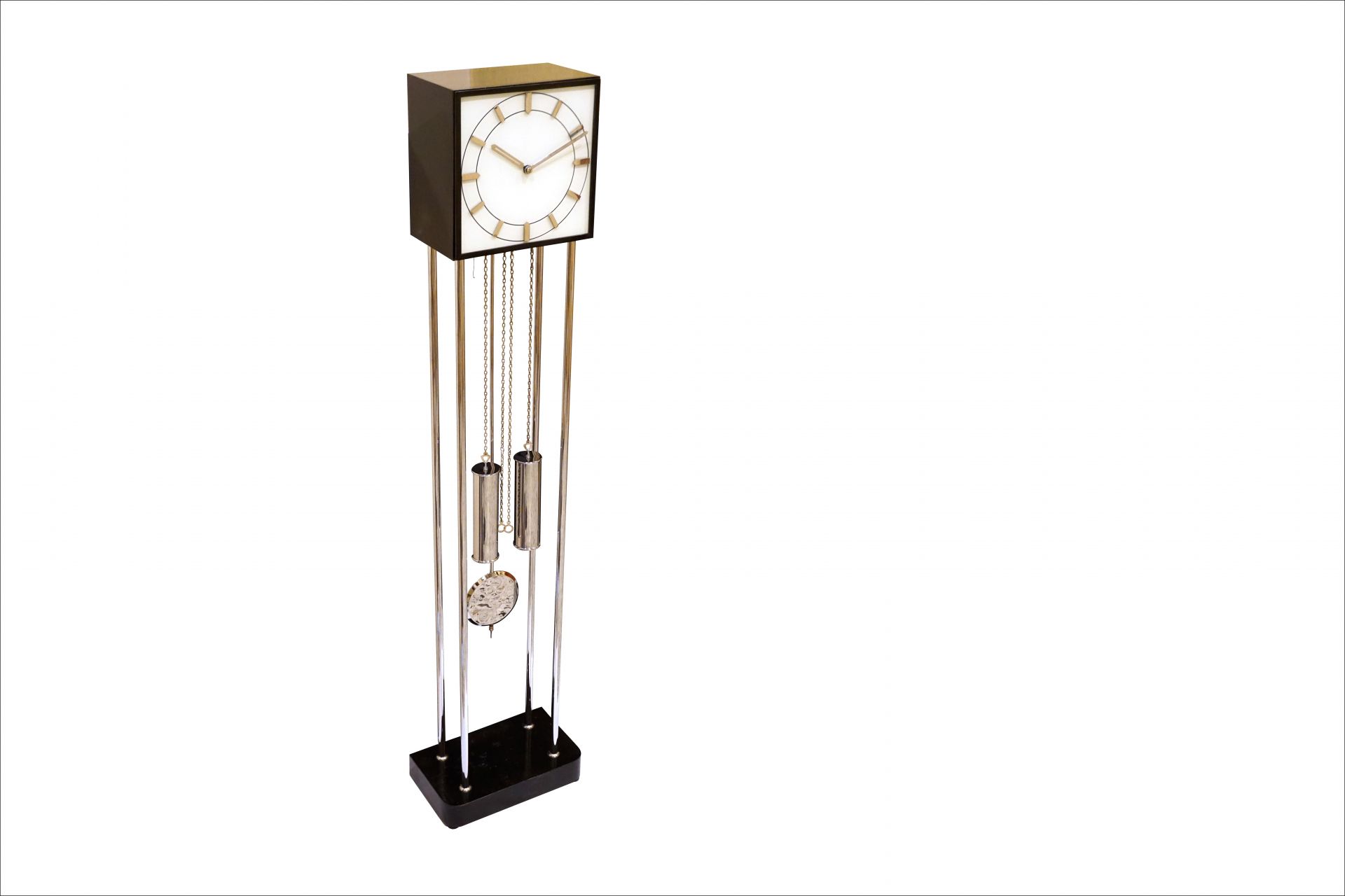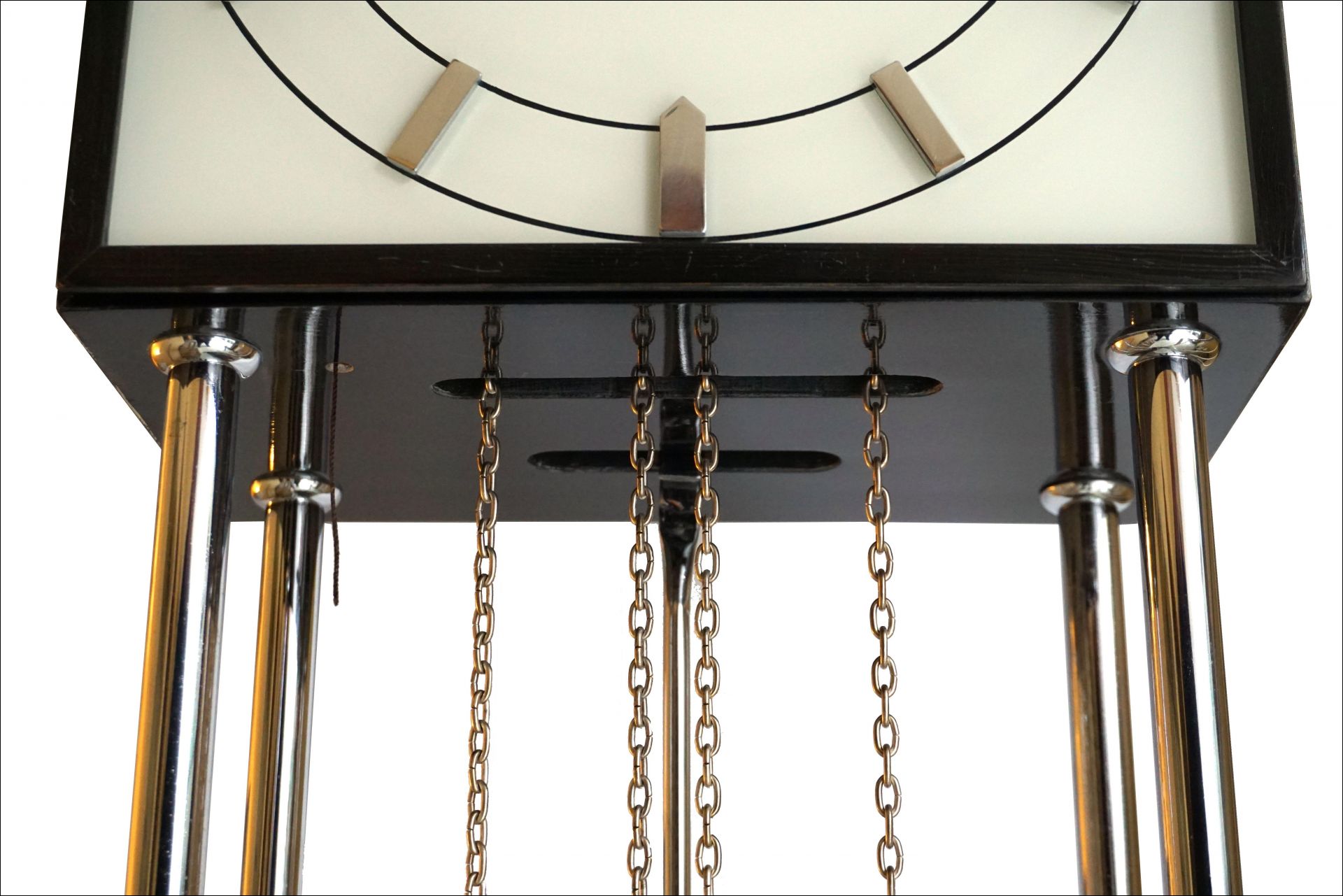 Die verchromten Elemente wie Ziffern, Zeiger, Pendel, Gewichte, wie auch Stahlrohrstützen und Auflageteller weisen noch den originalen Chrom auf und befinden sich ebenso in einem sehr schönen Zustand.