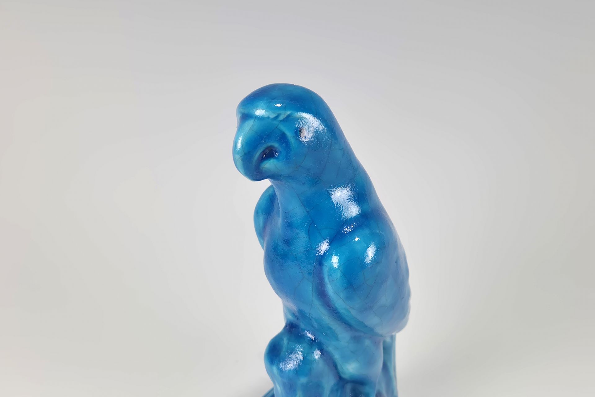 Der hier angebotene Sittich / kleiner Papagei strahlt durch seine monochrome blaue transluzente Glasur.