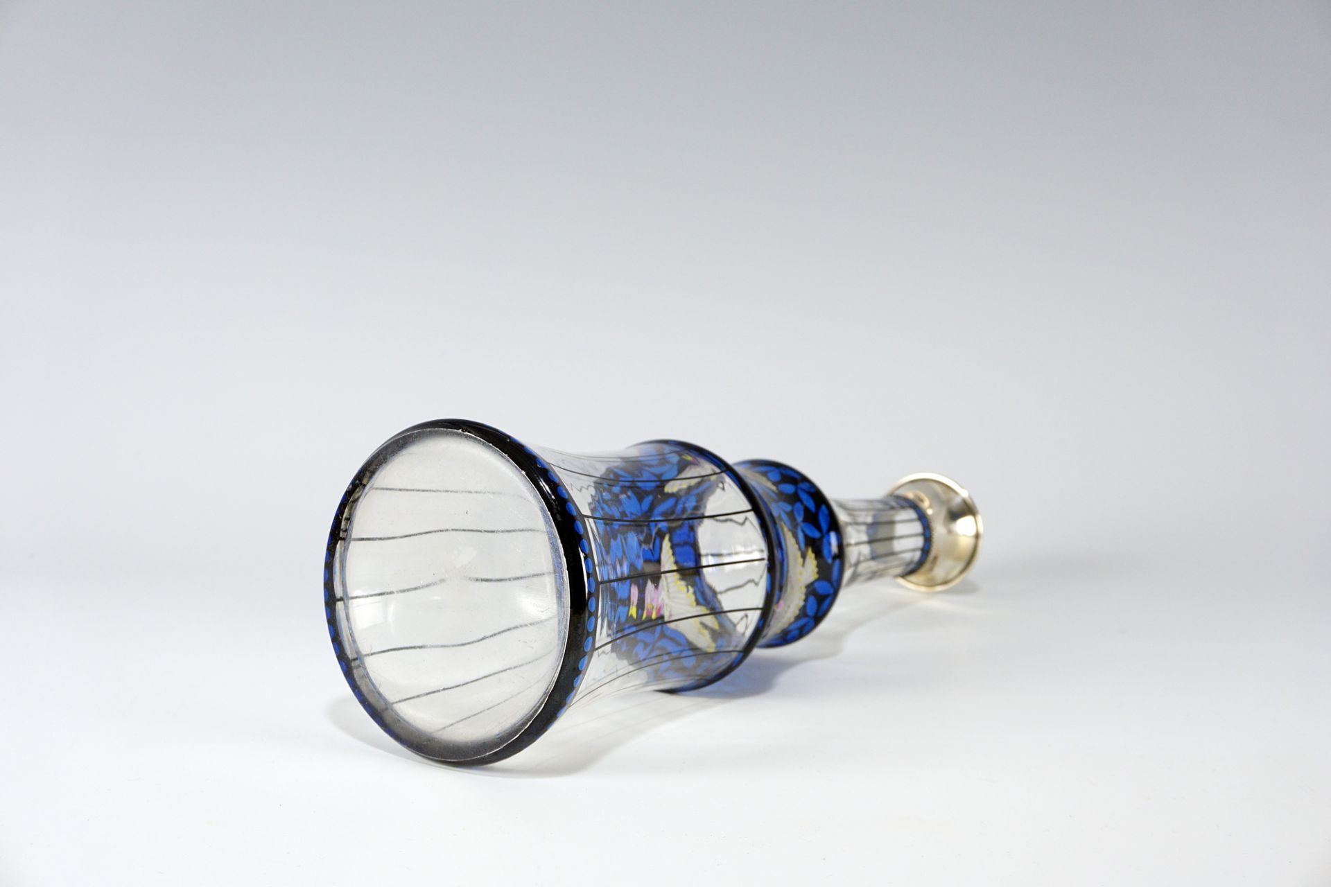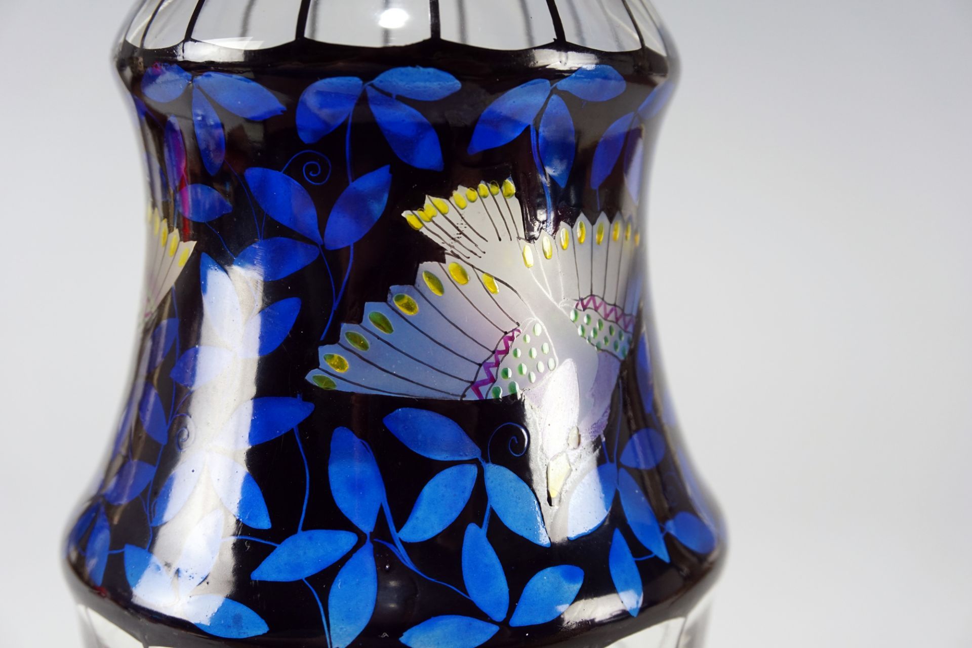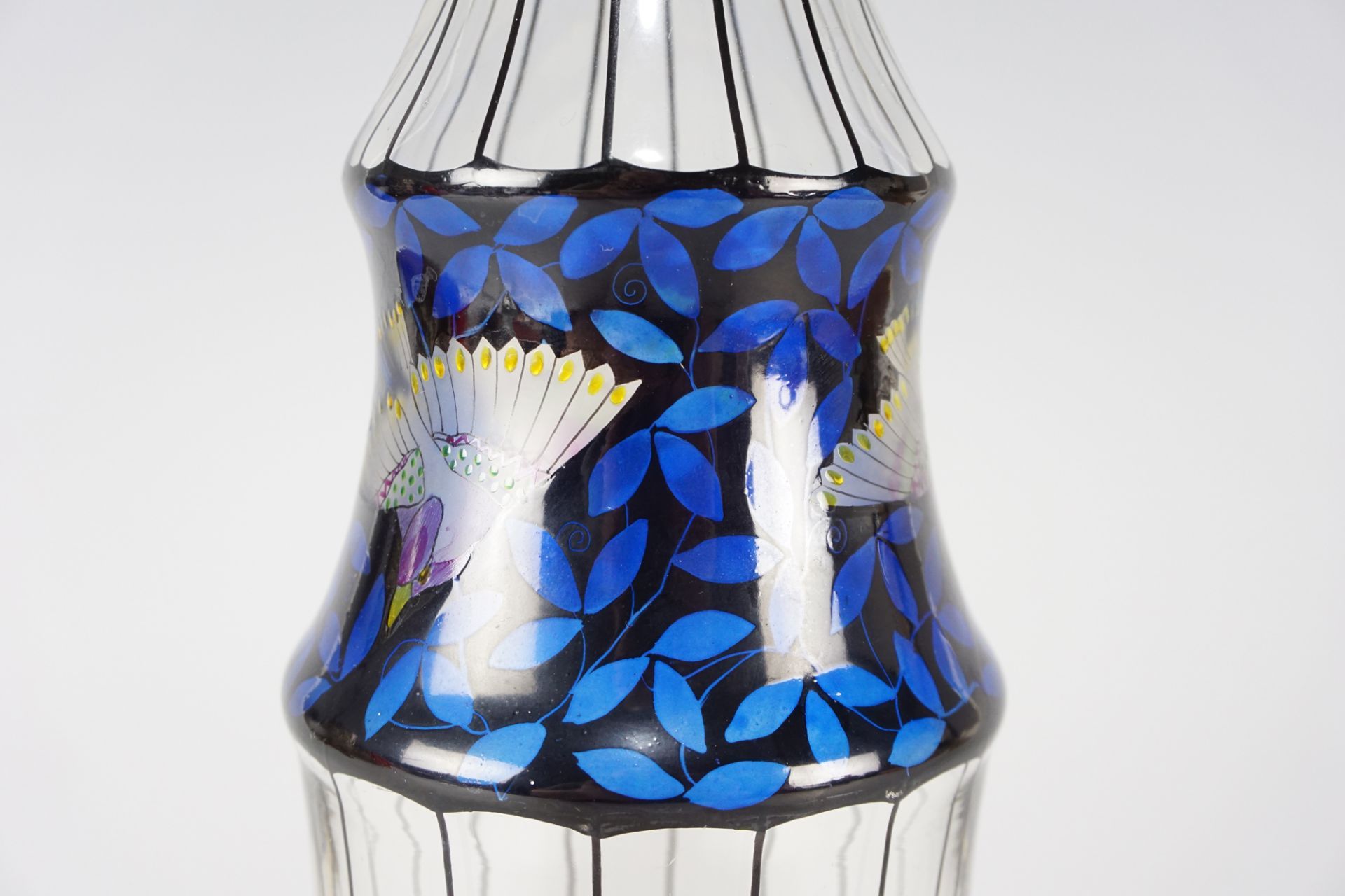 Ein bunter und mit mehreren transparenten Emailfarbe ausstaffierter Paradiesvogel in einem schwarz hinterlegtem Fries mit blauen, transparenten Blattranken. Insgesamt 3 Vögel säumen die Karaffe. Am Boden und am Ausguss wiederholen sich diese Farben und Muster, verbunden durch senkrechte Schwarzlotstriche.