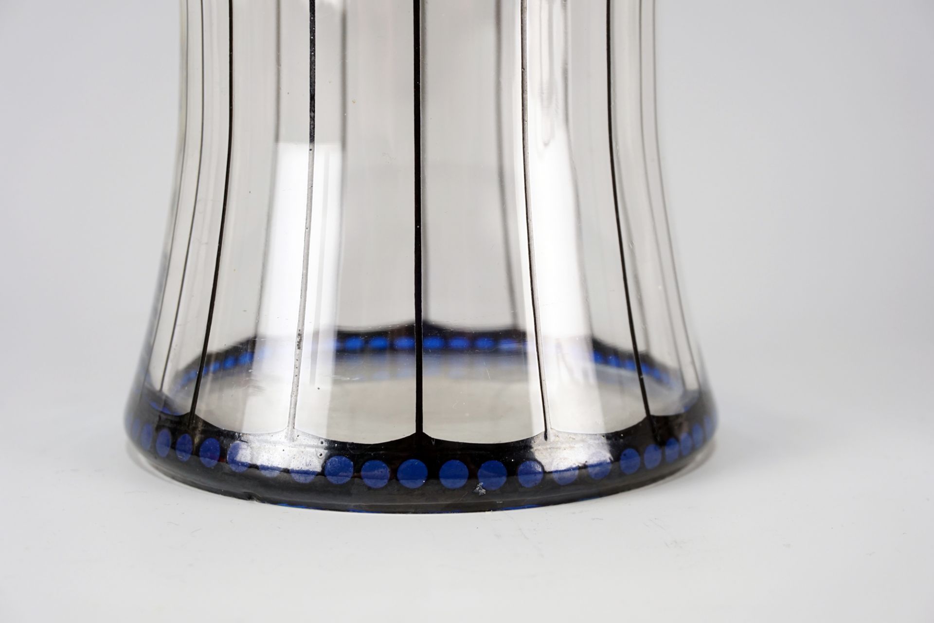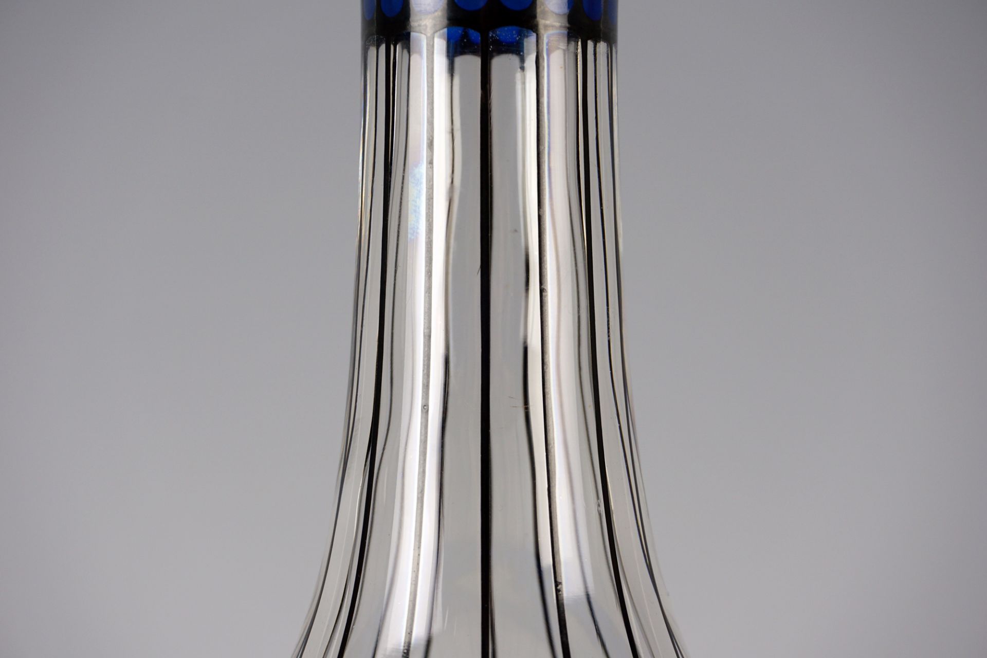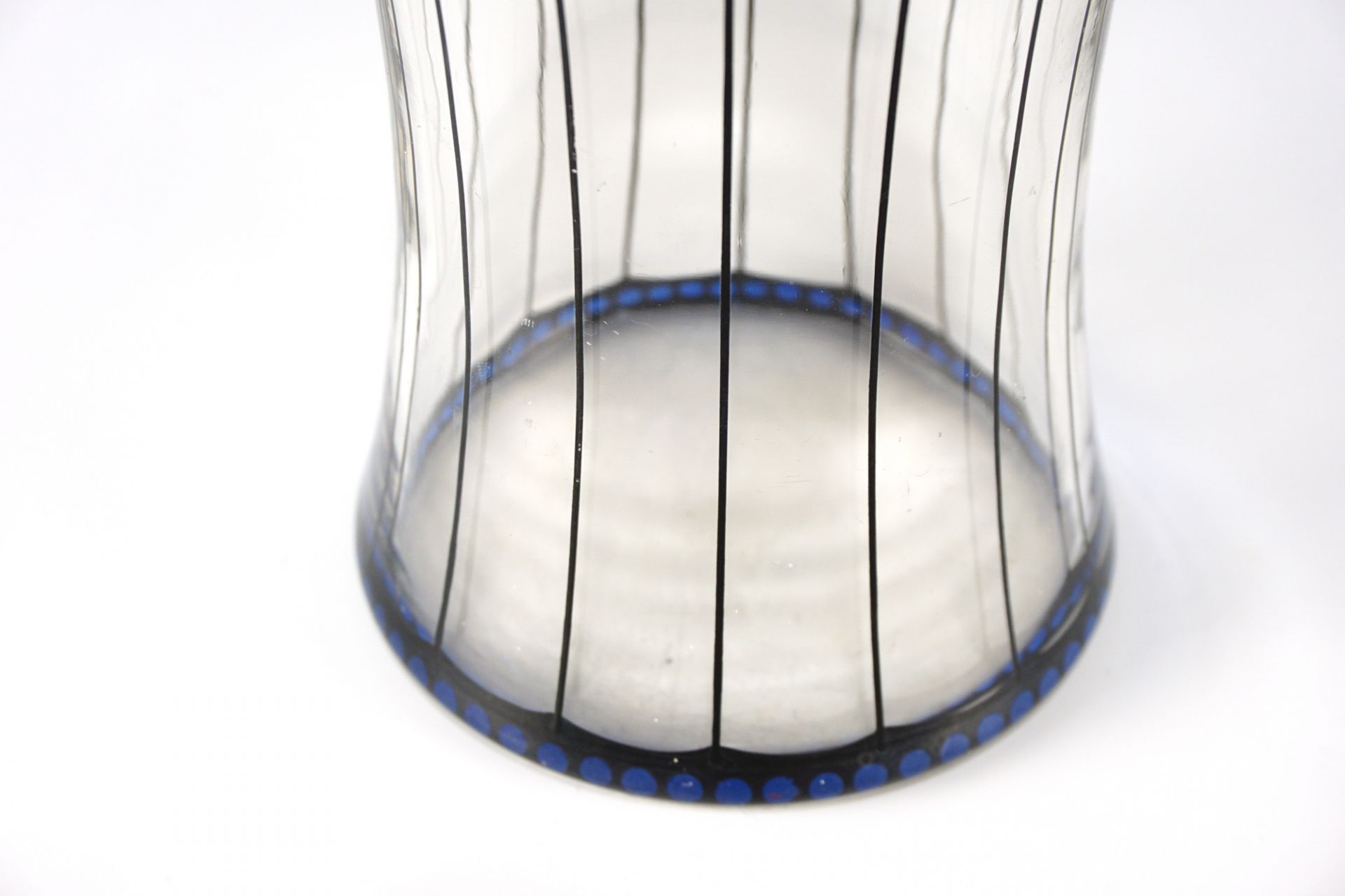 Ein bunter und mit mehreren transparenten Emailfarbe ausstaffierter Paradiesvogel in einem schwarz hinterlegtem Fries mit blauen, transparenten Blattranken. Insgesamt 3 Vögel säumen die Karaffe. Am Boden und am Ausguss wiederholen sich diese Farben und Muster, verbunden durch senkrechte Schwarzlotstriche.