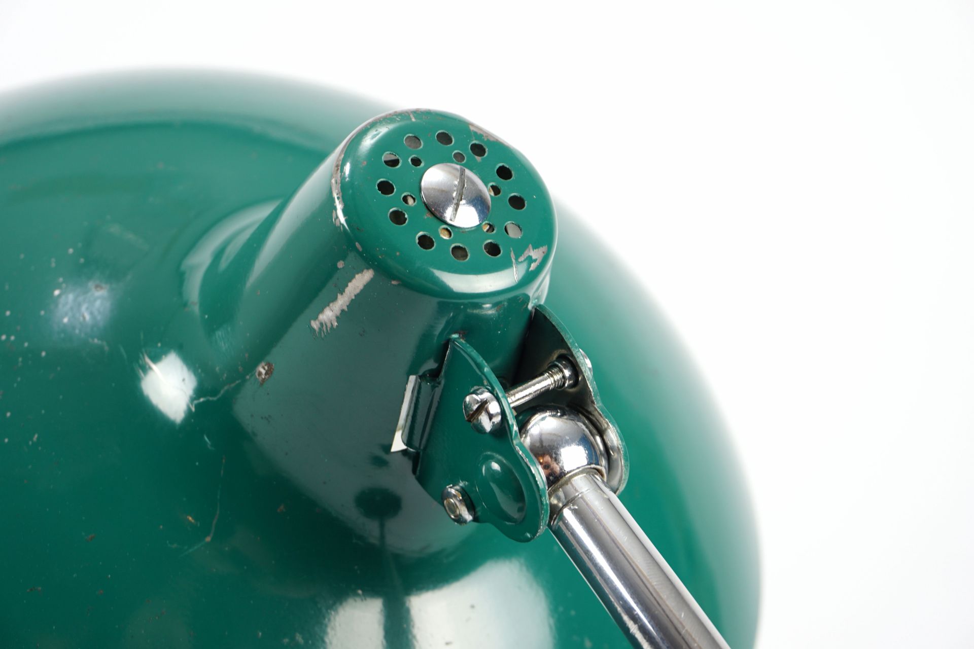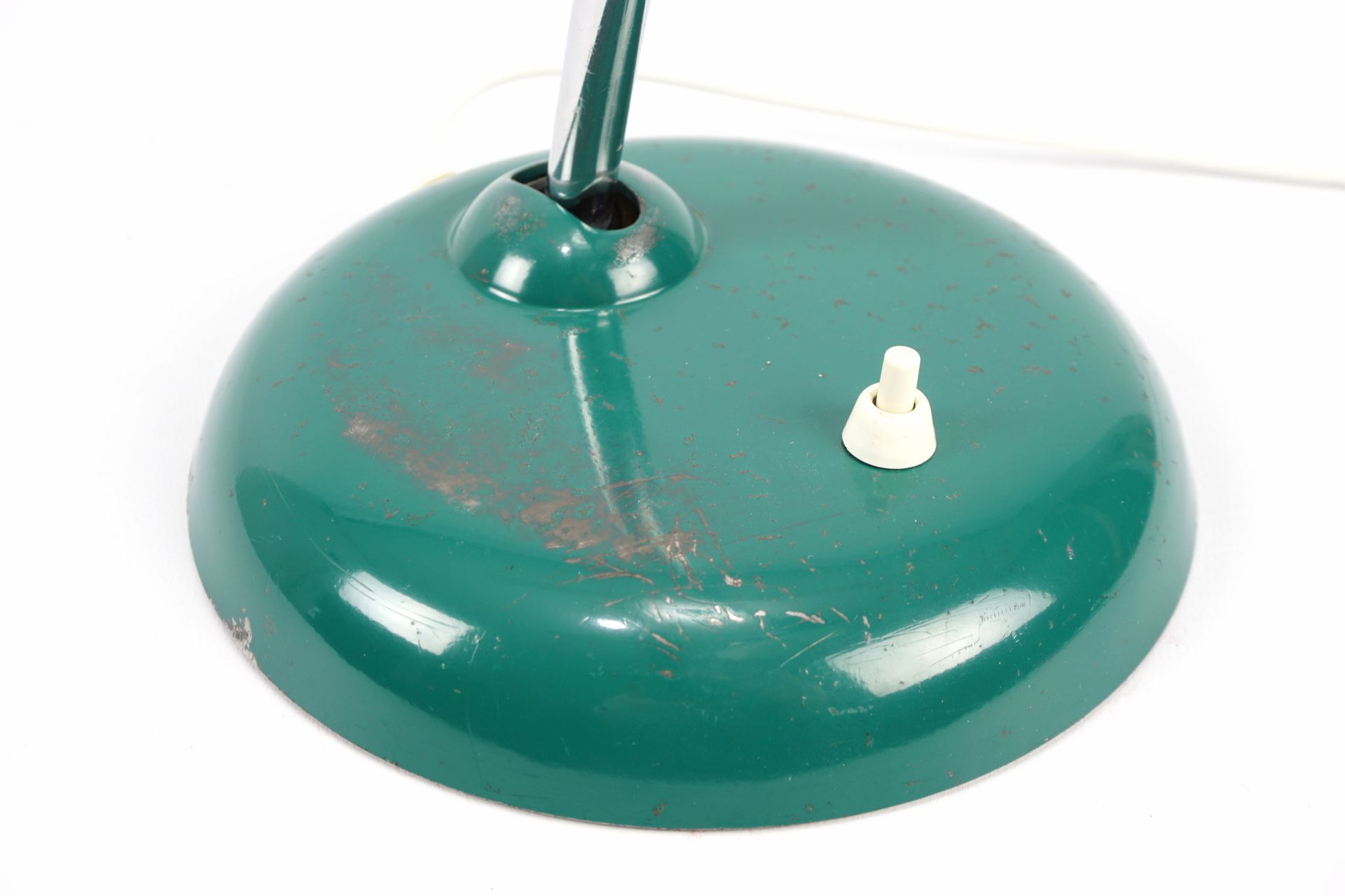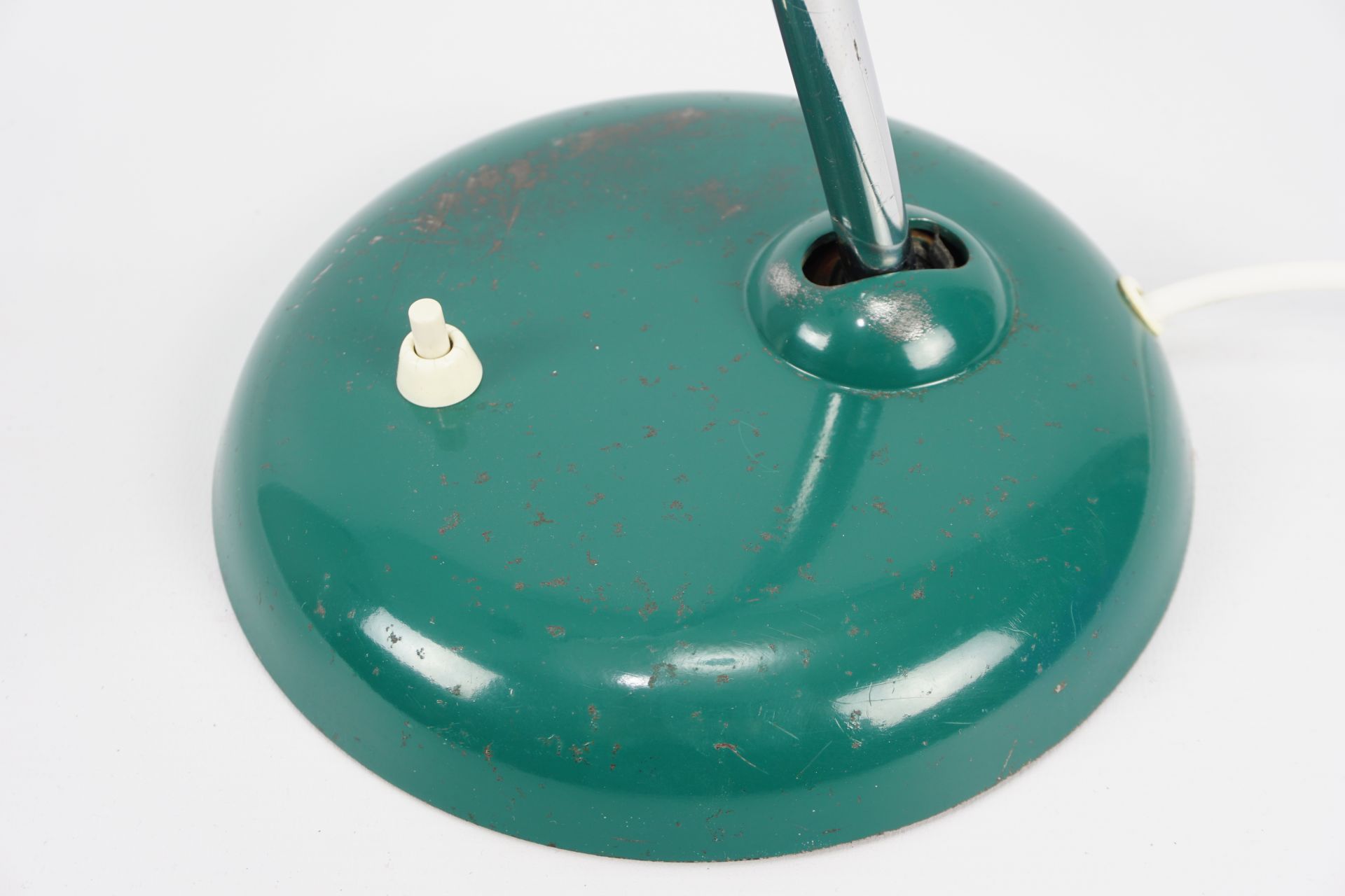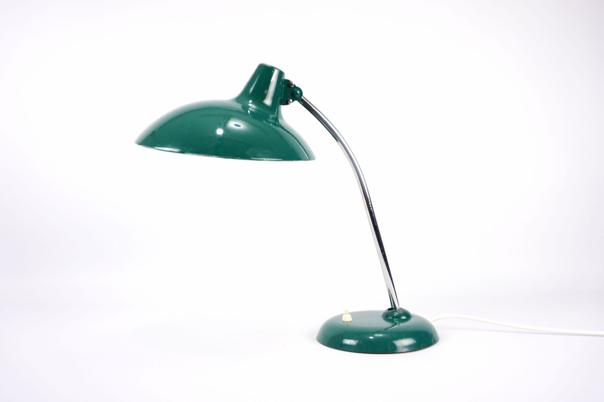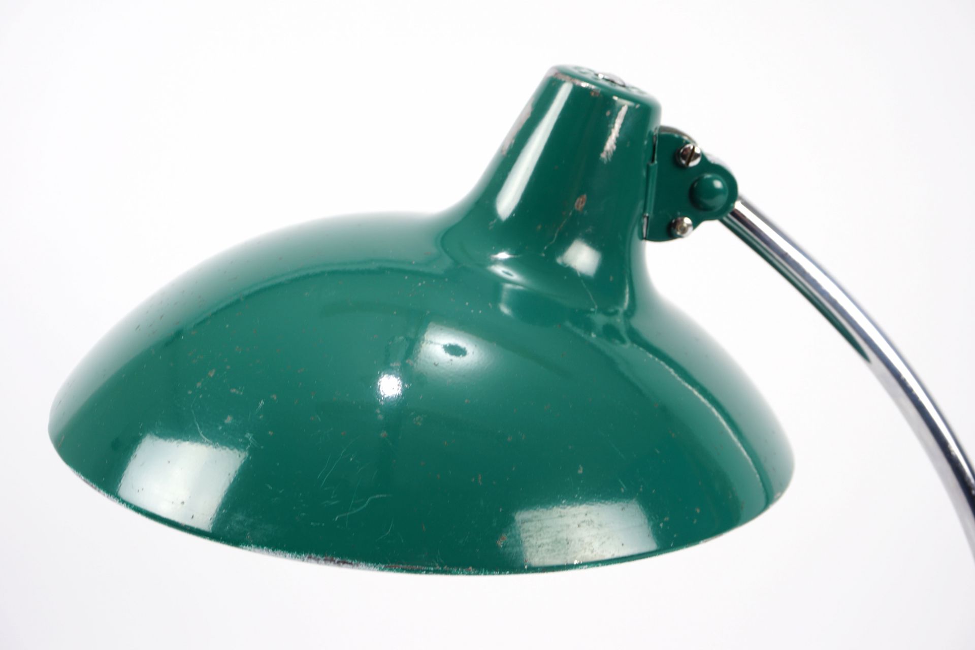 Modell Kaiser Idell 6786. Bei dem Modell ist der Arm verchromt, und der einteilige Schirm und Fuß im Farbton "Elbgrün" lackiert.