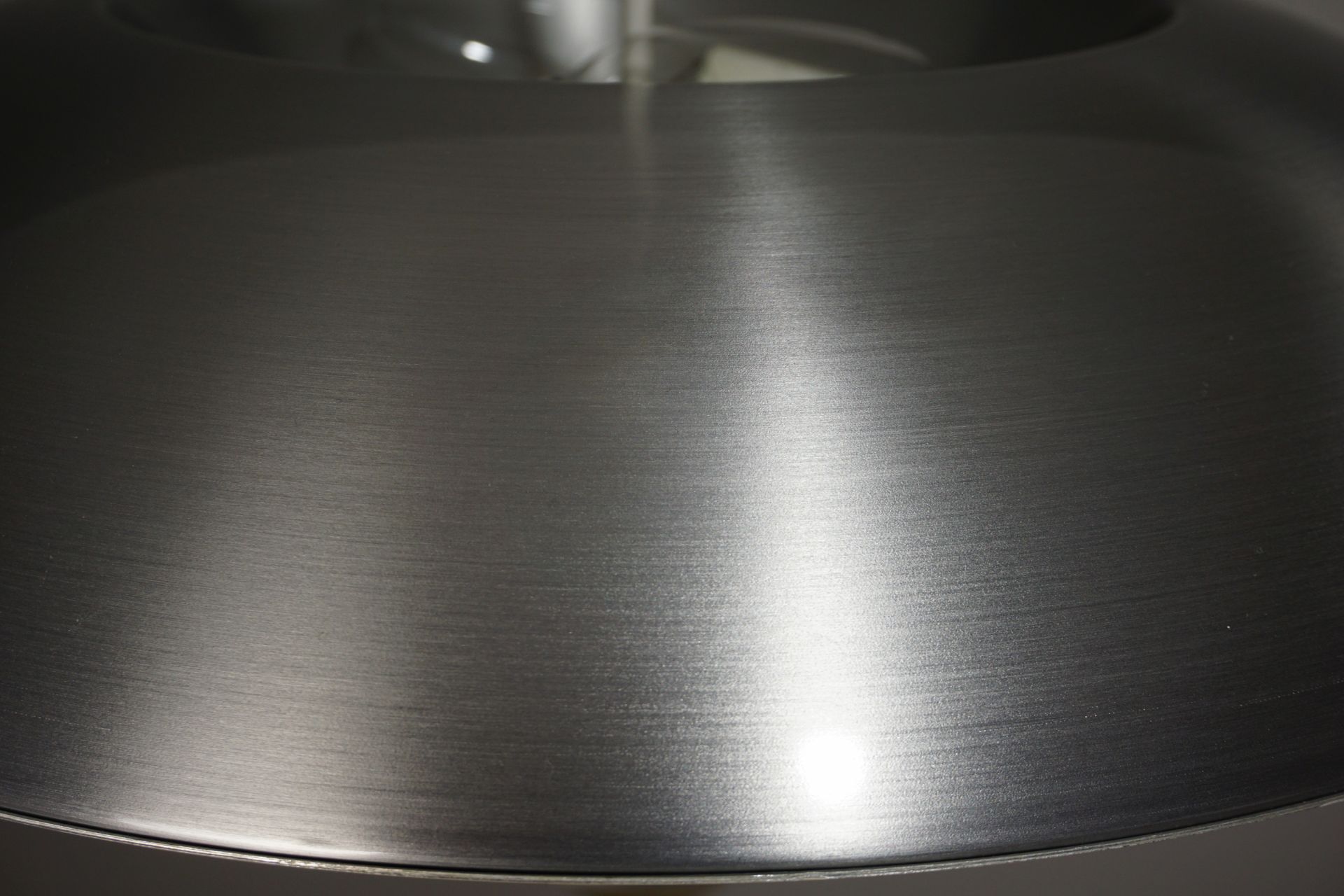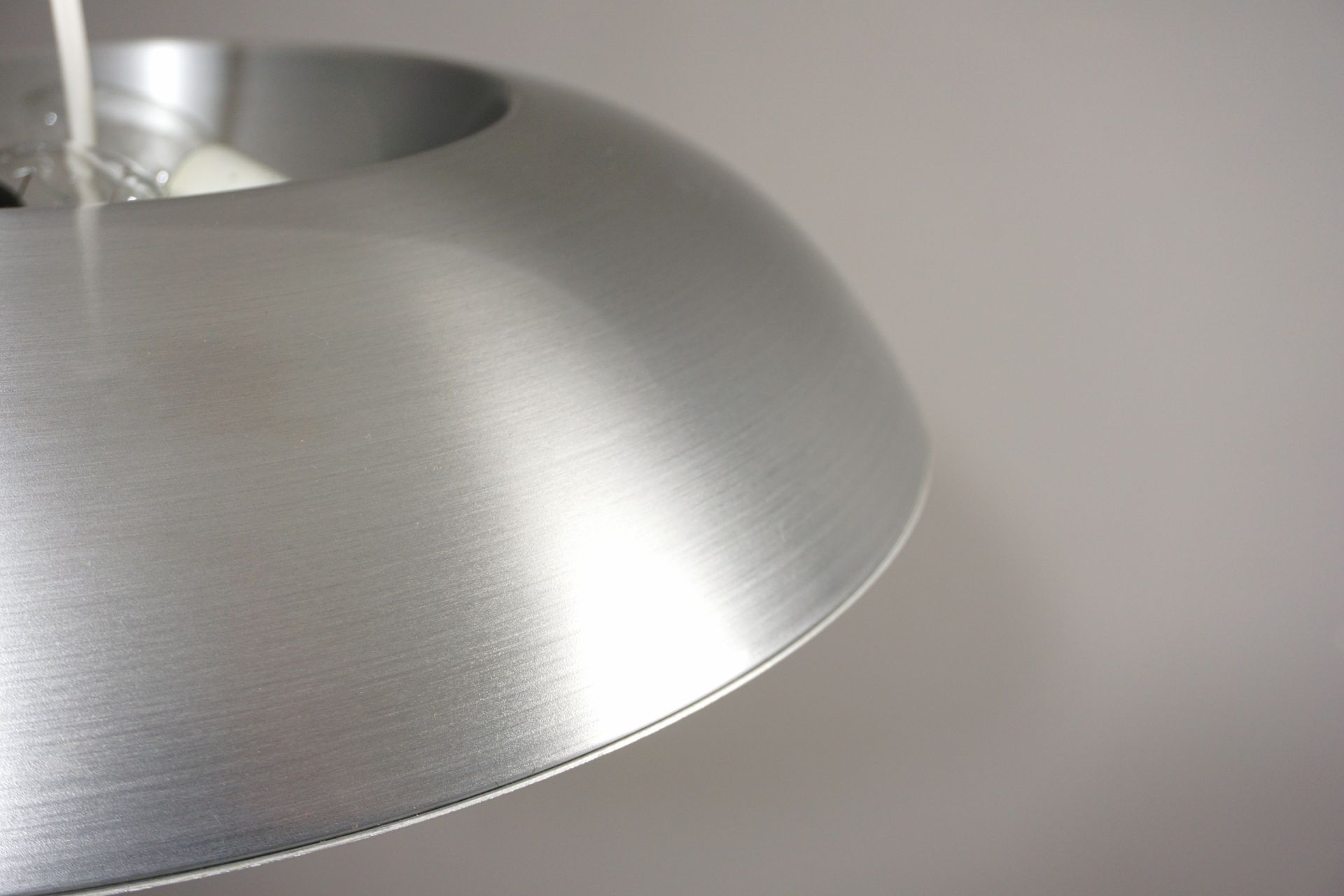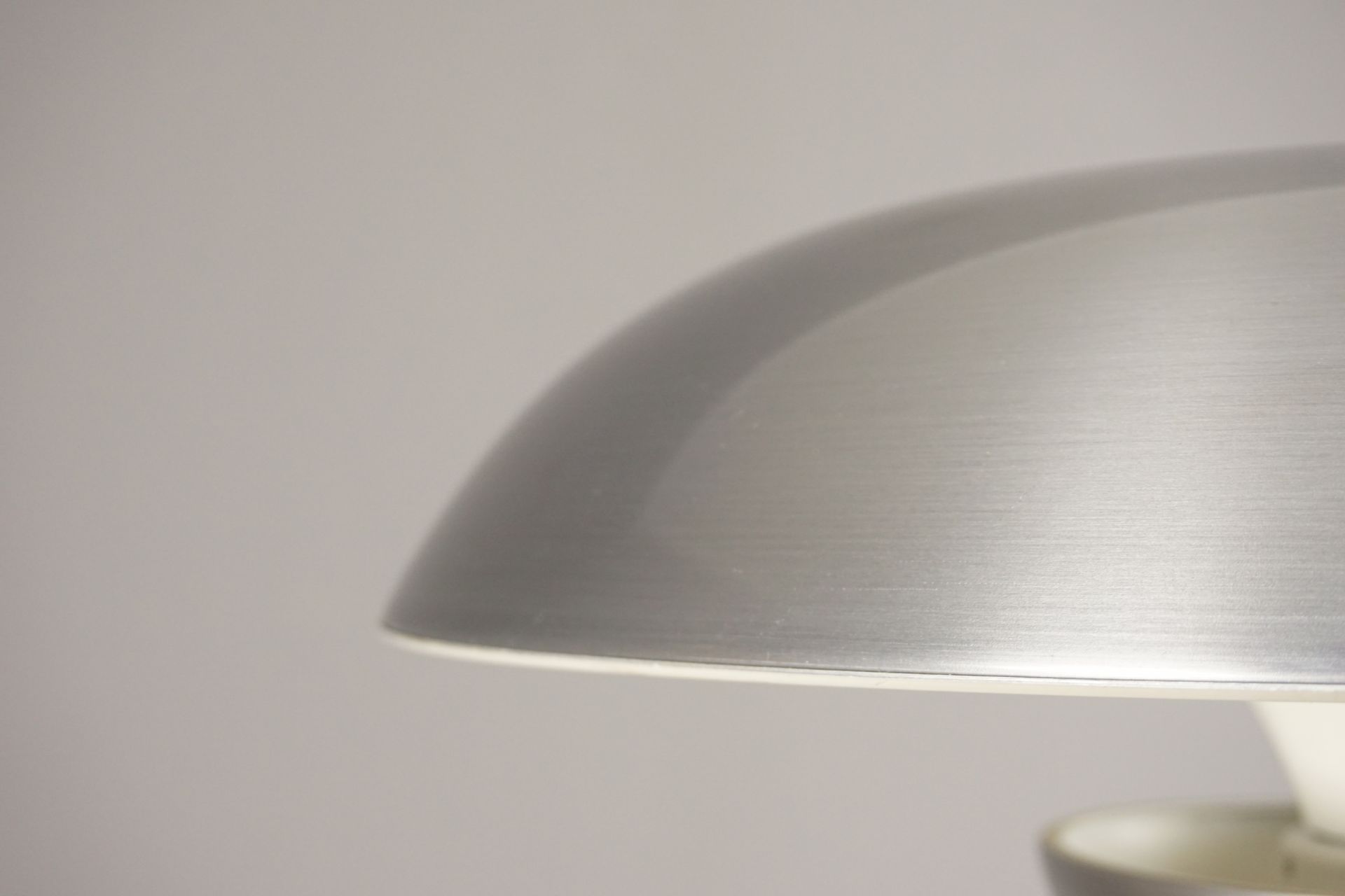 Einem Ober- und Unterschirm aus radial gebürstetem Aluminium, sowie einem Innenschirm aus cremeweißen Alu.